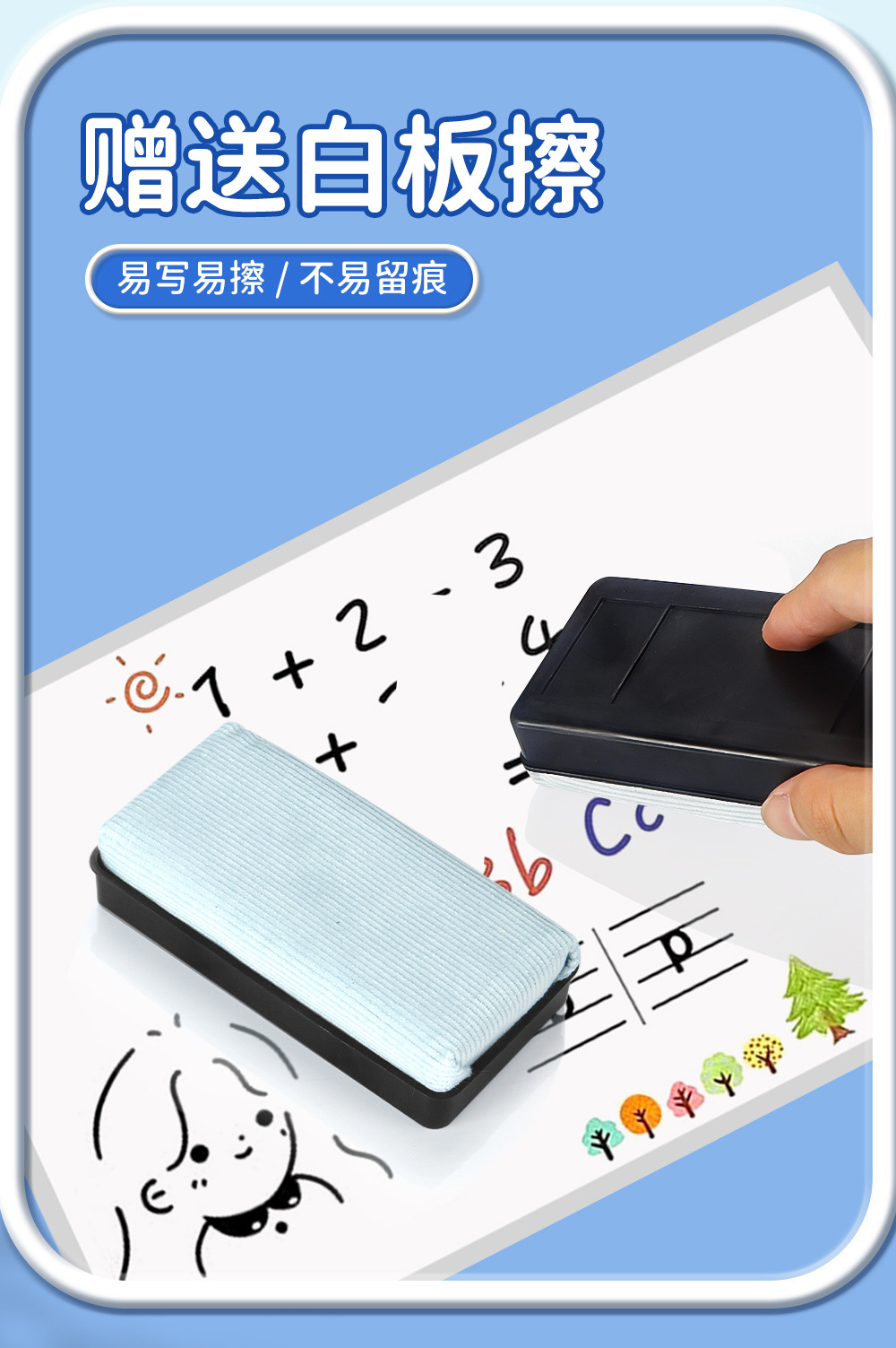 | Color de la pluma | 2 + 1 con borrador de pizarra, 2 con tarjeta de succión, 3 con tarjeta de succión, 3 + 1 con borrador de pizarra, 12 con (4 azul, 4 rojo y 4 verde) |