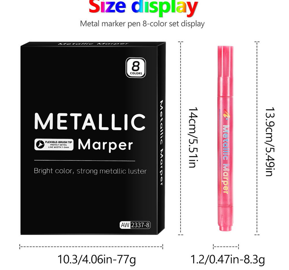 | Especificaciones | 8 colores / caja, naranja, rosa, oro, plata, bronce, verde, azul, púrpura |