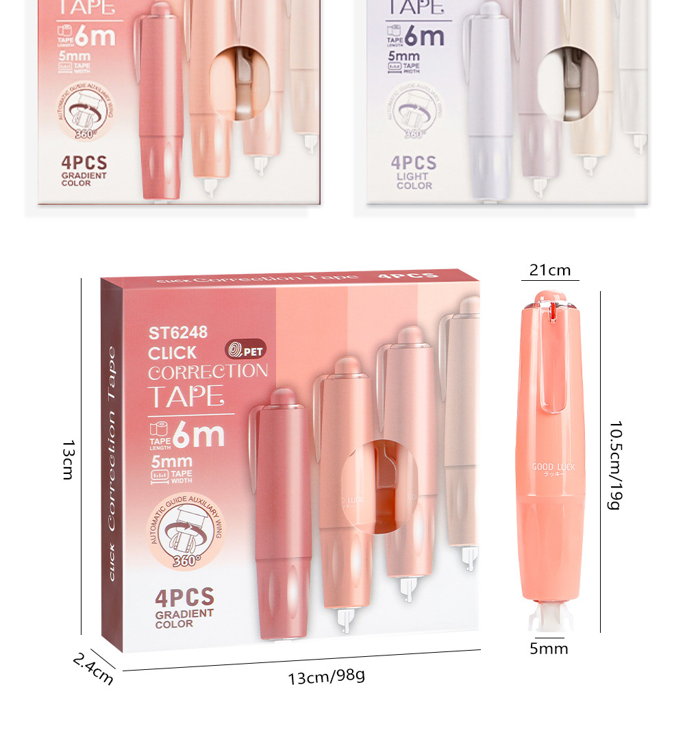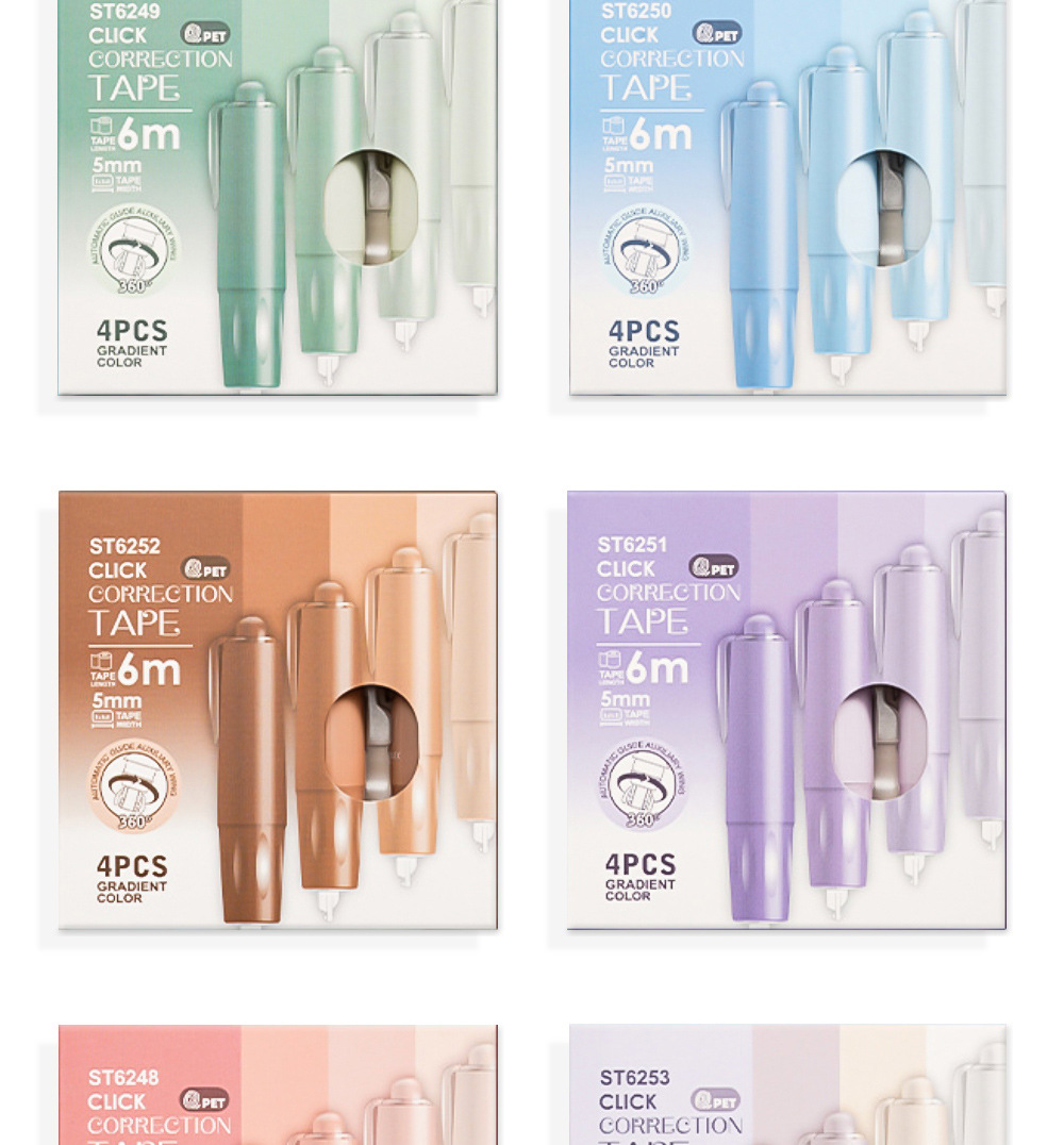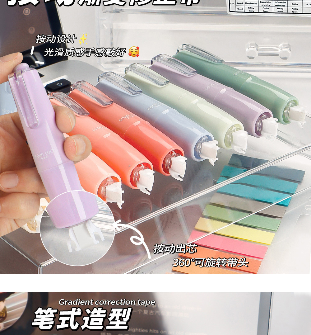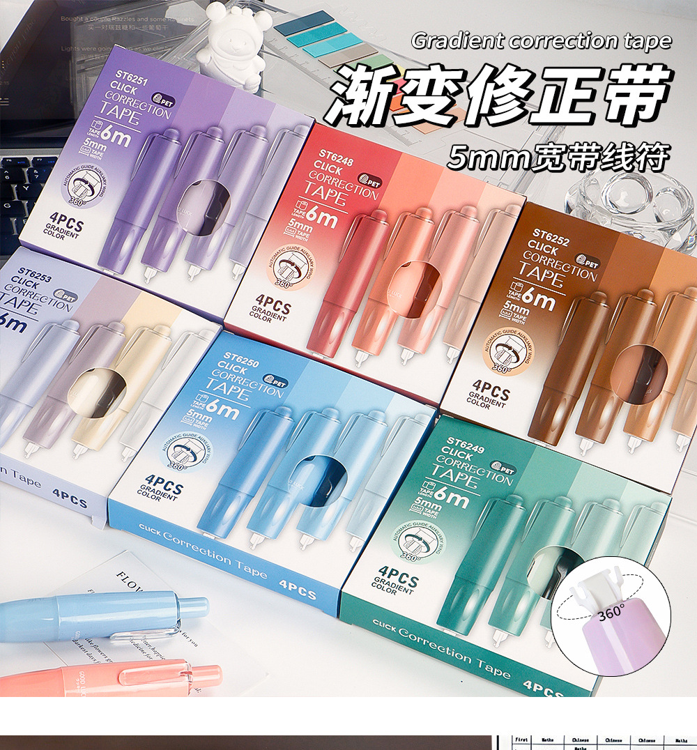 Presione el traje de cinta correctora de lápiz de liderazgo giratorio, cinta correctora de color degradado de alto valor para estudiantes, cinta correctora de núcleo intercambiable