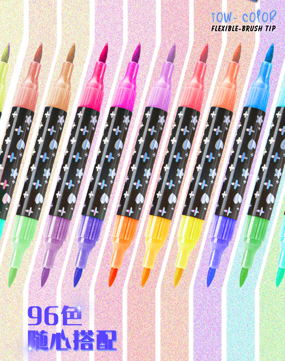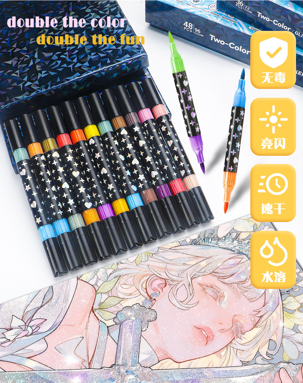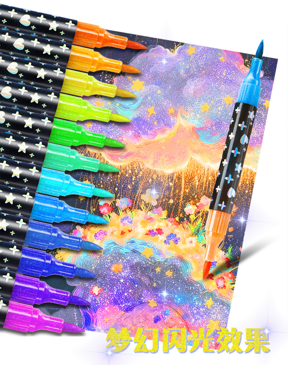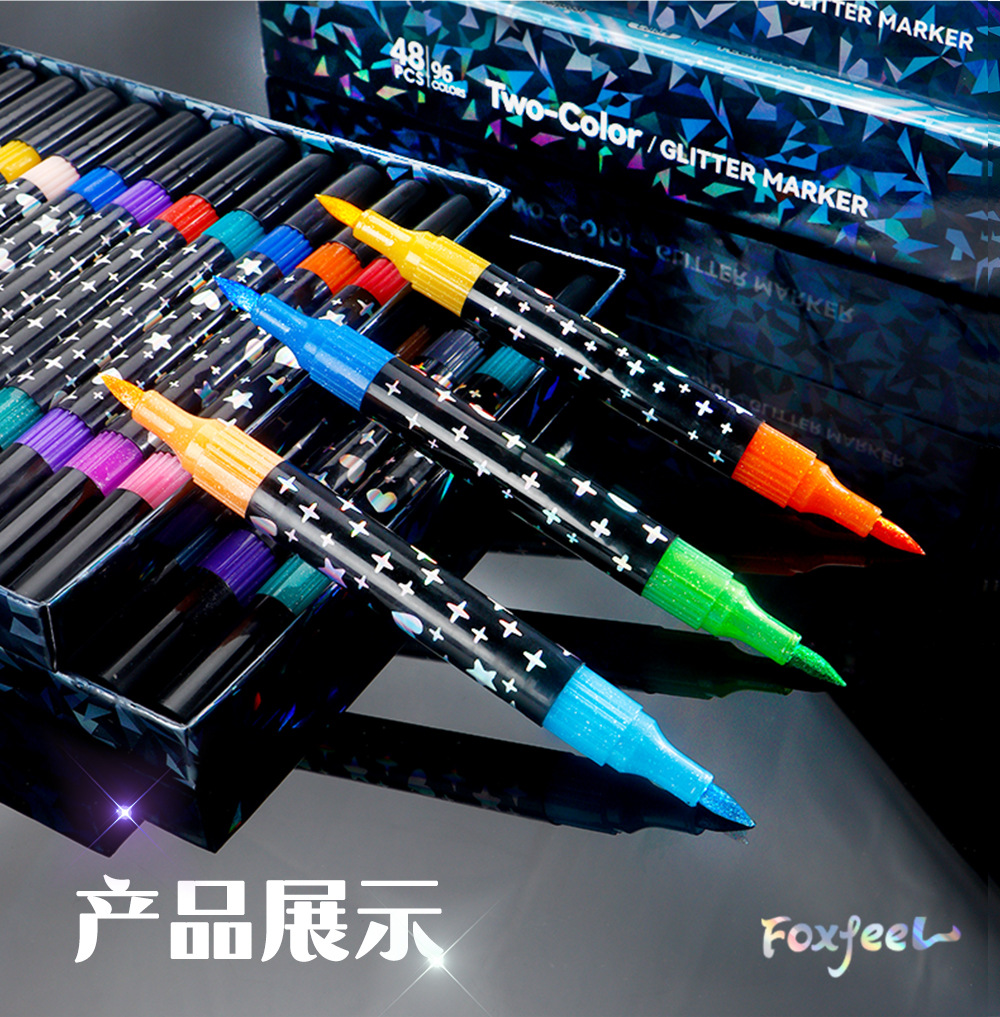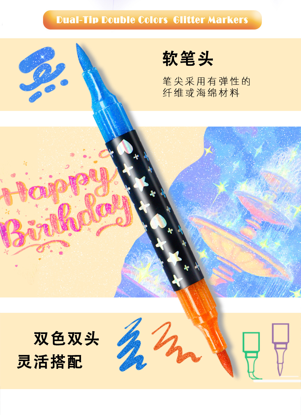 Bolígrafo de doble color de doble cabeza de explosión transfronteriza conjunto de bolígrafo de marca de cabeza suave para pintura con polvo de brillo de perlas