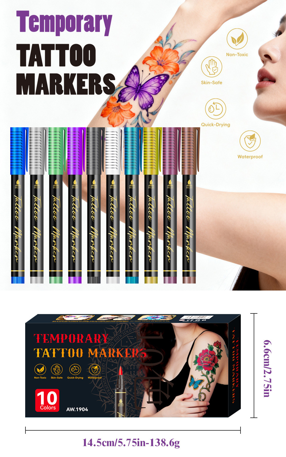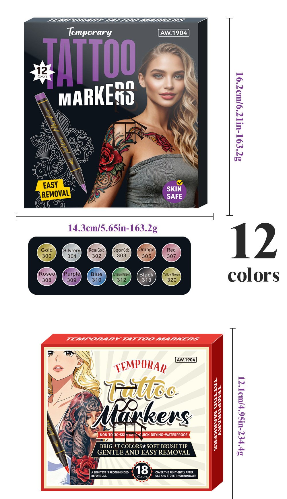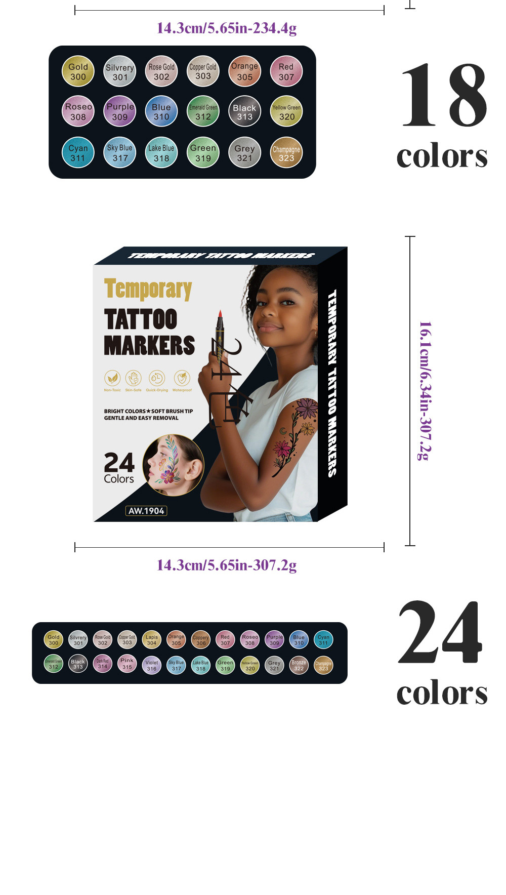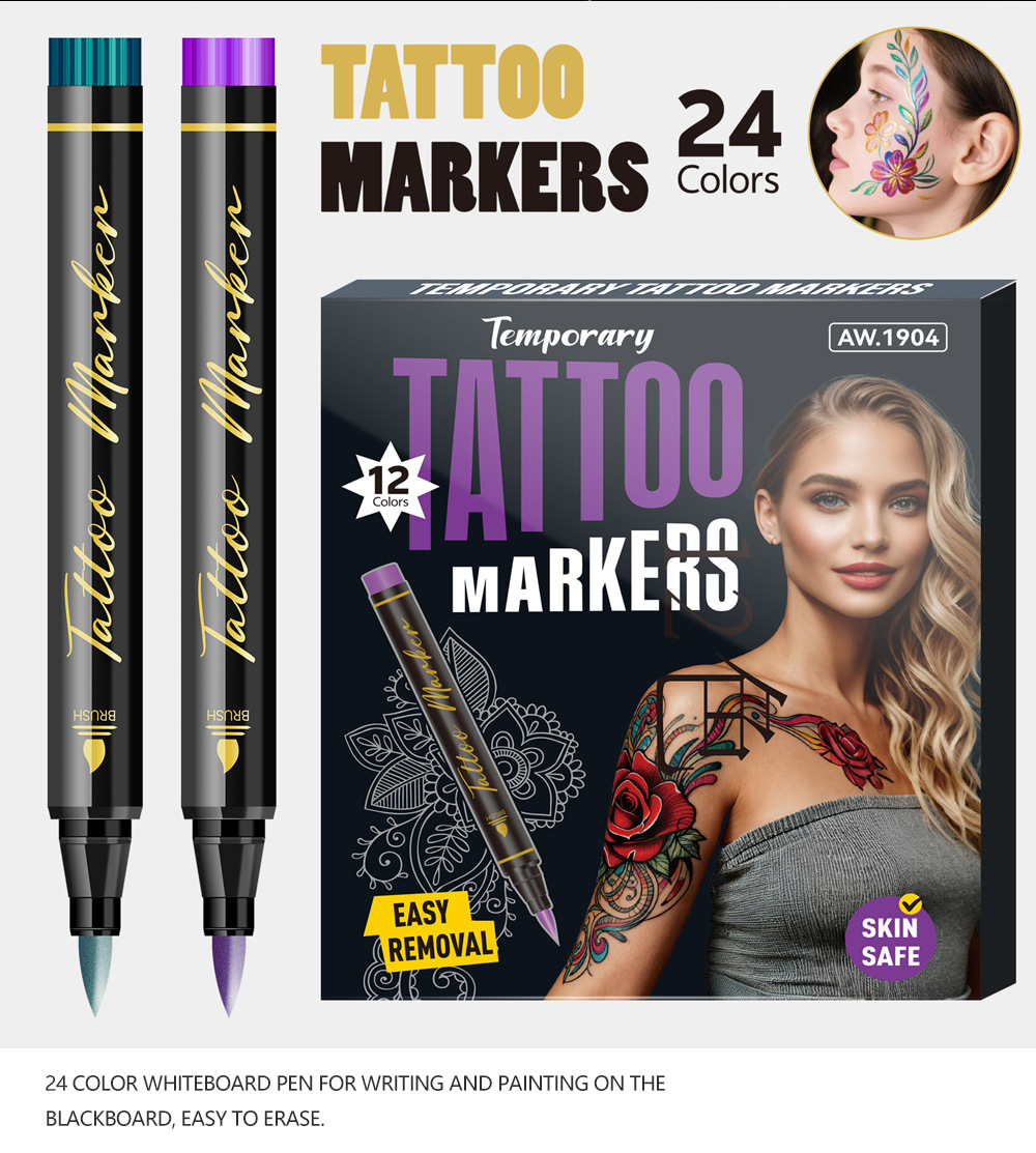 | Especificaciones | Traje de 10 colores [tatuaje de fiesta], traje de 12 colores [tatuaje de fiesta], traje de 18 colores [tatuaje de fiesta], traje de 24 colores [tatuaje de fiesta], pegatinas de tatuajes (10 al azar) |
