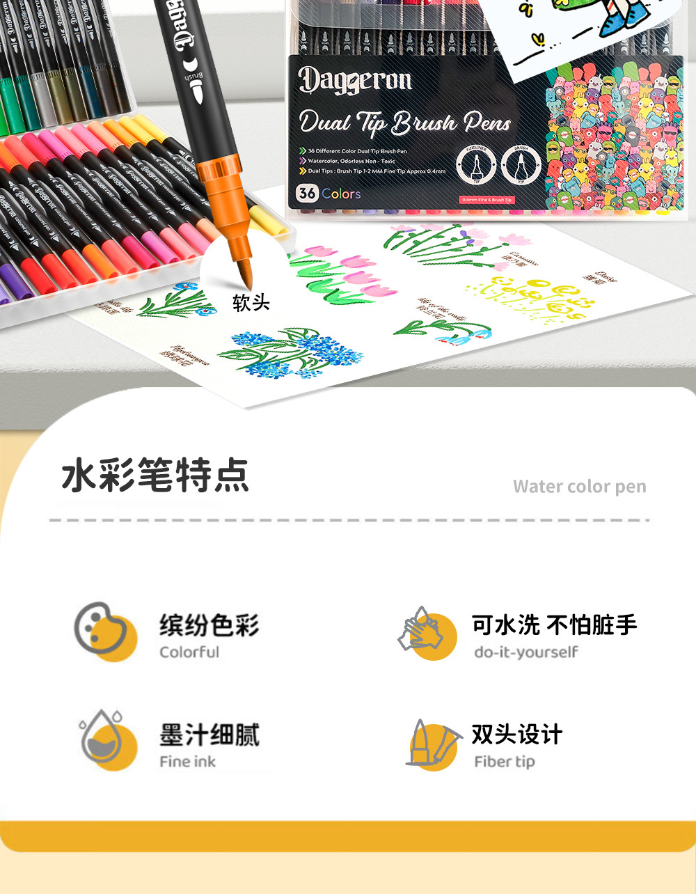 Juego de bolígrafos de acuarela de dos cabezas, bolígrafos de gancho de secado rápido a base de agua, pintura de arte para estudiantes y niños, marcadores lavables al por mayor