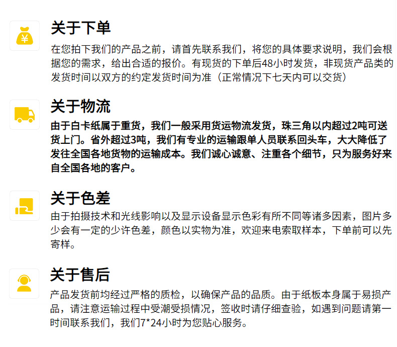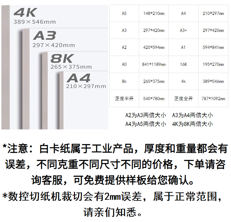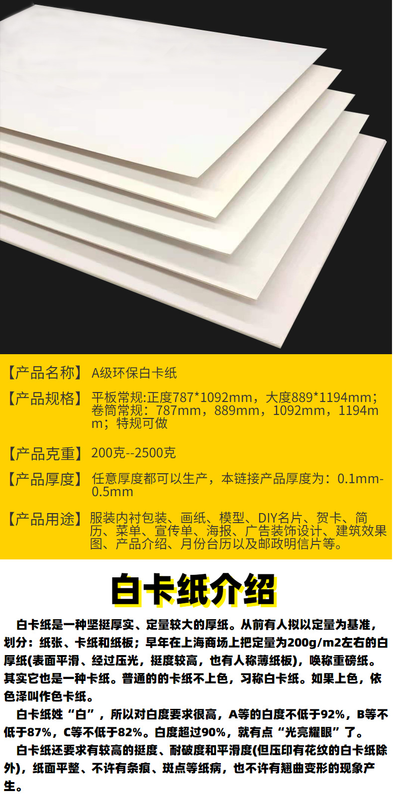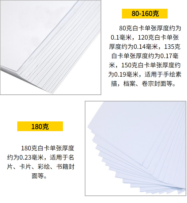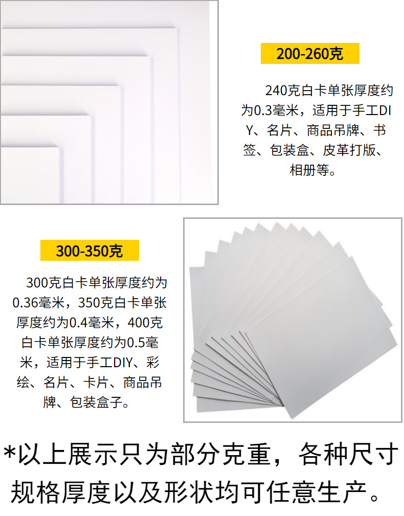 | Gramos de peso | 0.26mm 200g papel de cartón blanco, 0.32mm 250g papel de cartón blanco, 0.4mm 300g papel de cartón blanco, 0.45mm 350g papel de cartón blanco, 0.5mm 400g papel de cartón blanco |