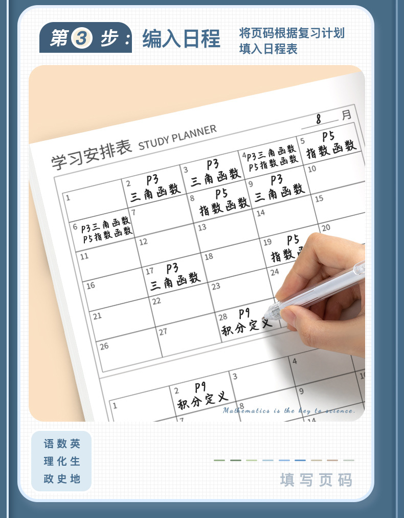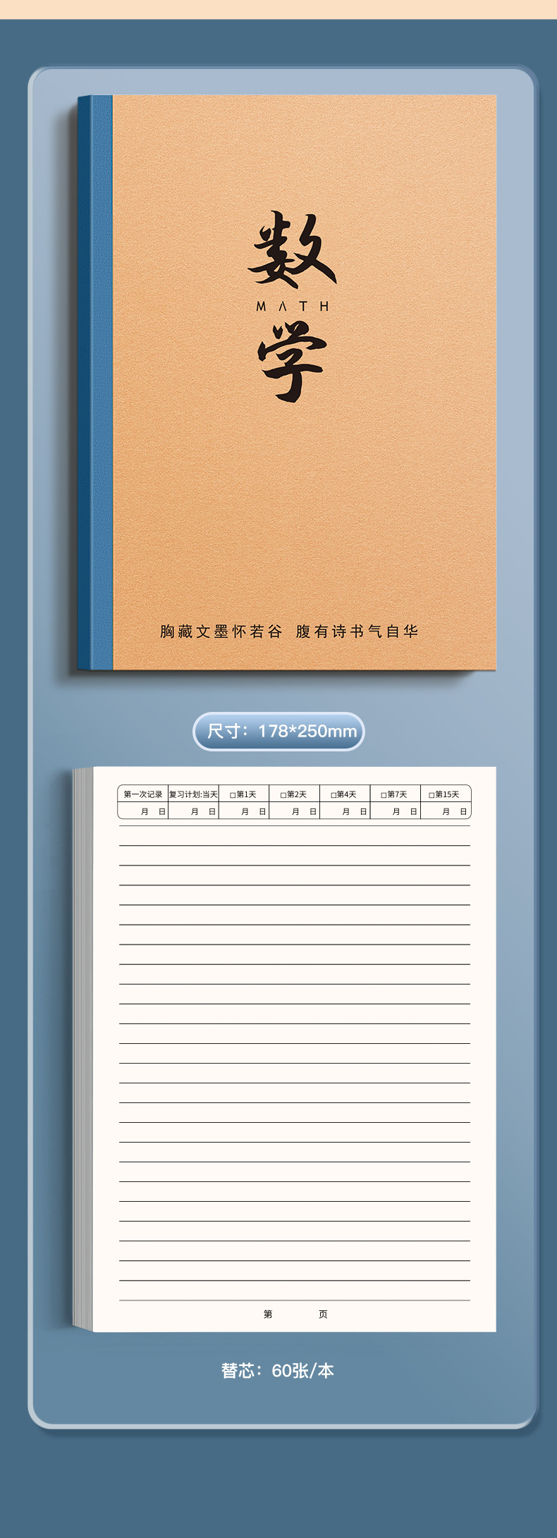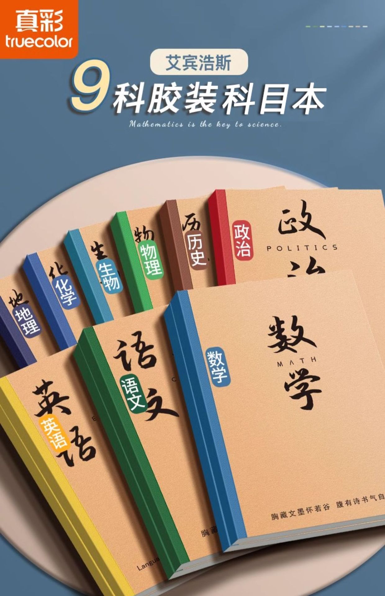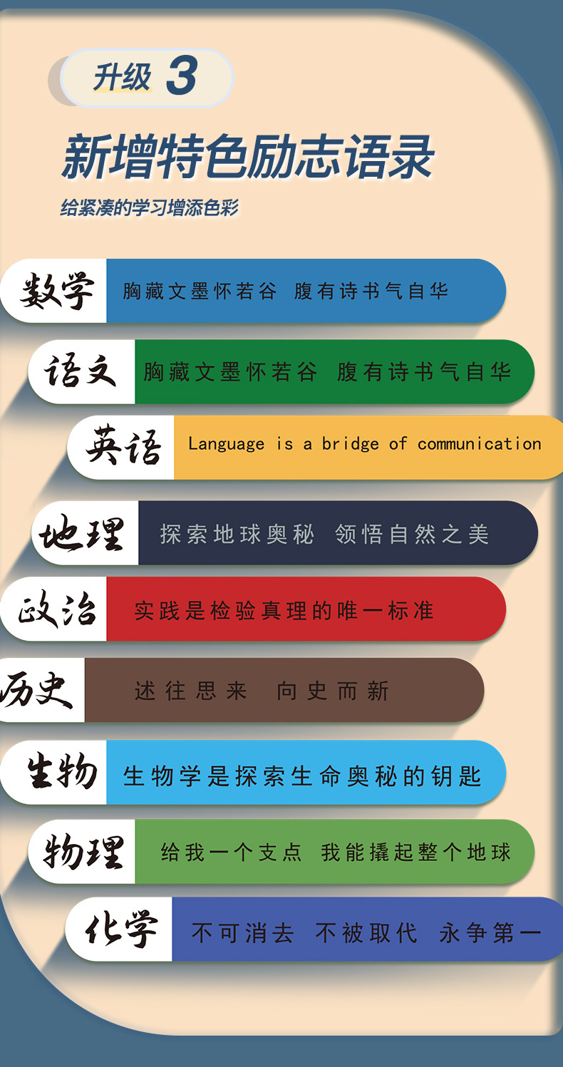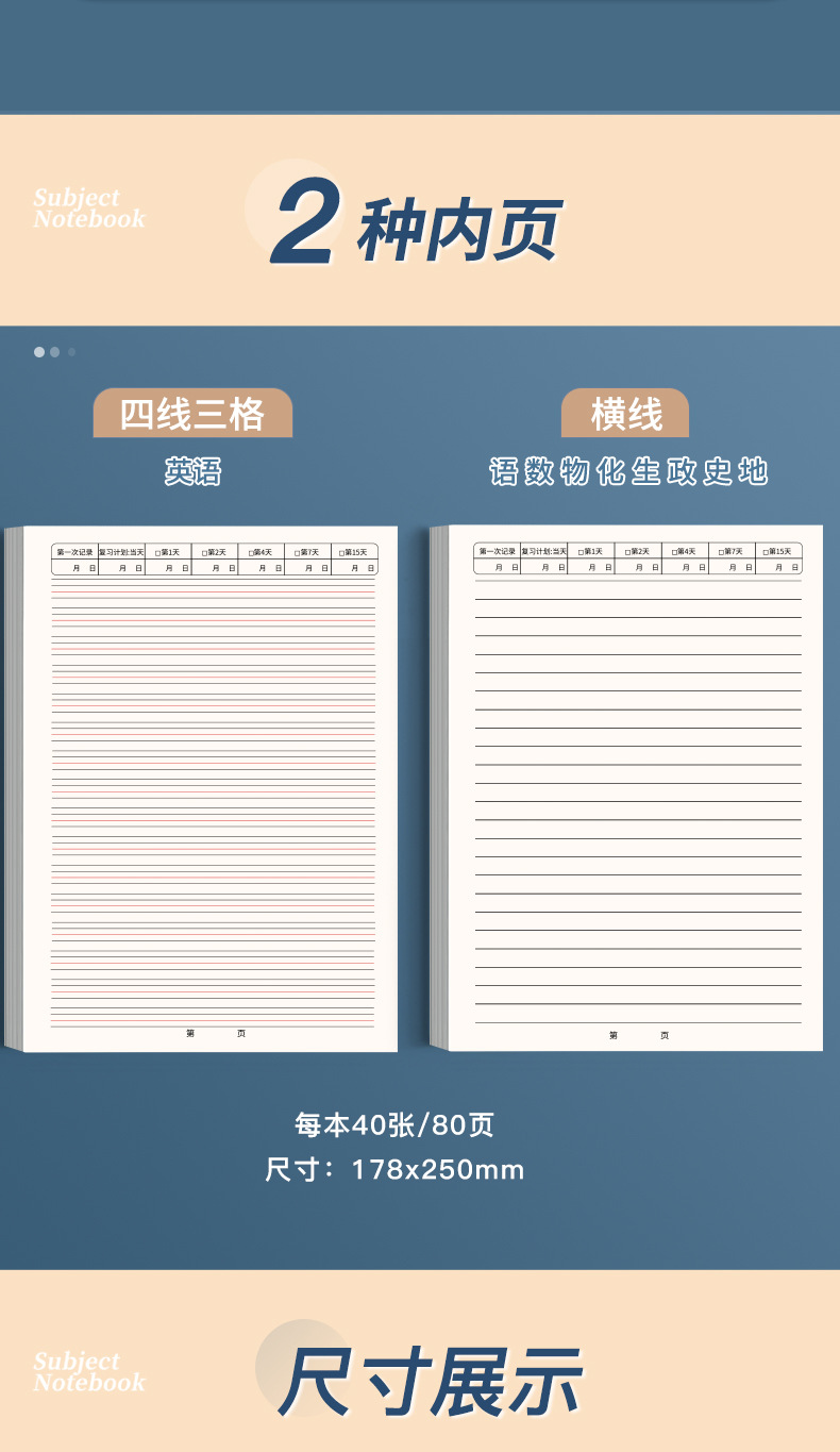 | Color de la portada | Chino / 1 libro (80 páginas cada 40), matemáticas / 1 libro (80 páginas cada 40), inglés / 1 libro (80 páginas cada 40), física / 1 libro (80 páginas cada 40), química / 1 libro (80 páginas cada 40), biología / 1 libro (80 páginas cada 40), política / 1 libro (80 páginas cada 40), historia / 1 libro (80 páginas cada 40), Geografía / 1 libro (80 páginas cada 40) |