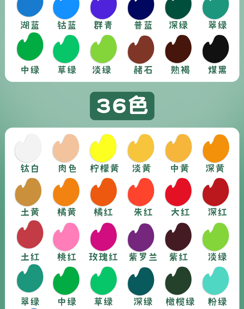 | Especificaciones | Gouache 12 colores 5ml,Acuarela 12 colores 5ml,Gouache 18 colores 5ml,Acuarela 18 colores 5ml,Gouache 24 colores 5ml,Acuarela 24 colores 5ml,12 colores de gouache 12ml (dosificación),Acuarela 12 colores 12ml (más cantidad),Gouache 18 colores 12ml (más cantidad),Acuarela 18 colores 12ml (más cantidad),Gouache 24 colores 12ml (más cantidad),Acuarela 24 colores 12ml (más cantidad),Gouache 36 colores 12ml (más cantidad),Acuarela 36 colores 12ml (más cantidad) |
