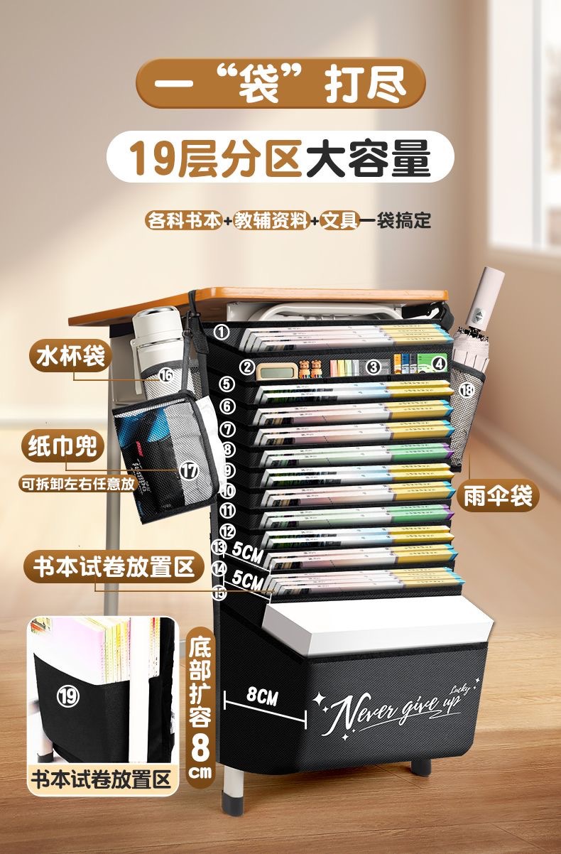 Bolsa de libro colgante de gran capacidad al lado de la mesa de escritorio para estudiantes de secundaria secundaria colgando lateralmente al lado de la mesa