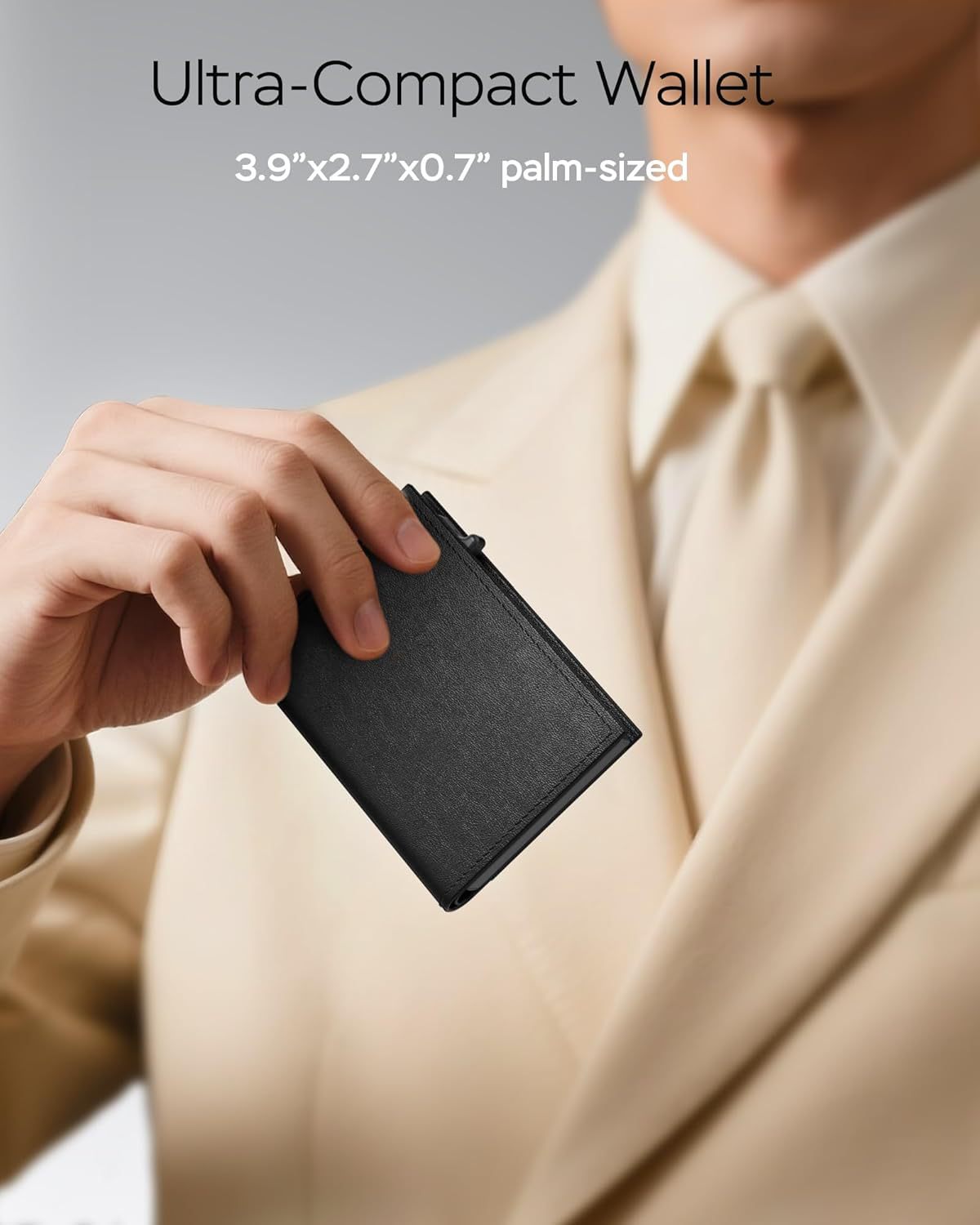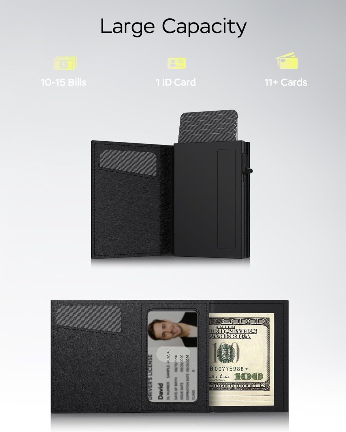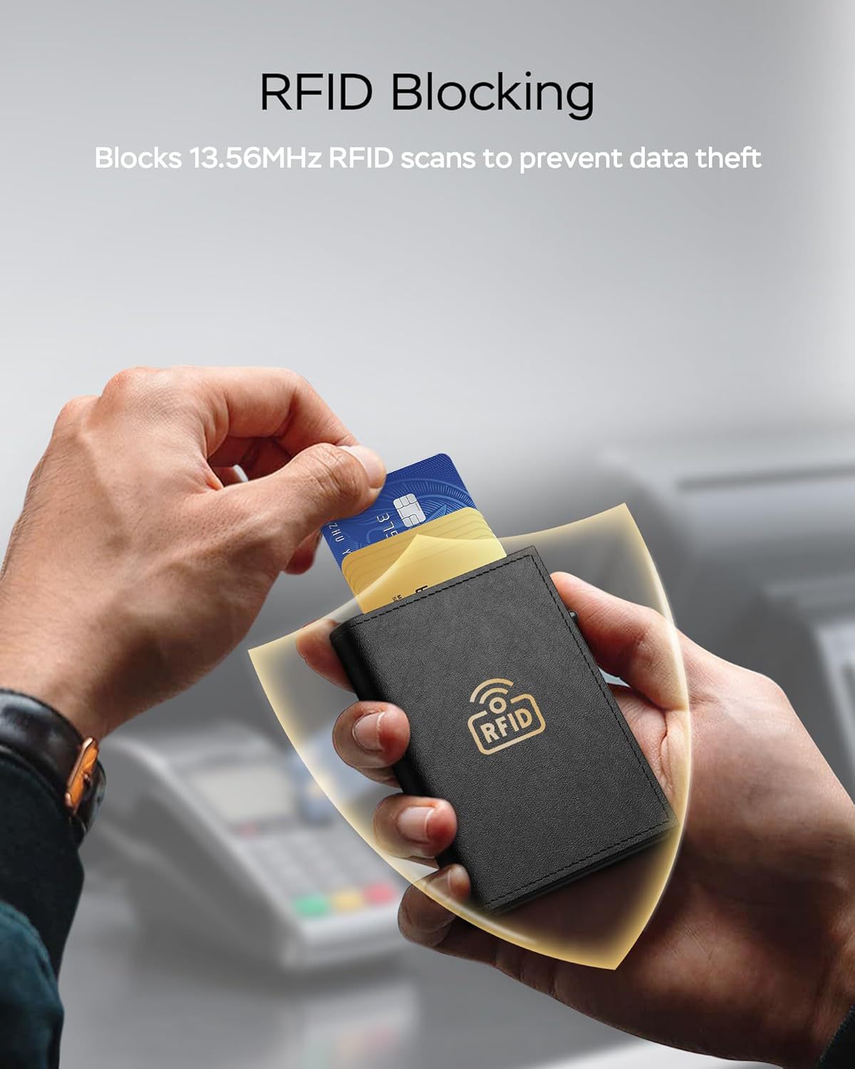 Amazon RFID blindaje bolsa de tarjetas de gran capacidad pop-up triple plegable caja de tarjetas metálicas de negocios de cuero monedero de hombre