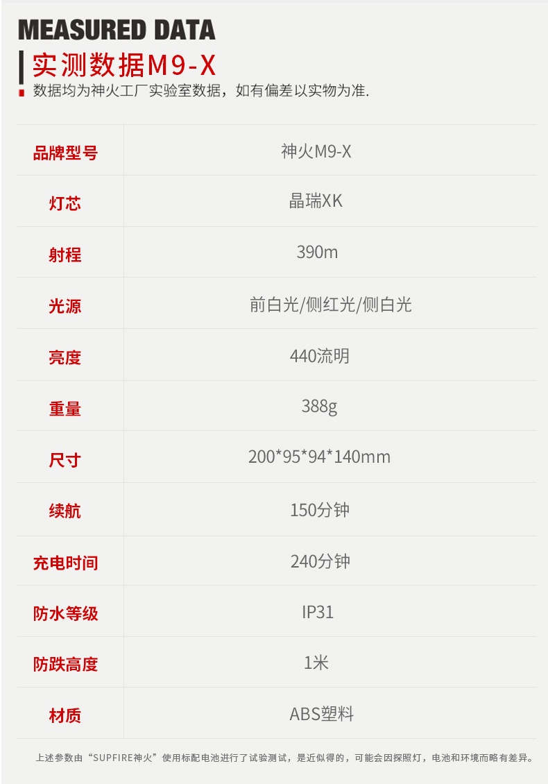 | Colores | M9-E negro (luz frontal 10W rojo y blanco doble lado)-6000mah,M15-X(3W 5.5 horas de duración de la batería),M17(5W 2400 mAh) 5 horas de duración de la batería,M9-F(5W 2400 mA) sin luz lateral,M17-A:15W 900 lúmenes de batería 6.5H,RX30-5W 230 lúmenes de duración de la batería 5H |