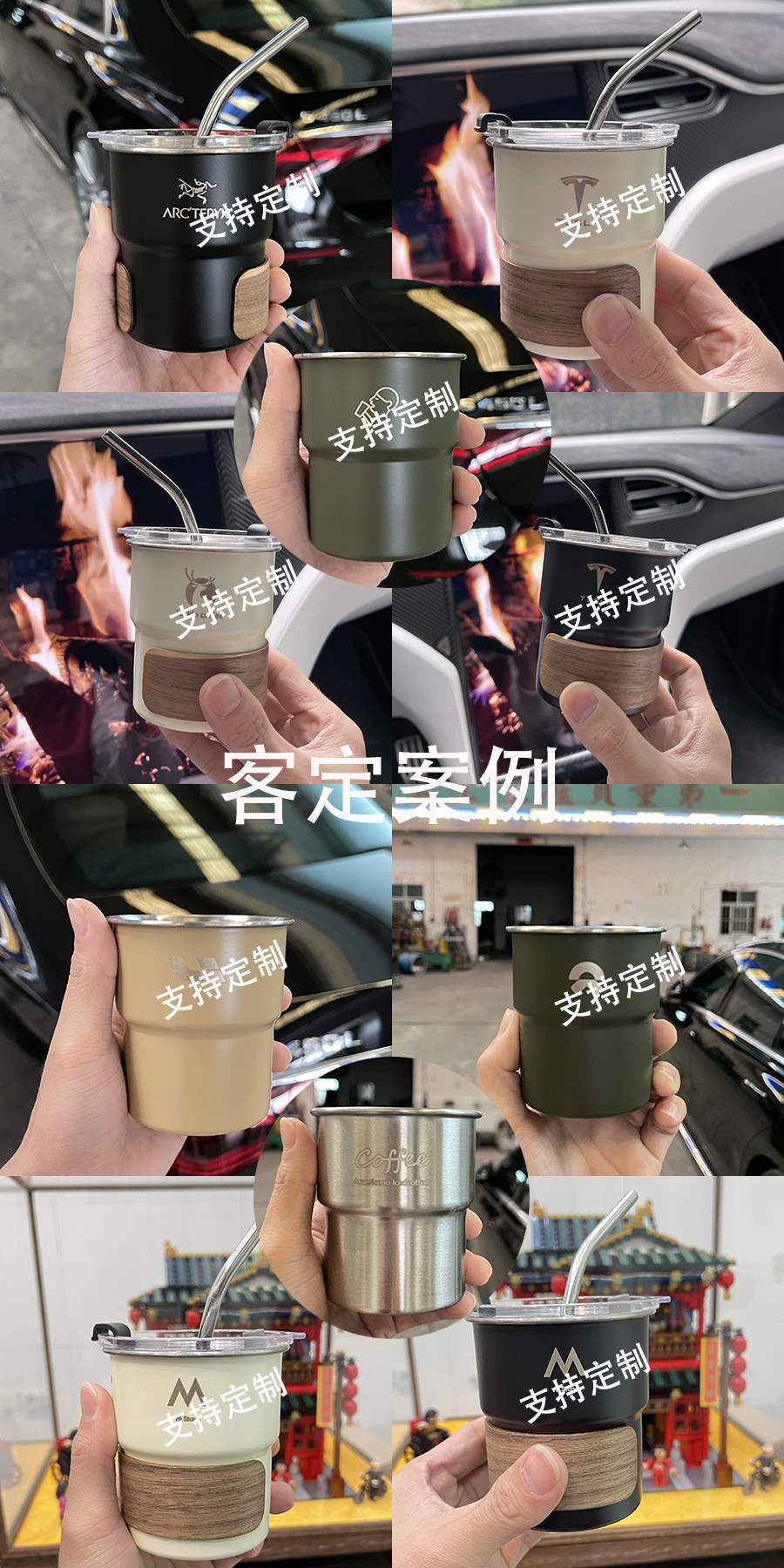 300ml taza única + tapa + pajita + funda de madera