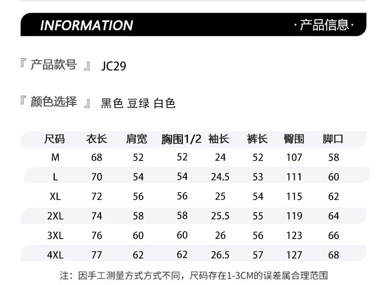 | Colores | JC29 traje negro,JC29 traje blanco,JC29 traje verde frijol |