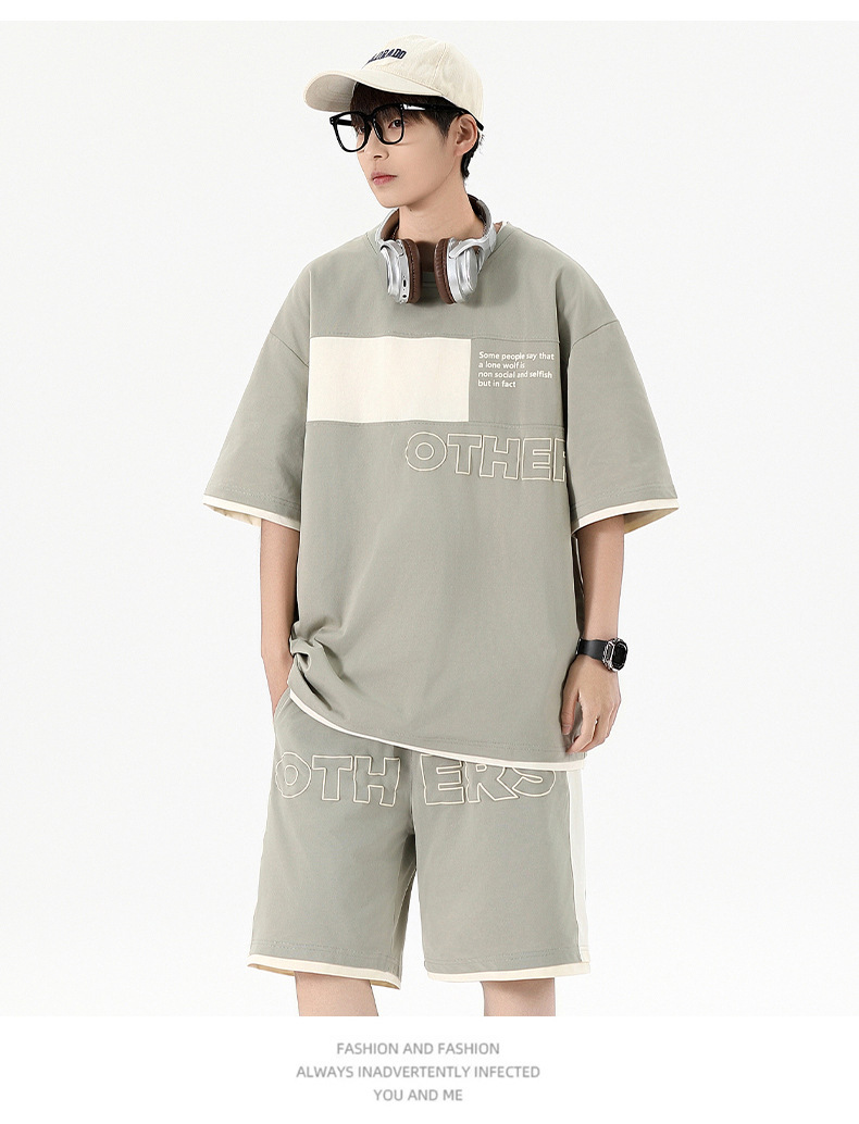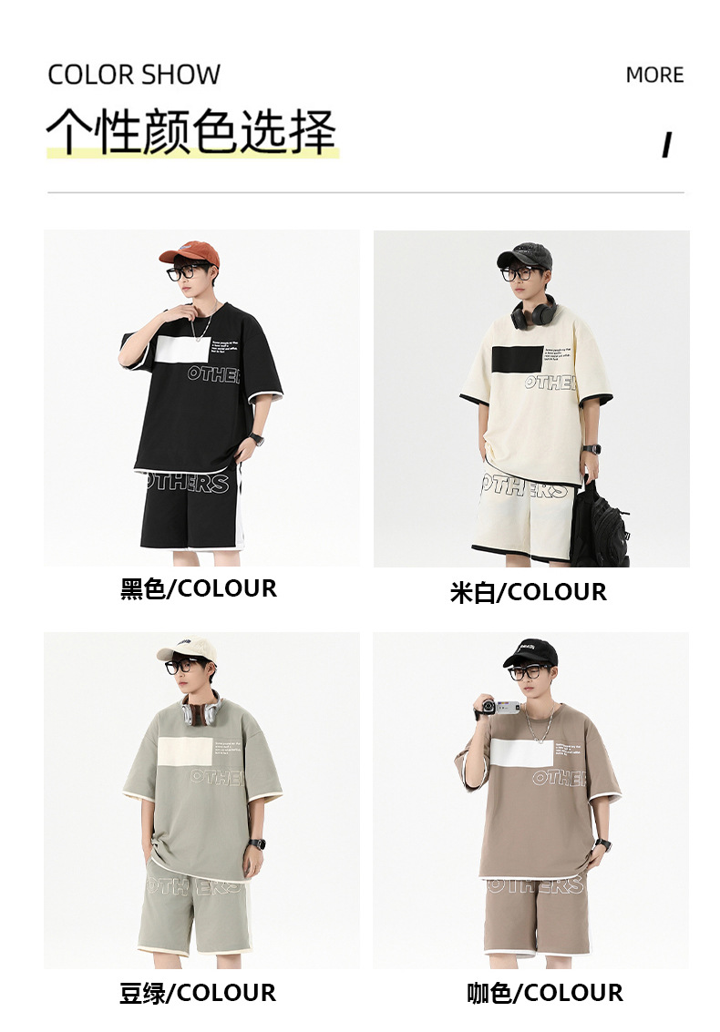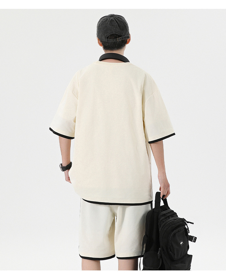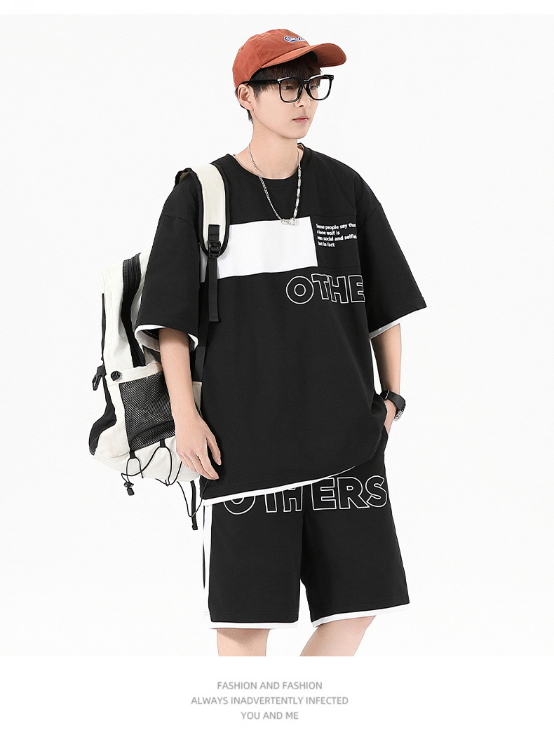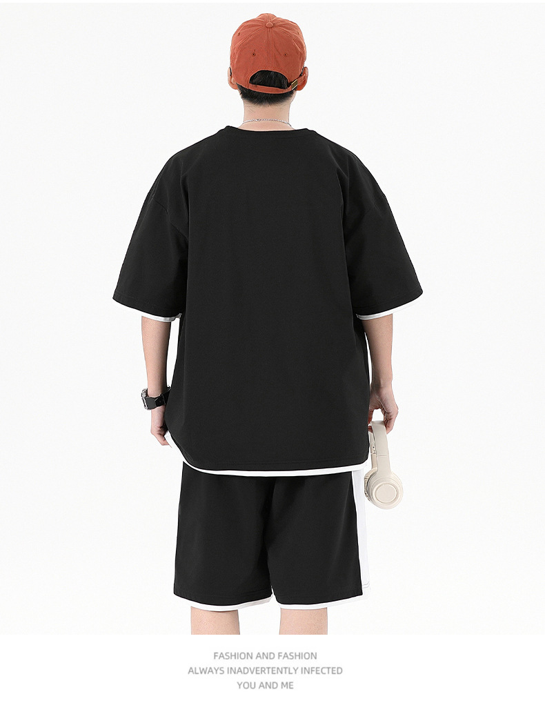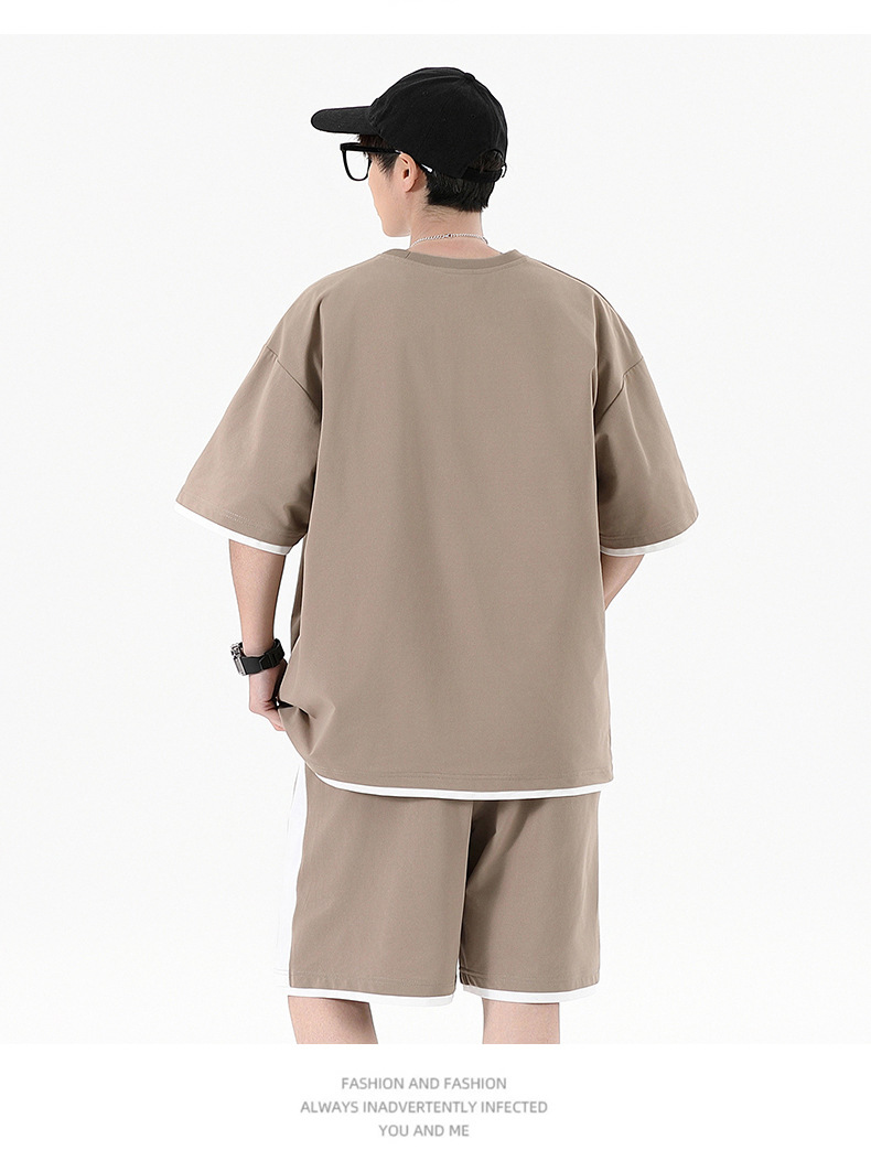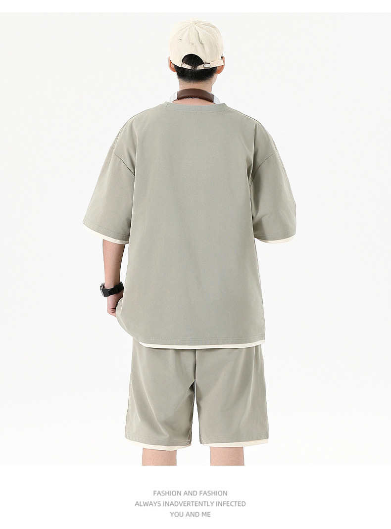 Traje informal holgado de manga corta para hombre, pantalones cortos de manga corta con conjunto de dos piezas, color contrastante, fresco, de verano