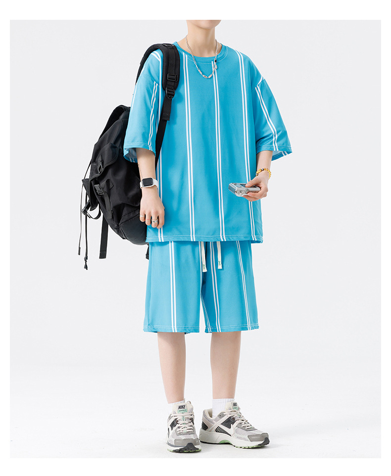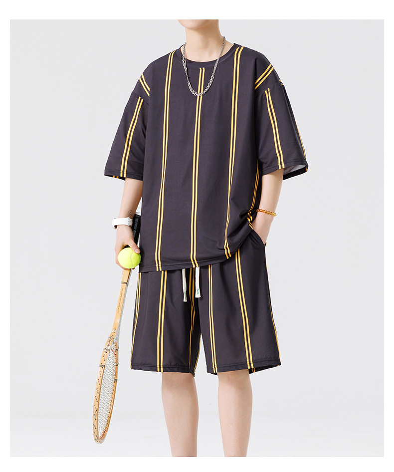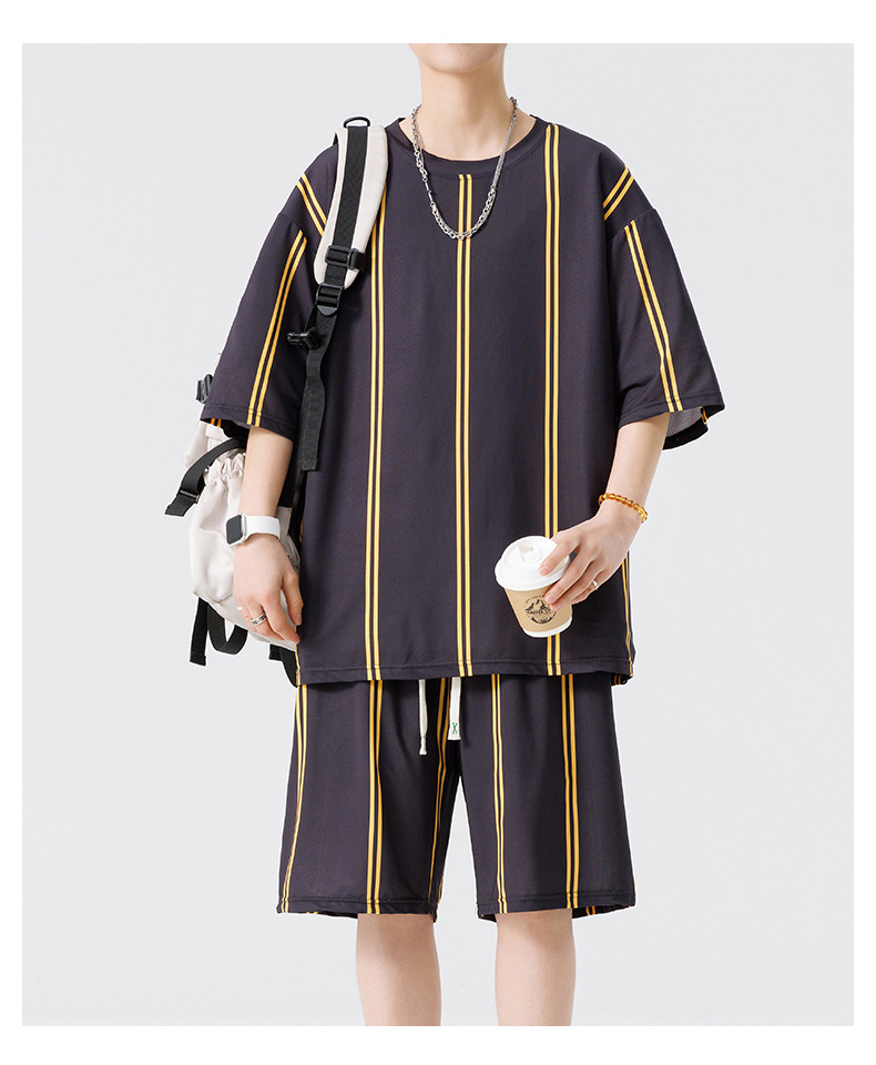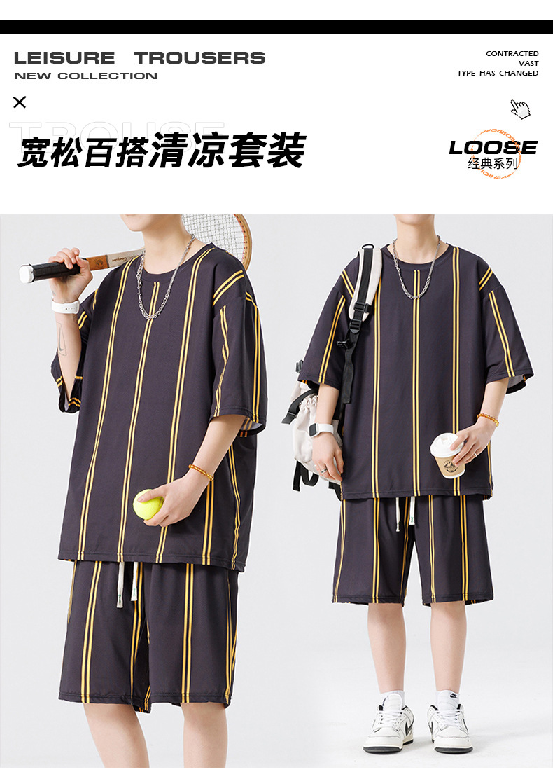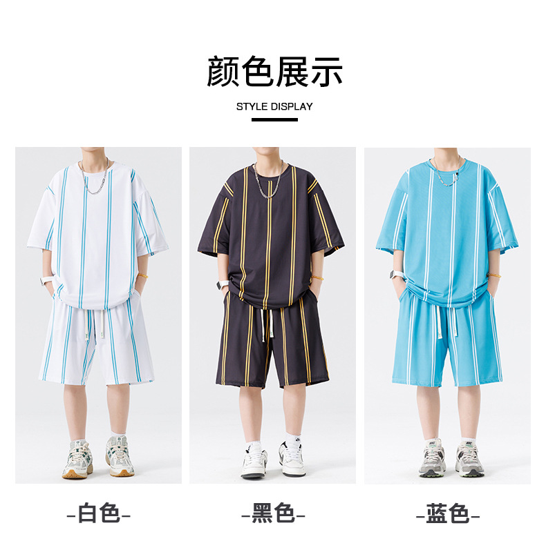 Nuevo traje de pantalones cortos de camiseta de cuello redondo con estampado a rayas de verano para adolescentes, pantalones cortos casuales de manga corta, ropa suelta para el hogar