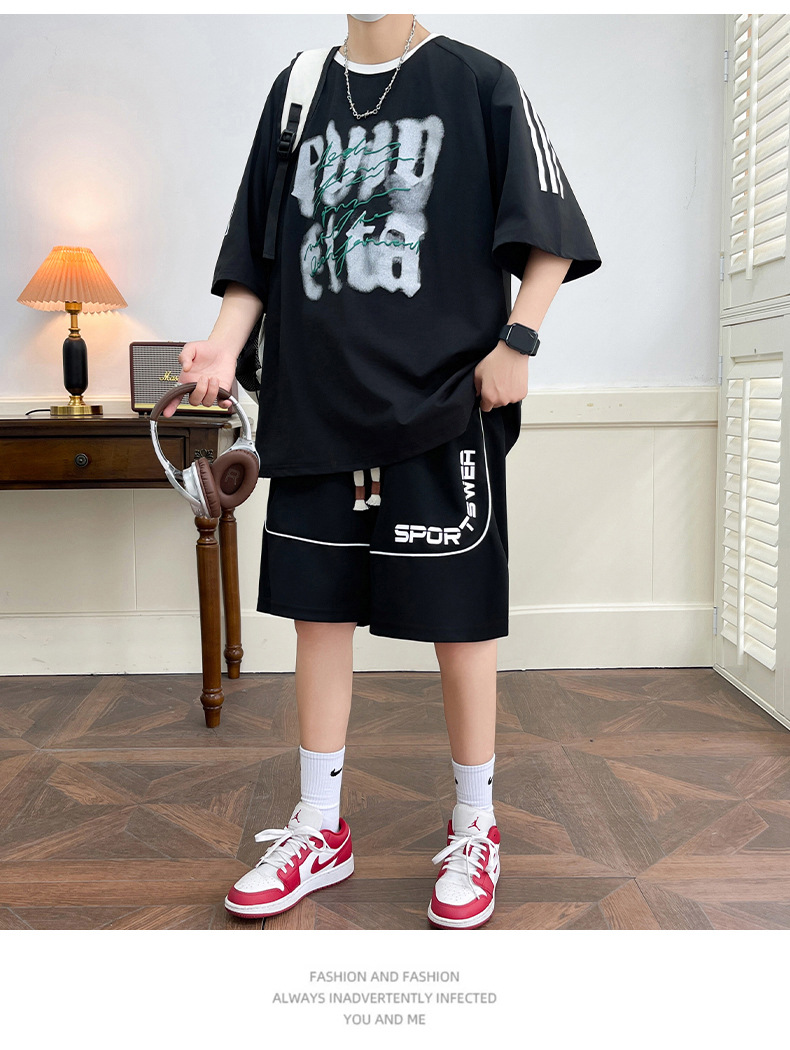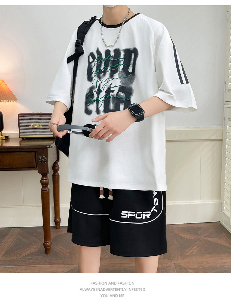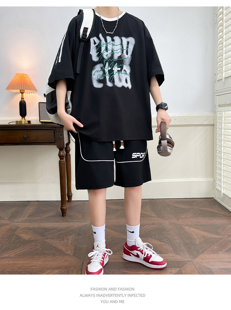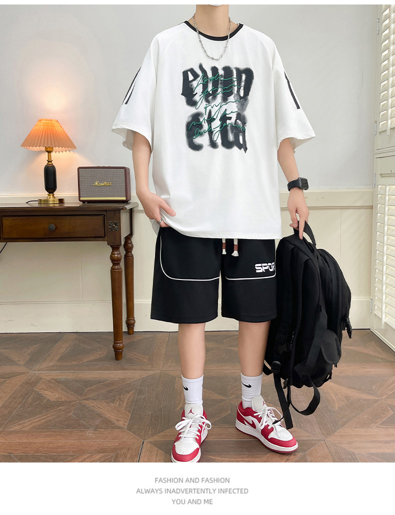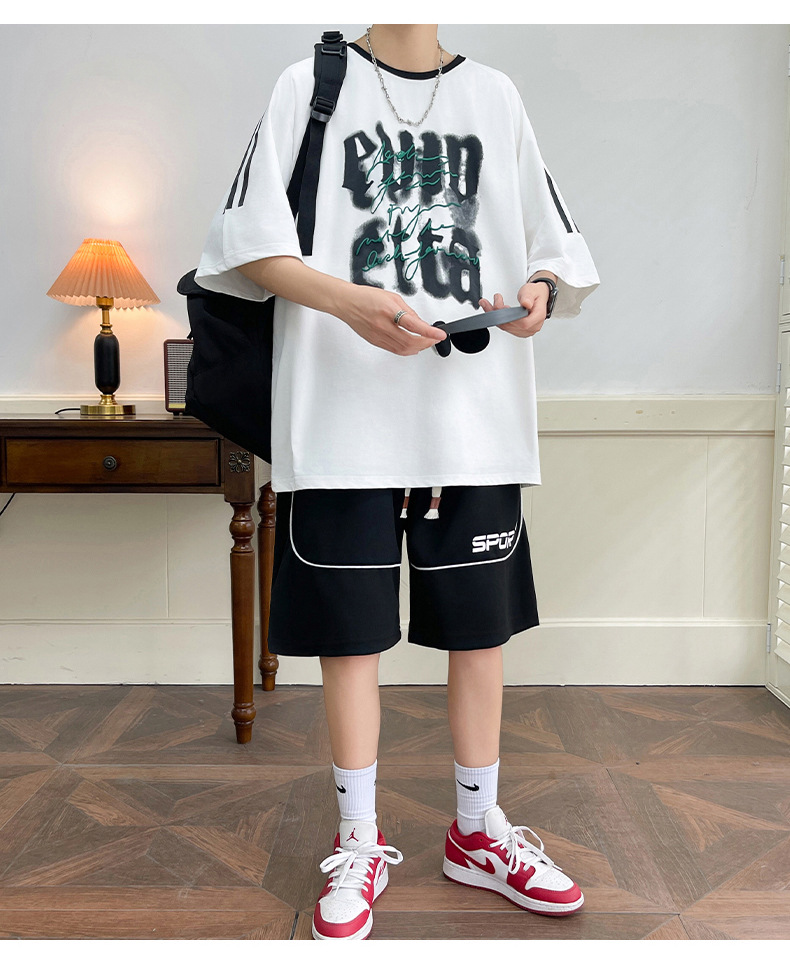 2025 verano nueva camiseta de cuello redondo suelta versátil conjunto juvenil diario hombre cinco puntos casuales corto delgado