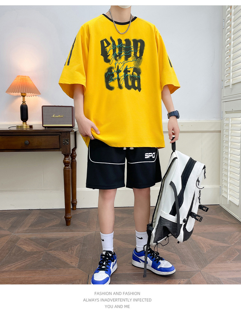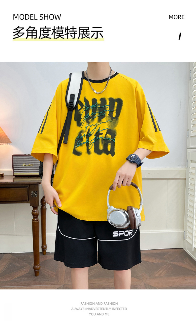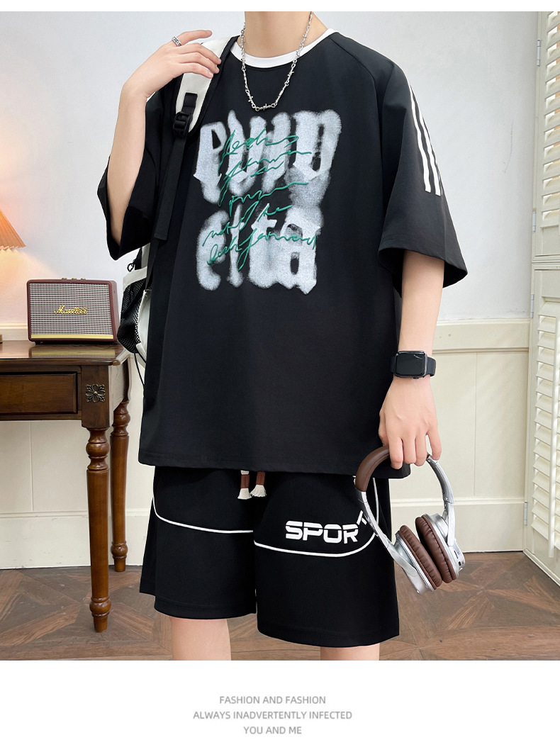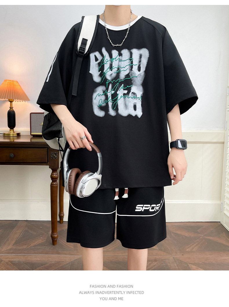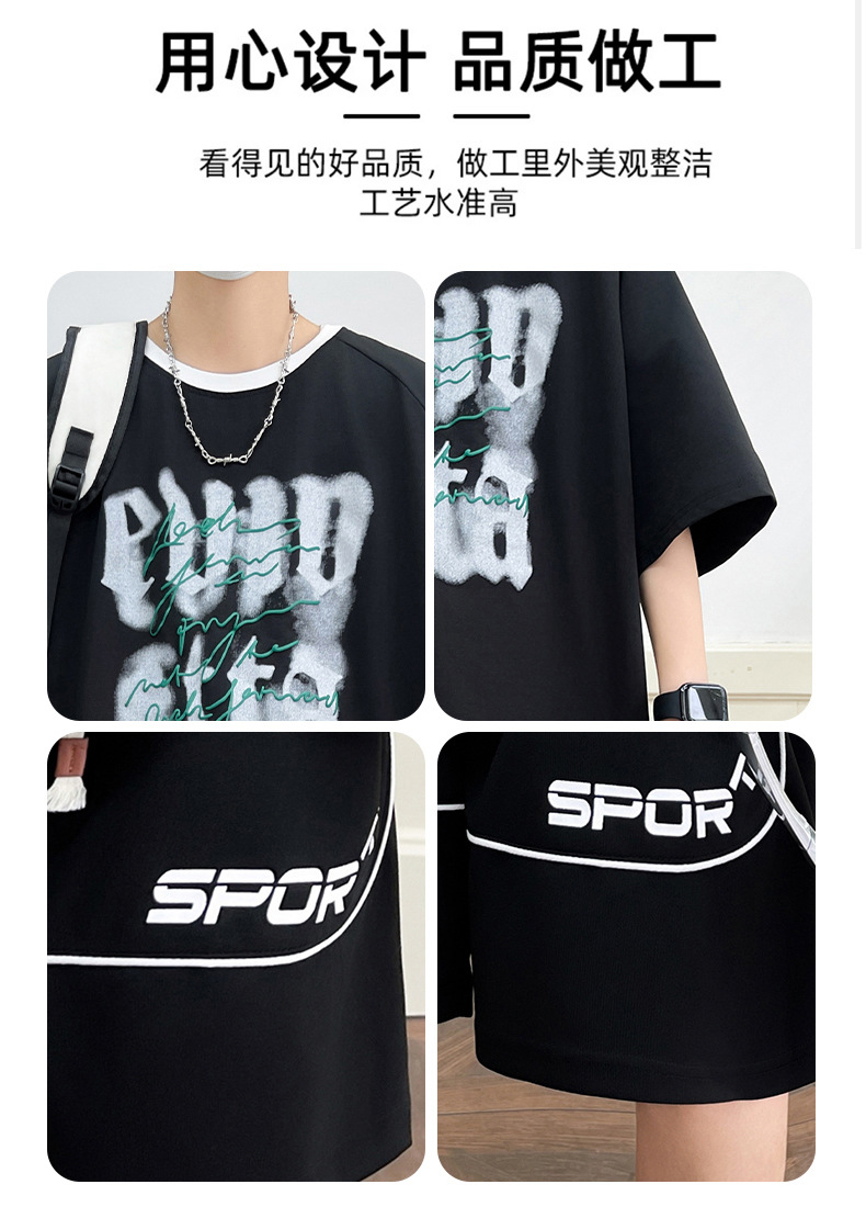 2025 verano nueva camiseta de cuello redondo suelta versátil conjunto juvenil diario hombre cinco puntos casuales corto delgado