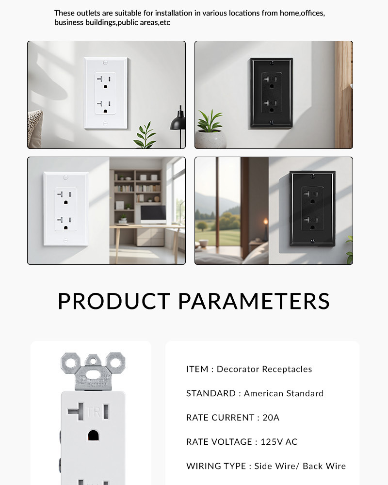 | Modelo | Enchufe estándar americano 15A TR blanco norteamericano sin panel,Enchufe estándar americano 20A TR blanco norteamericano sin panel,Enchufe estándar americano negro norteamericano 15A TR sin panel,Enchufe estándar americano 20A TR negro norteamericano sin panel,Enchufe norteamericano serie RT 15A,Enchufe norteamericano serie RT 20A,Panel de tornillos de dos posiciones,Un panel de tornillo blanco,Un panel sin tornillos blanco,Un panel de tornillo negro,Un panel sin tornillos negro,Panel de tornillo de dos posiciones blanco,Panel sin tornillos de dos posiciones blanco,Panel de tornillo de dos posiciones negro,Panel sin tornillos de dos posiciones negro,Panel de tornillo de tres dígitos blanco,Panel de tres dígitos sin tornillos blanco,Panel de tornillo de tres dígitos negro,Panel sin tornillos de tres dígitos negro,Panel de tornillo de cuatro dígitos blanco,Panel sin tornillos de cuatro dígitos blanco,Panel de tornillo de cuatro dígitos negro,Panel sin tornillos de cuatro dígitos negro |