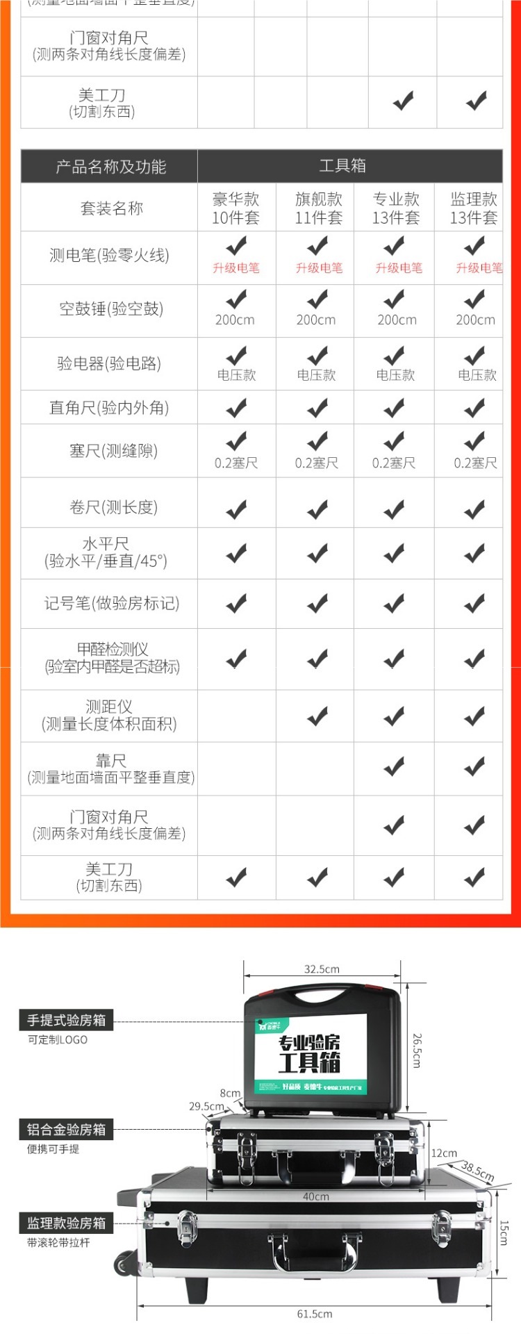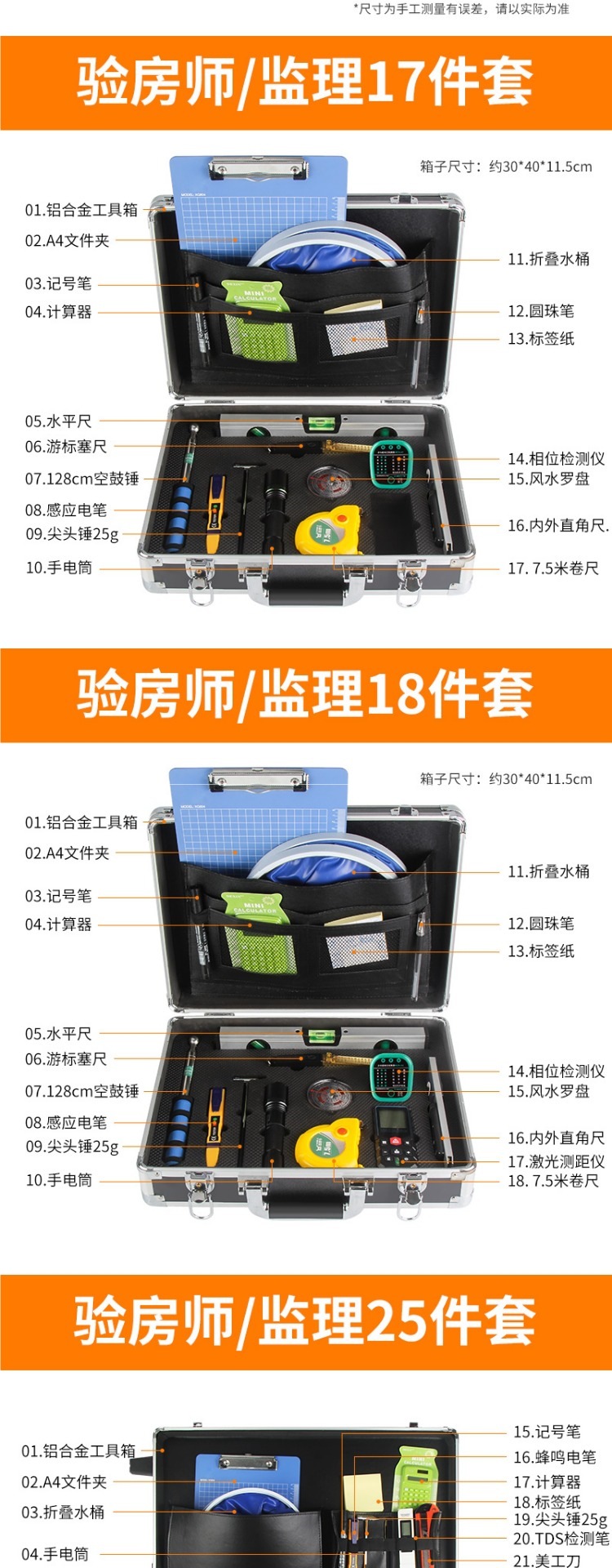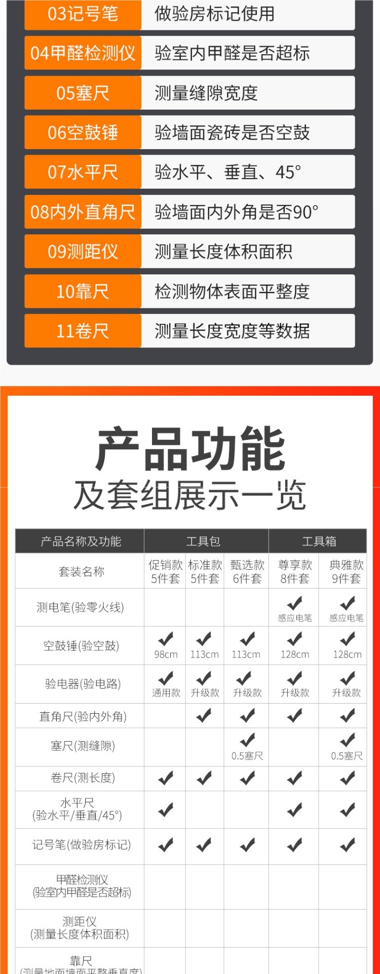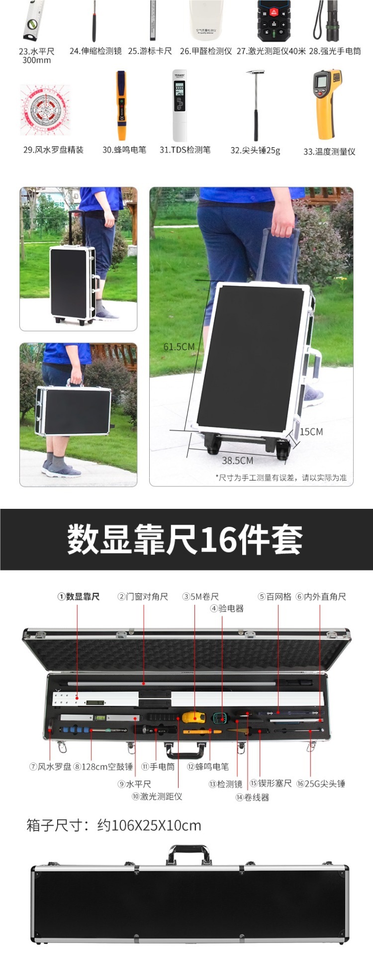 | Modelo | ¡Colección más compra contacto servicio al cliente regalo 6 Tipos de pegatinas de Inspección 180!!! , conjunto especial (128cm Martillo de tambor vacío, detector de enchufe, regla horizontal, cinta métrica), conjunto estándar (98cm Martillo de tambor vacío, detector de enchufe, regla de ángulo recto), 128cm Martillo de tambor vacío (tambor vacío), detector de fase actualizado (circuito de inspección), pluma de detección de calidad del agua (calidad del agua), conjunto básico 1 (128cm Martillo de tambor vacío, detector de enchufe, Kit de herramientas), conjunto básico 2 (128cm Martillo de tambor vacío, detector de actualización (cable de tierra medible), kit de herramientas), paquete 3 (128cm Martillo de tambor vacío, detector de enchufe, regla de ángulo recto, cinta métrica), paquete 4 (128cm Martillo de tambor vacío, detector de enchufe, cinta métrica de ángulo recto, cinta métrica horizontal regla), paquete 5 (128cm Martillo de tambor vacío, detector de enchufe, regla de ángulo recto, cinta métrica, regla horizontal, regla de tapón), paquete 6 (200cm Martillo de tambor vacío, detector de enchufe, regla de ángulo recto, regla de cinta, regla horizontal, regla de tapón, 6 Tipos de pegatinas de inspección, 12 tipos de pegatinas de Inspección 360, 6 Tipos de cajas básicas, 6 Tipos de cajas estándar, 7 juegos de cajas estándar, 8 Juegos de cajas (especiales para la inspección en blanco), 9 juegos de pruebas de grietas (más de 8 Juegos de reglas de tapón), 10 juegos de pruebas de aire (más de 9 juegos de prueba de formaldehído), 13 juegos de pruebas verticales (11 juegos de cajas + 2 metros de regla + regla de esquina de puertas y ventanas), 17 juegos de cajas de aleación de aluminio para inspectores (ver detalles de contenido), 18 juegos de cajas de aleación de aluminio para inspectores (más de 17 juegos de medición de distancia), Inspector láser de habitaciones 25 juegos de cajas de trolley de aleación de aluminio (ver detalles en el interior), 33 juegos de cajas de trolley de aleación de aluminio para inspectores de Sala (ver detalles en el interior), agujas en cajas de aleación de aluminio con regla (ver detalles en el interior), pantalla digital en cajas de aleación de aluminio con regla (ver detalles en el interior), agujas en regla 2 metros, regla de tapón, regla horizontal, regla de ángulo recto interior y exterior, Pantalla digital del detector de fase, medidor de formaldehído, telémetro láser, regla de 2 metros, brújula Feng shui, medidor de línea de red, linterna de luz fuerte, regla lu, Martillo de tambor vacío de 160cm (actualizado) |