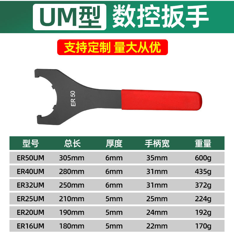 | Especificaciones y modelos | 1946, llave CNC tipo um er16um, 0,17 kg, 1947, llave CNC tipo um er20um, 0,192kg, 1948, llave CNC tipo um er25um, 0,224 kg, 1949, llave CNC tipo um er32um, 0,372 kg, 1950, llave CNC tipo um er40um, 0,435 kg, 1951, llave CNC tipo um er50um, 0,6 kg |