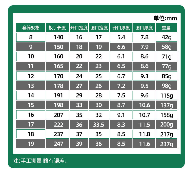 | Especificaciones y modelos | 60 / 426, llave de trinquete de doble propósito de oro negro 6mm, 300 / pieza, 427, llave de trinquete de doble propósito de oro negro 7mm, 300 / pieza, 428, llave de trinquete de doble propósito de oro negro 8mm, 0.04kg, 429, llave de trinquete de doble propósito de oro negro 9mm, 60 / 3 piezas, 0.06kg, 430, llave de trinquete de doble propósito de oro negro 10mm, 3 piezas, 0.07kg, 431, llave de trinquete de doble propósito de oro negro 11mm, 3 piezas, 0.08kg, 432, Llave de trinquete de doble propósito de oro negro 12mm, 240 / pieza, 0.09kg, 433, llave de trinquete de doble propósito de oro negro 13mm, 240 / pieza, 0.1kg, 434, llave de trinquete de doble propósito de oro negro 14mm, 240 / pieza, 0.12kg, 435, llave de trinquete de doble propósito de oro negro 15mm, 150 / pieza, 0.14kg, 436, llave de trinquete de doble propósito de oro negro 16mm, 150 / pieza, 0.16kg, 437, llave de trinquete de doble propósito de oro negro 17mm, 150 / pieza, 0.2kg, 438, llave de trinquete de oro negro 18mm, 120 / pieza, 0.22kg, 439, llave de trinquete de oro negro 19mm, 120 / pieza, 0.24kg, 441, llave de trinquete de oro negro 21mm, 80 / pieza, 442, llave de trinquete de oro negro 22mm, 80 / pieza, 443, llave de trinquete de oro negro 23mm, 80 / pieza, 444, llave de trinquete de oro negro 24mm, 60 / pieza, 445, Llave de trinquete de doble propósito de oro negro 27mm, 60 piezas, 446, llave de trinquete de doble propósito de oro negro 30mm, 30 / pieza, 447, llave de trinquete de doble propósito de oro negro 32mm, 30 / pieza |