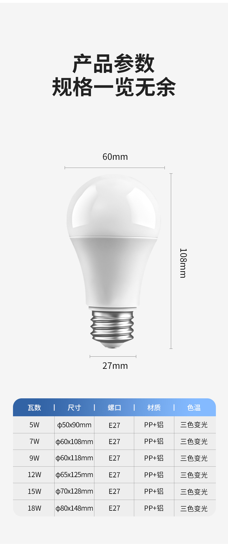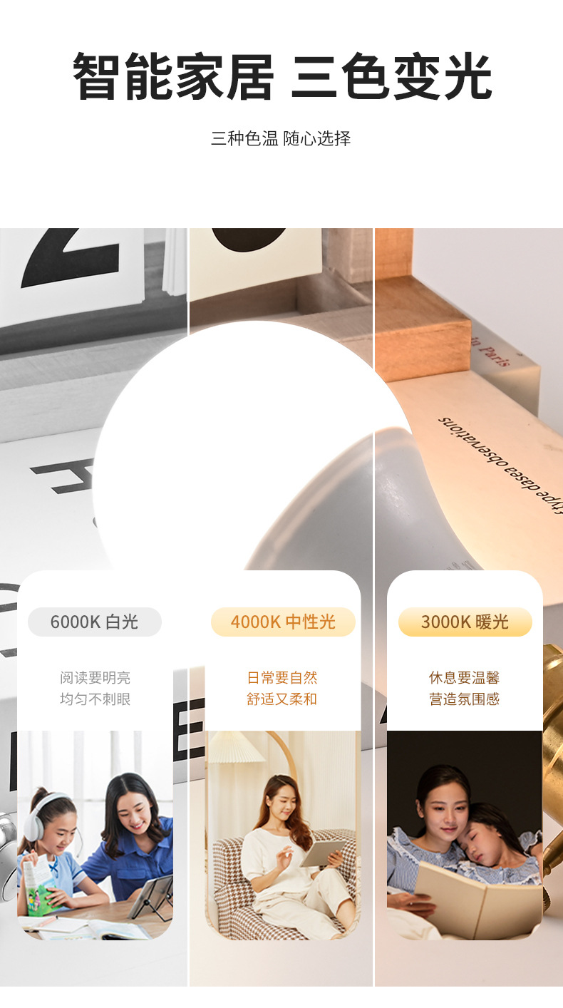 Bombilla led lámpara de plástico Paquete de aluminio de tres colores bombilla cambiante bombilla E27 tornillo bombilla protección para los ojos lámpara hogar iluminación interior
