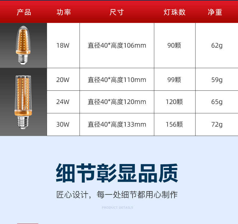 | Potencia | Mazorca dorada 18W e27 (cabeza plana), mazorca dorada 202w e27 (cabeza plana), mazorca dorada 24w e27 (cabeza plana), mazorca dorada 30w e27 (cabeza plana) |