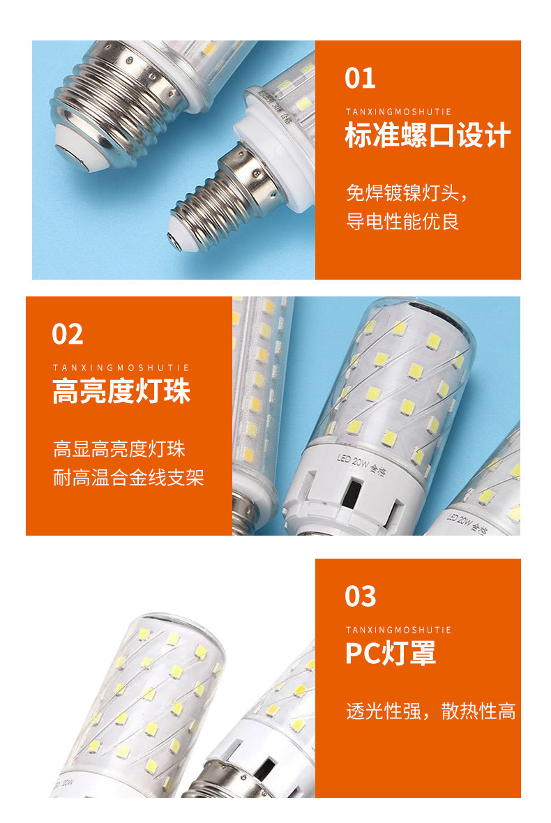 Lámpara de maíz LED ultra brillante hogar ahorro de energía e27 bombilla de tornillo e14 lámpara de maíz de plástico de luz cálida 20W al por mayor