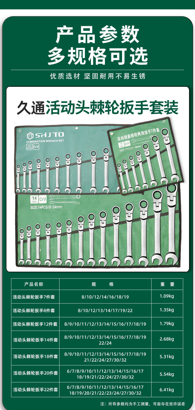 | Modelo | 338, 7 juegos de llaves de trinquete de cabeza móvil espejo - Bolsa de tela, 1.09kg, 339, 8 Juegos de llaves de trinquete de cabeza móvil espejo - Bolsa de tela, 1.35kg, 340, 12 juegos de llaves de trinquete de cabeza móvil espejo - Bolsa de tela, 1.79kg, 341, 14 juegos de llaves de trinquete de cabeza móvil espejo - Bolsa de tela, 2.68kg, 342, 18 juegos de llaves de trinquete de cabeza móvil espejo - Bolsa de tela, 5.31kg, 343 juegos de llaves de trinquete de cabeza móvil espejo - Bolsa de tela, 5.54kg, 344 juegos de llaves de trinquete de cabeza móvil espejo - Bolsa de tela, 6.41kg |