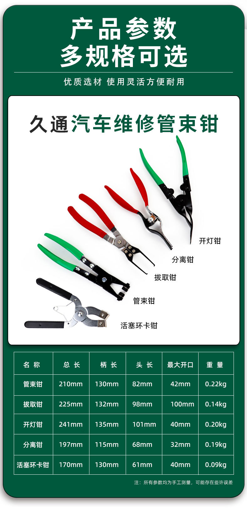 | Modelo | 281, pinzas de anillo de pistón, 0.09kg, 282, pinzas de separación, 0.19kg, 283, pinzas de extracción, 0.14kg, 284, pinzas de haz de tubos, 0.22kg, 285, pinzas de encendido, 0.2kg |