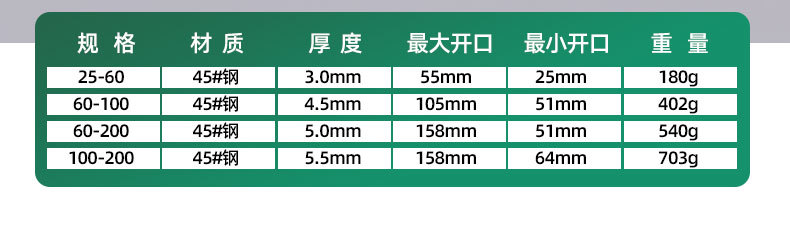 | Modelo | 181, sujetador de cadena 25 - 60, 80 / pieza, 0.18kg, 182, sujetador de cadena 60 - 100, 72 / pieza, 0.4kg, 183, sujetador de cadena 60 - 200, 54 / pieza, 0.54kg, 184, sujetador de cadena 100 - 200, 48 / pieza, 0.7kg |