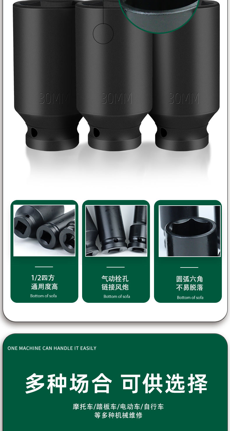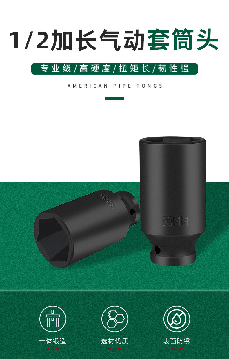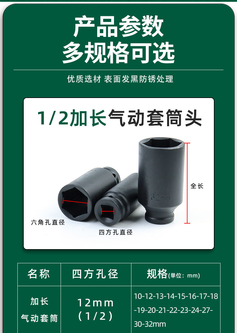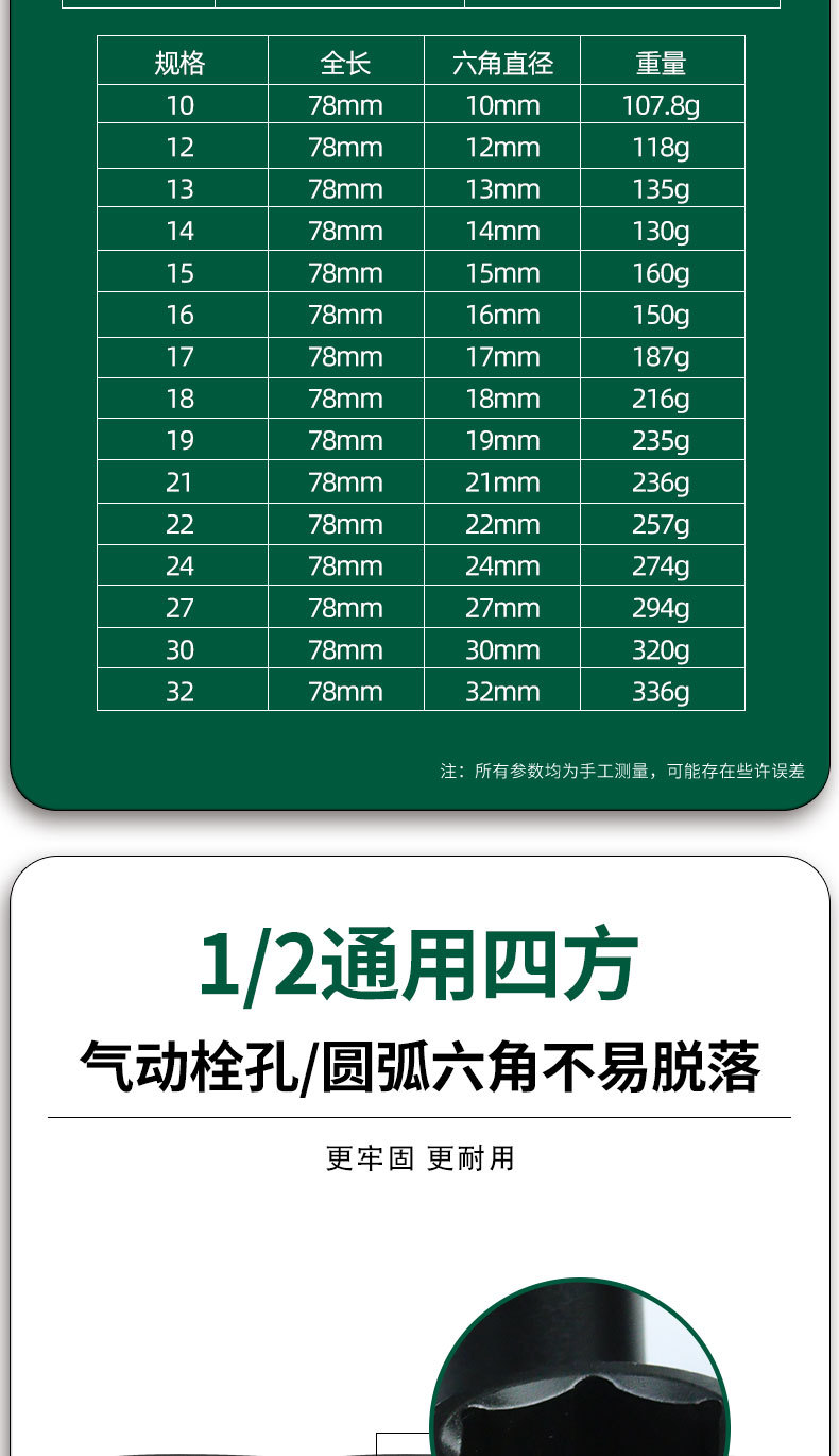 | Modelo | 522,1/2气动风炮套筒80mm*8mm,20/盒320/件,523,1/2气动风炮套筒80mm*9mm,20/盒320/件,524,1/2气动风炮套筒80mm*10mm,20/盒320/件,525,1/2气动风炮套筒80mm*11mm,20/盒320/件,526,1/2气动风炮套筒80mm*12mm,20/盒320/件,527,1/2气动风炮套筒80mm*13mm,20/盒320/件,528,1/2气动风炮套筒80mm*14mm,20/盒320/件,529,1/2气动风炮套筒80mm*15mm,20/盒320/件,530,1/2气动风炮套筒80mm*16mm,20/盒320/件,531,1/2气动风炮套筒80mm*17mm,20/盒320/件,532,1/2气动风炮套筒80mm*18mm,16/盒256/件,533,1/2气动风炮套筒80mm*19mm,16/盒256/件,534,1/2气动风炮套筒80mm*20mm,12/盒192/件,535,1/2气动风炮套筒80mm*21mm,12/盒192/件,536,1/2气动风炮套筒80mm*22mm,12/盒192/件,537,1/2气动风炮套筒80mm*23mm,11/盒176/件,538,1/2气动风炮套筒80mm*24mm,11/盒176/件,539,1/2气动风炮套筒80mm*27mm,9/盒144/件,540,1/2气动风炮套筒80mm*30mm,6/盒96/件,541,1/2气动风炮套筒80mm*32mm,6/盒96/件,542,1/2气动风炮套筒80mm*34mm,60/件,543,1/2气动风炮套筒80mm*36mm,60/件,544,1/2气动风炮套筒80mm*38mm,50/件,545,1/2气动风炮套筒80mm*41mm,50/件 |