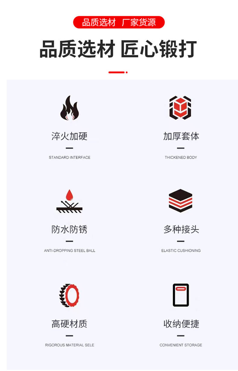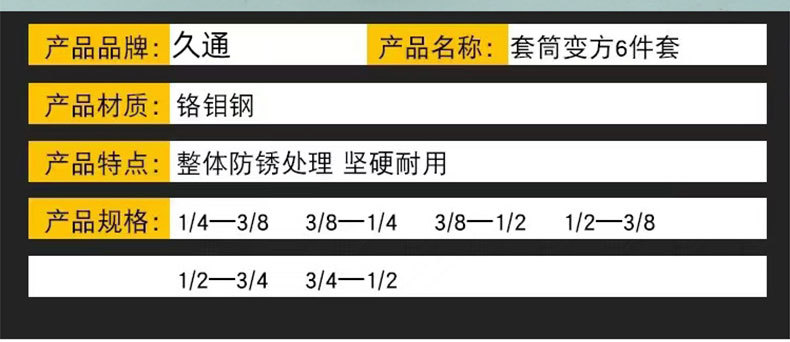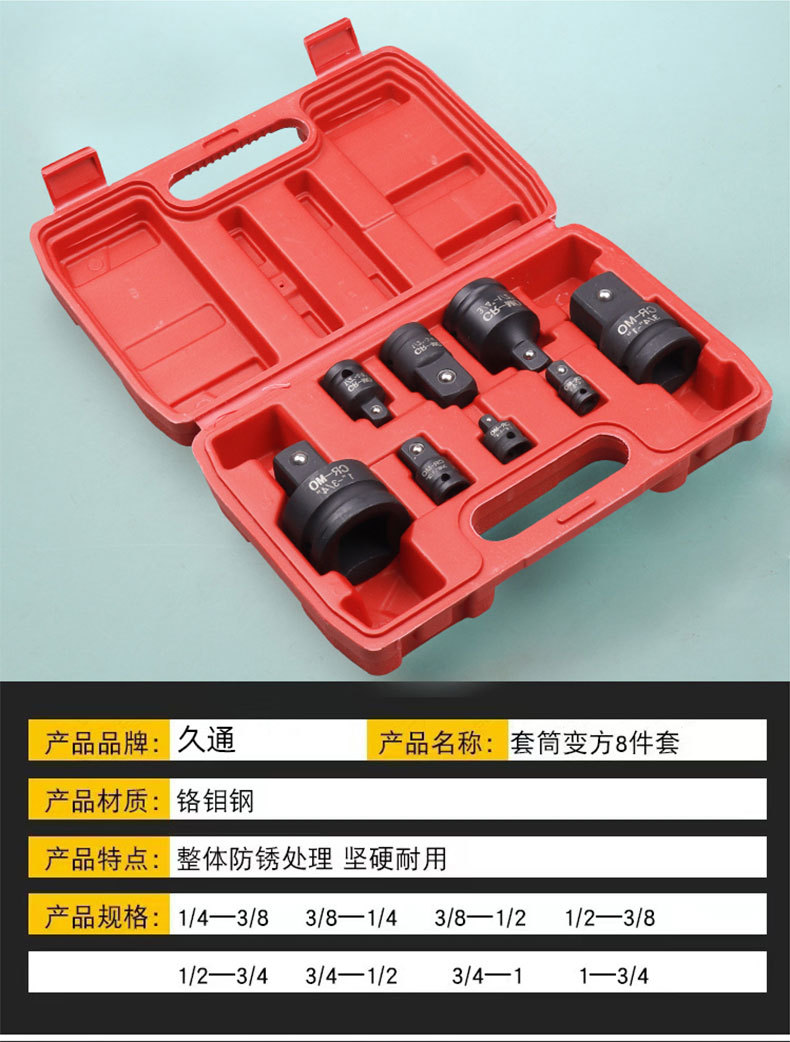 | Modelo | 735, juego de 6 piezas de adaptador de casquillo a cuadrado, 50/pieza, 0,6 kg,736, juego de 8 piezas de adaptador de casquillo a cuadrado, 20/pieza, 1,39 kg,737, juego de 9 piezas de adaptador de casquillo a cuadrado, 50/pieza, 0,67 kg,1254, Manguito de junta universal neumático a adaptador cuadrado, juego de 10 piezas, 40/pieza, 0,62 kg |
