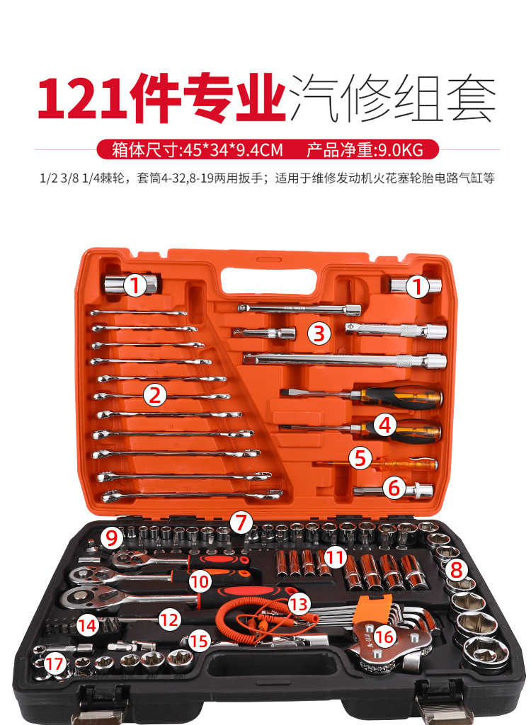 | Modelo | 740, juego de herramientas de reparación de máquinas de 121 piezas con 24 dientes (caja naranja y negra), 3/pieza,Herramientas de la reparación auto 151-Piece |