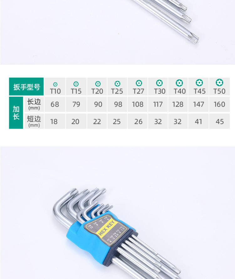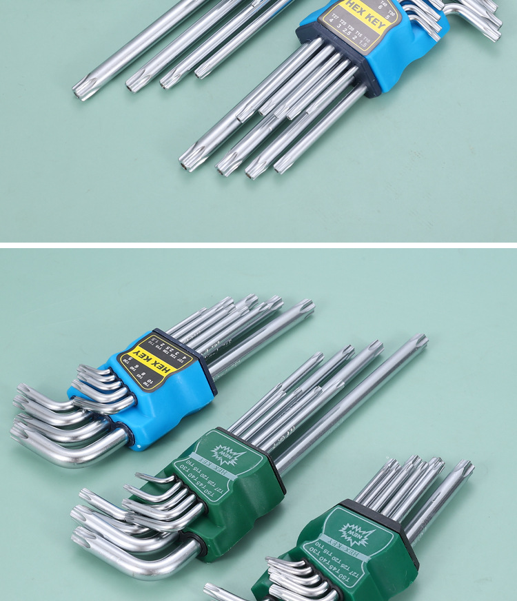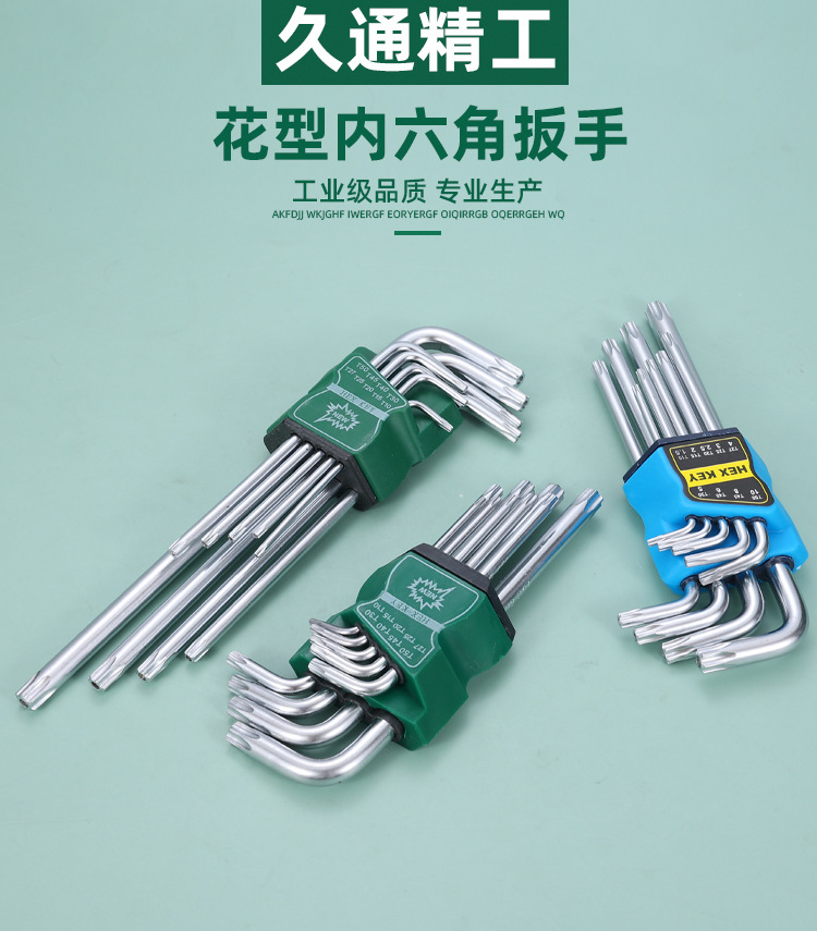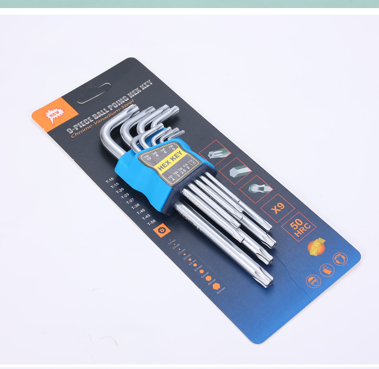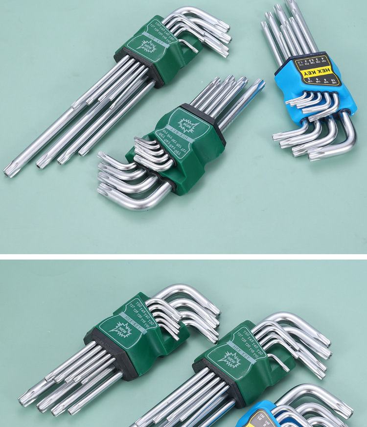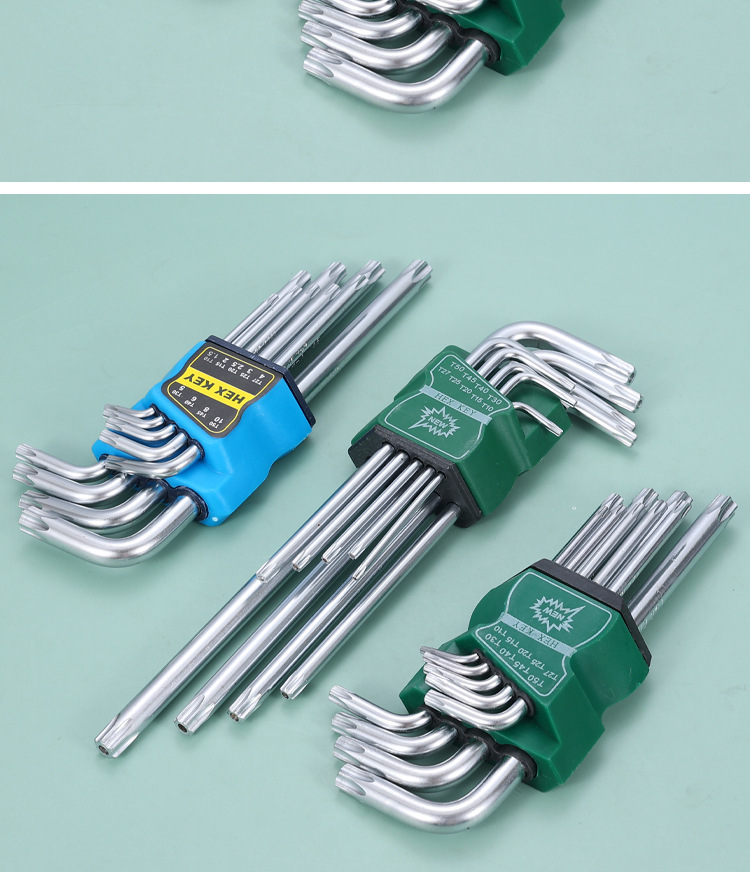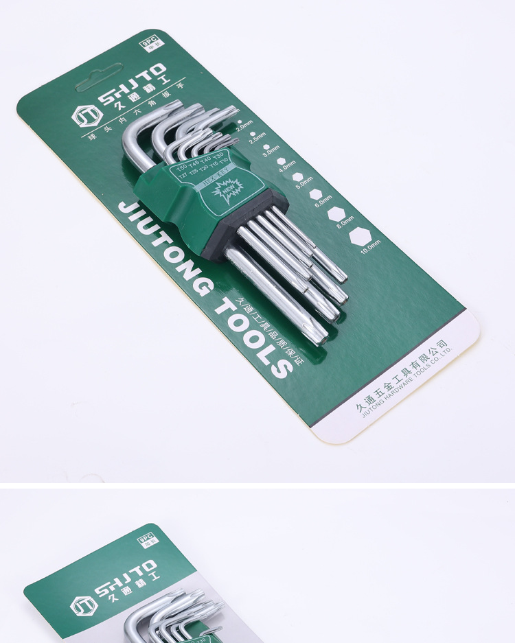 | Modelo de la especificación | 579, Hexágono interior Jiutong de longitud media con diseño de flor de ciruelo, 60/pieza, 0.32kg,580, hexágono interior de flor de ciruelo extendida Jiutong, 60/pieza, 0,43 kg,581, Llave Allen Torx mediana-larga Blue Card, 60/unidad, 0.35kg,582, tarjeta azul hexágono interior de flor de ciruelo extendida, 60/pieza, 0,4 kg |