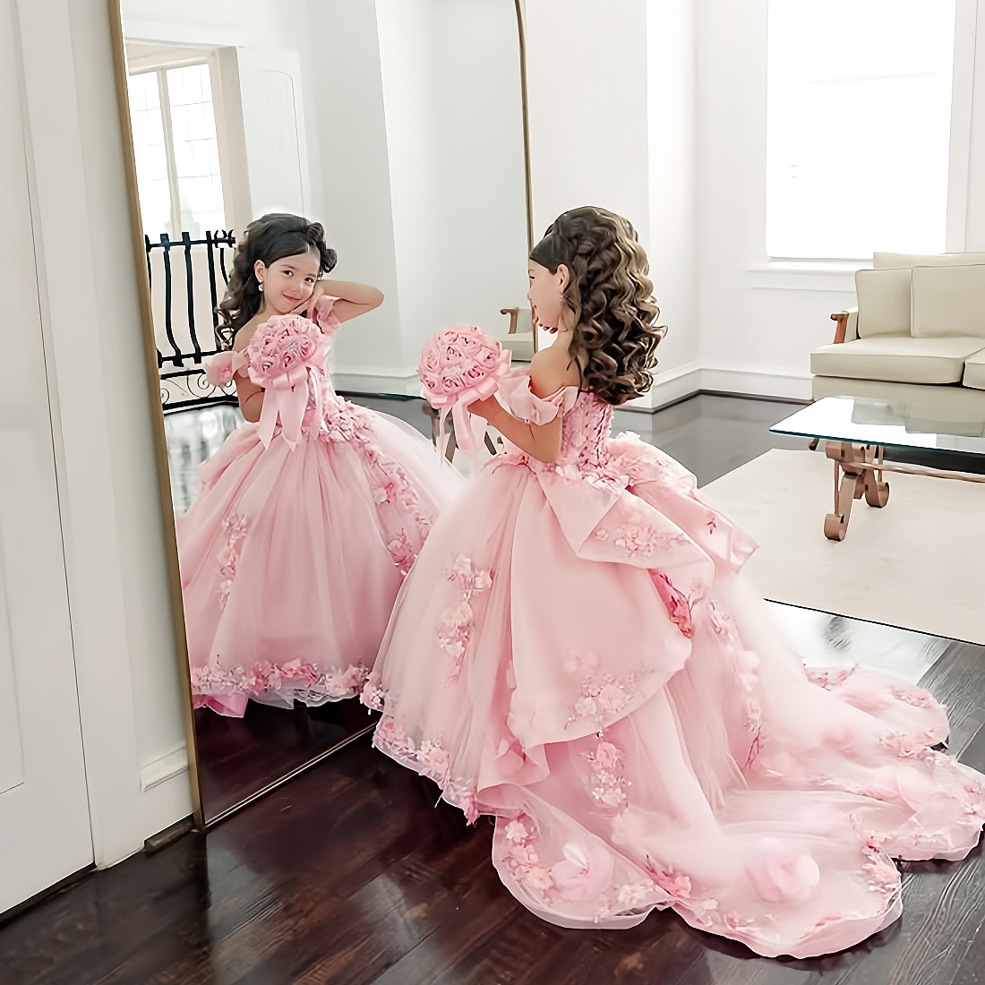 Nuevo vestido de princesa floral chica vestido de cola largo vestido de noche rosa con hombro de alto grado