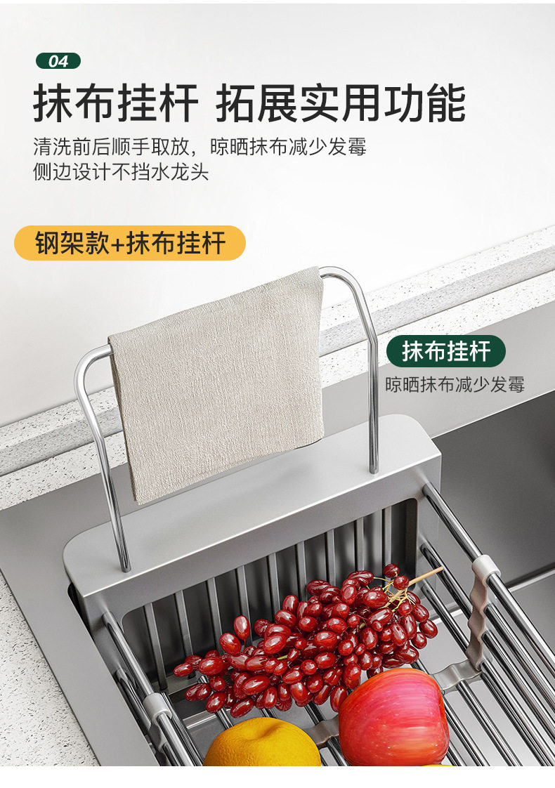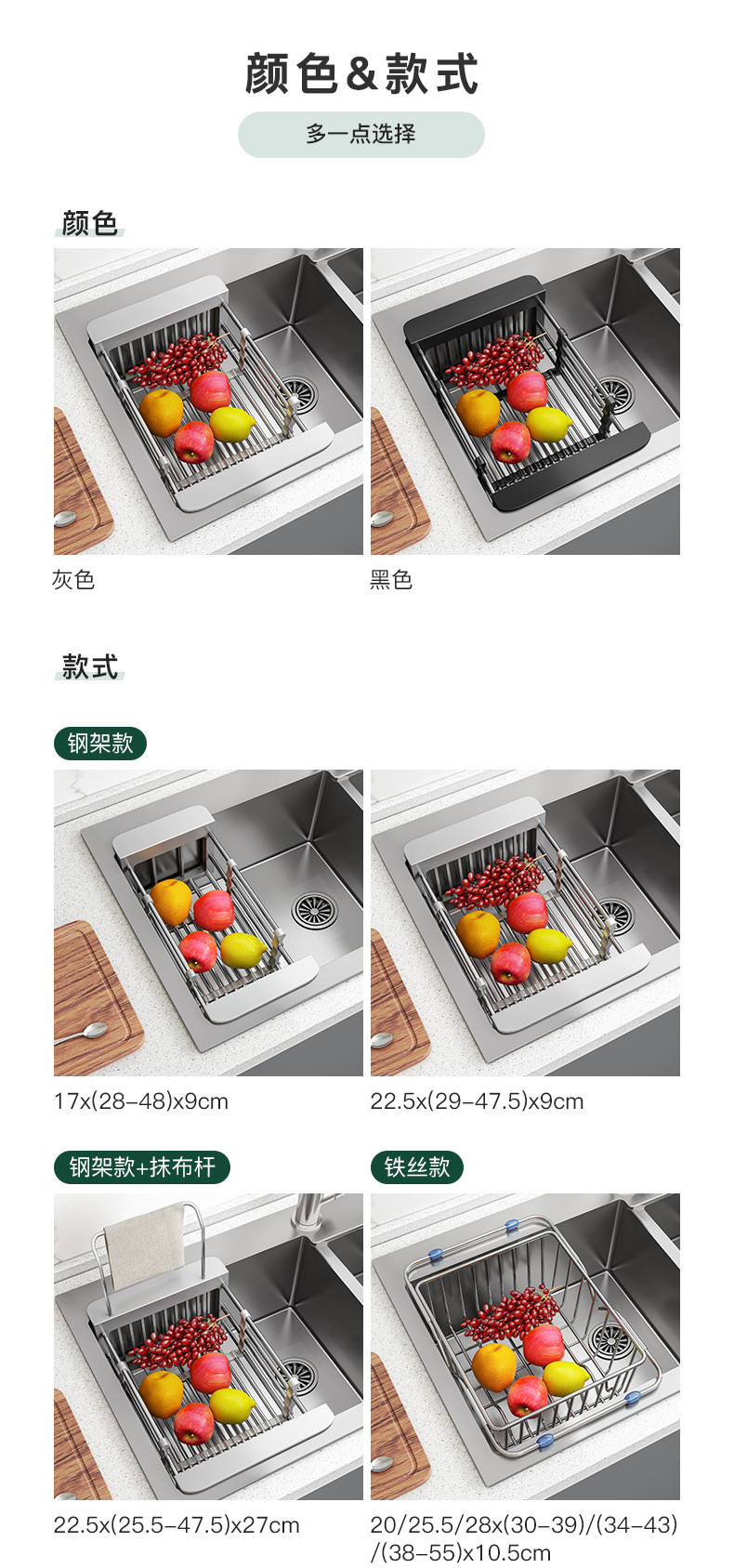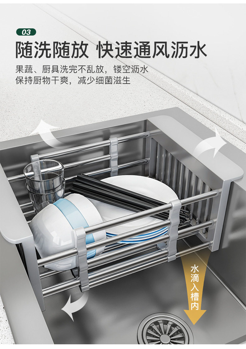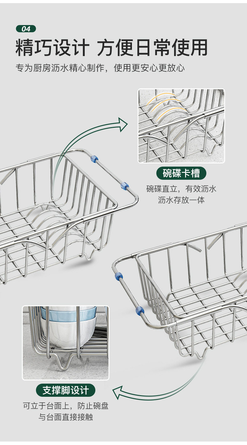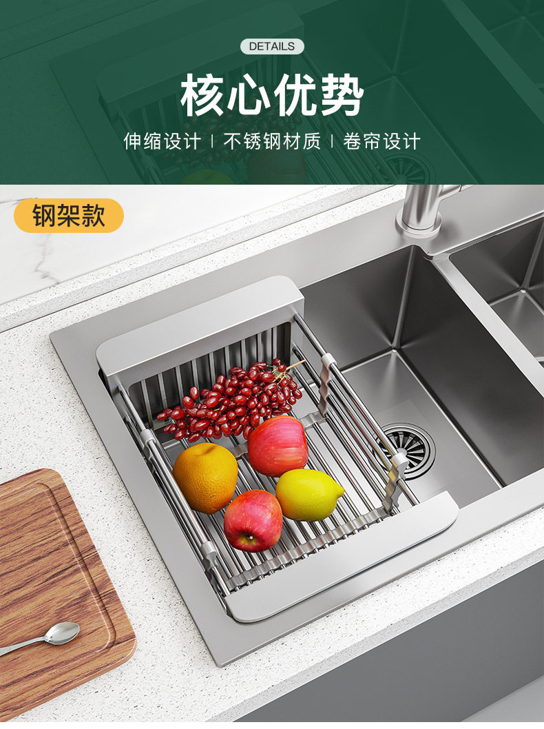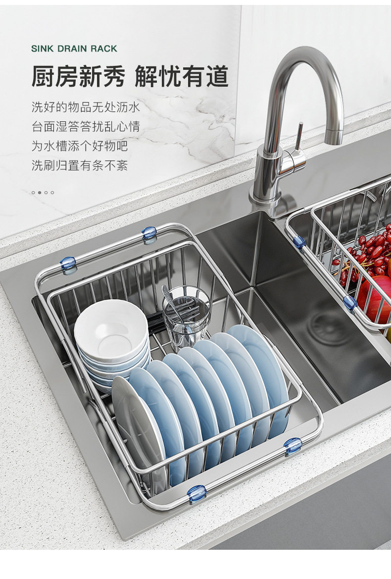 Fábrica directa estante de drenaje retráctil, lavabo de cocina, cesto de drenaje de acero inoxidable, estante de almacenamiento de platos de drenaje
