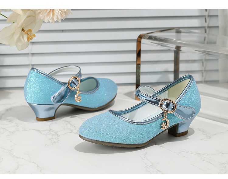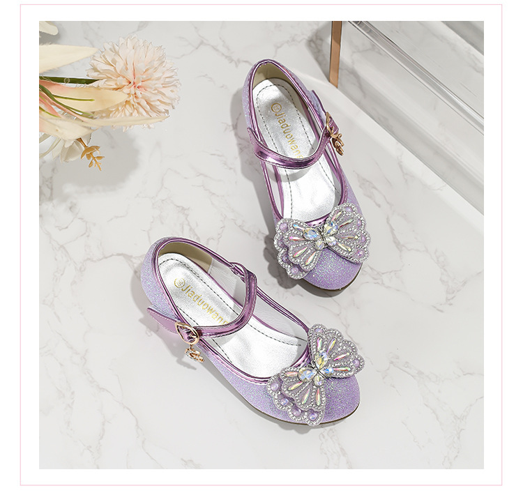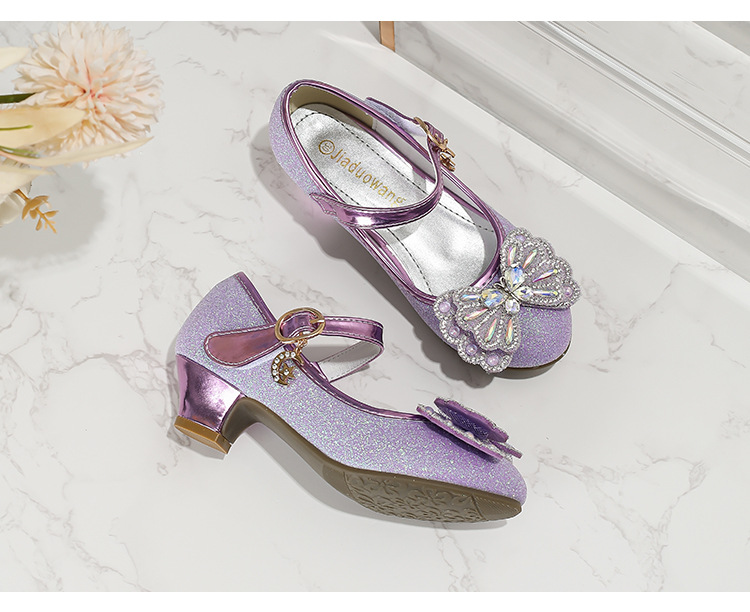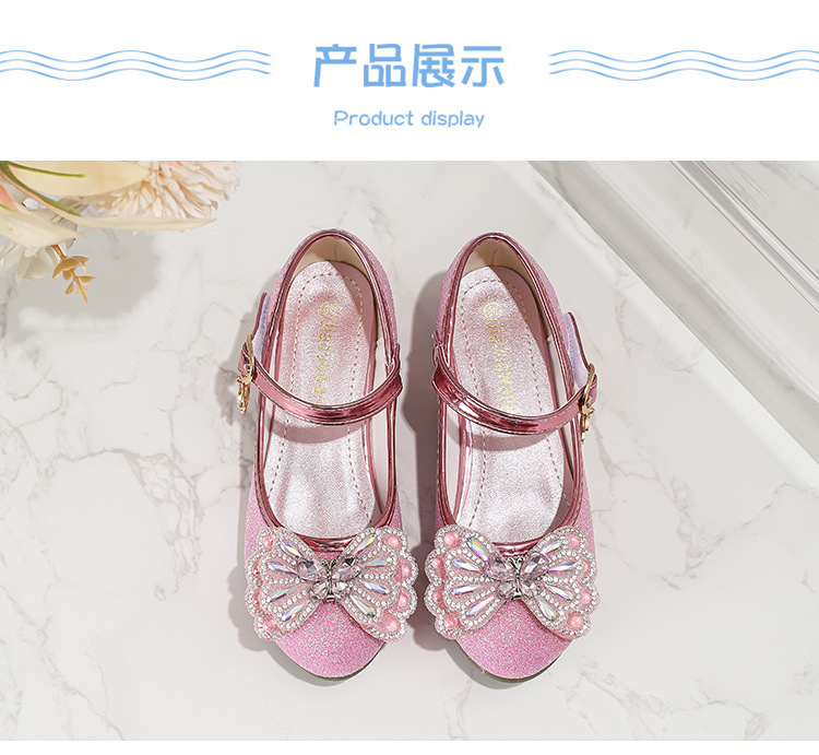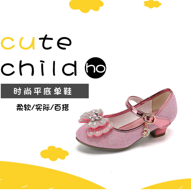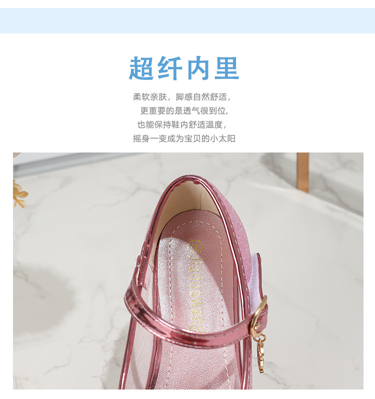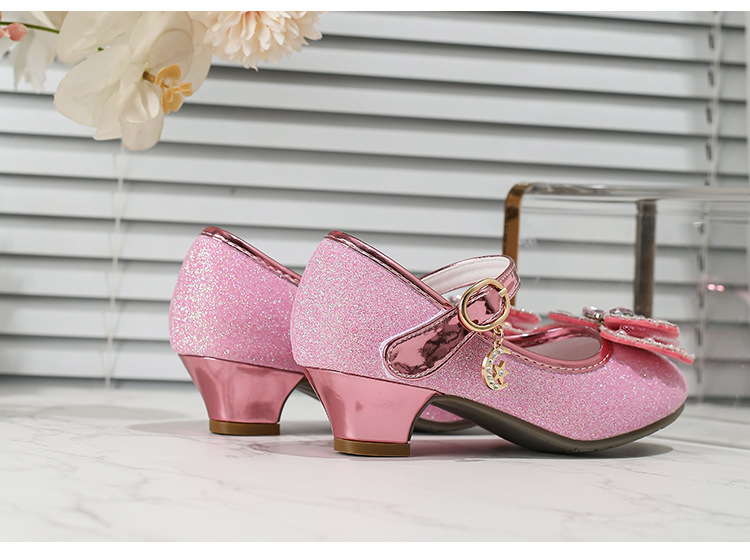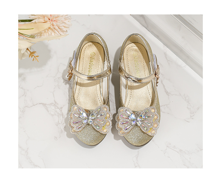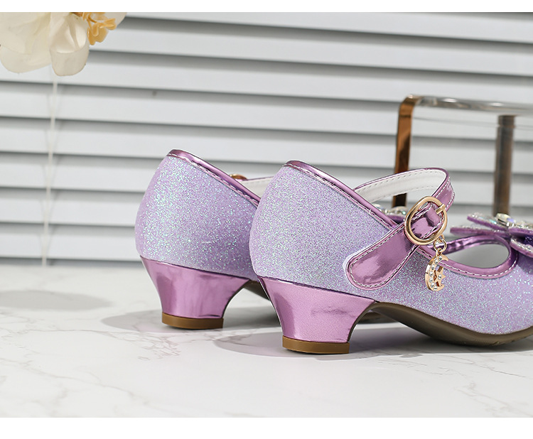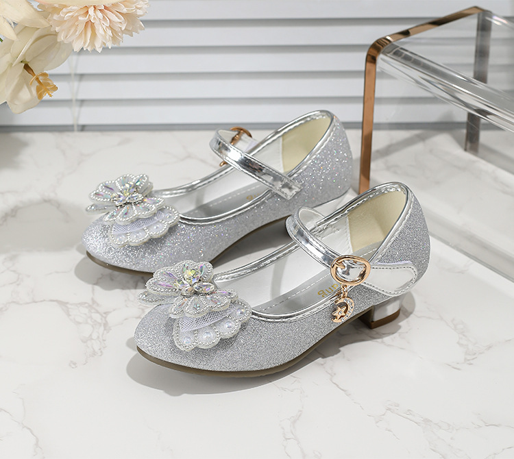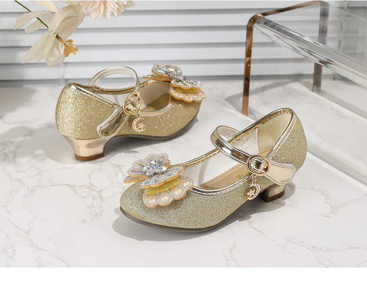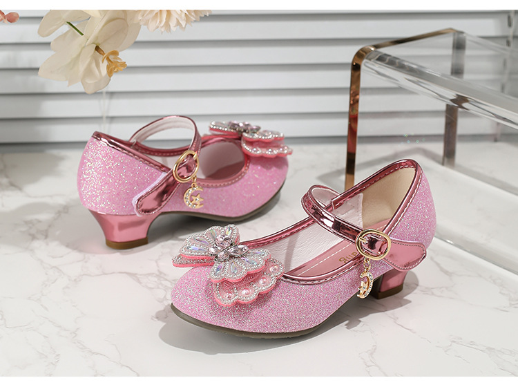 Niñas de tacones altos 2025 primavera brillante zapatos de cuero para niños princesa zapatos de cristal con vestido de espectáculo zapatos de sola suave
