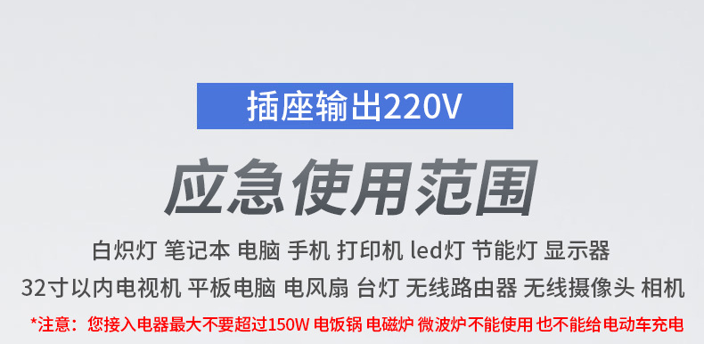 | Especificaciones | Carga de emergencia para teléfono móvil de 5V 10W,220V 30W versión capacitiva 900 mA,220V 150W batería de litio versión 6600 mAh |