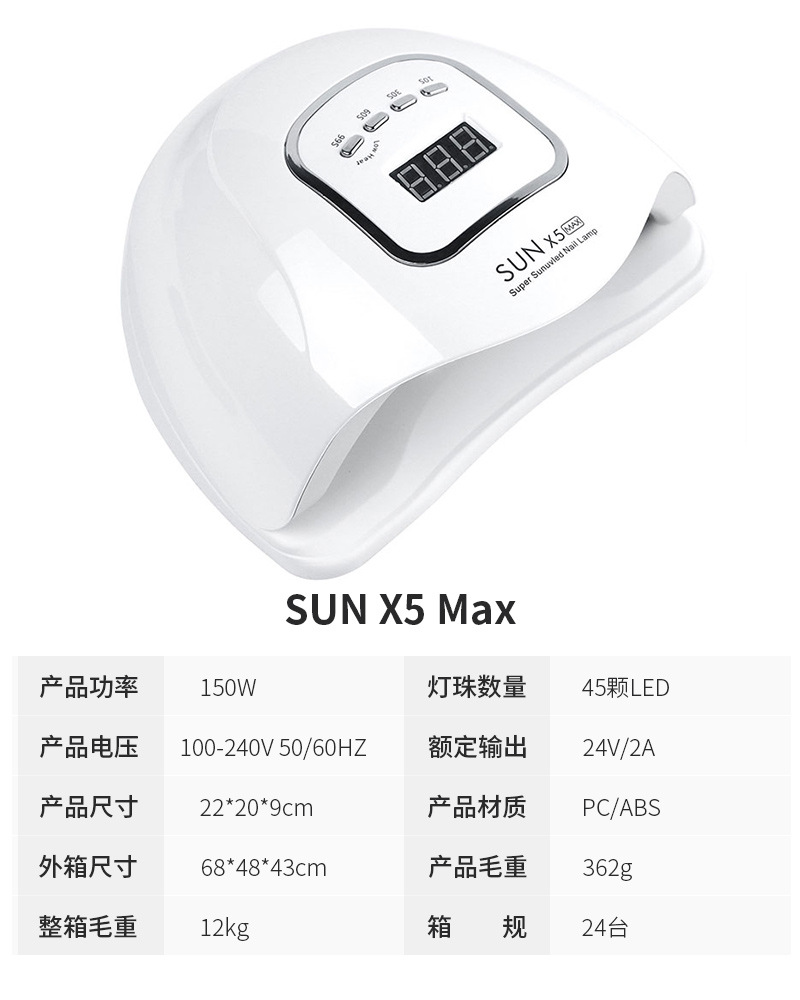 Venta caliente SUNX5MAX lámpara de manicura 150W pegamento de esmalte de uñas lámpara para hornear lámpara de secado rápido 45 uv/led máquina de fototerapia de manicura