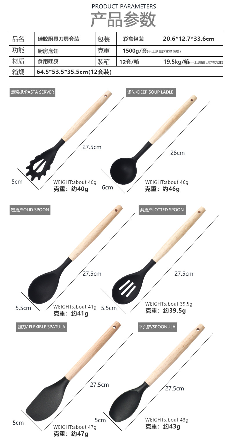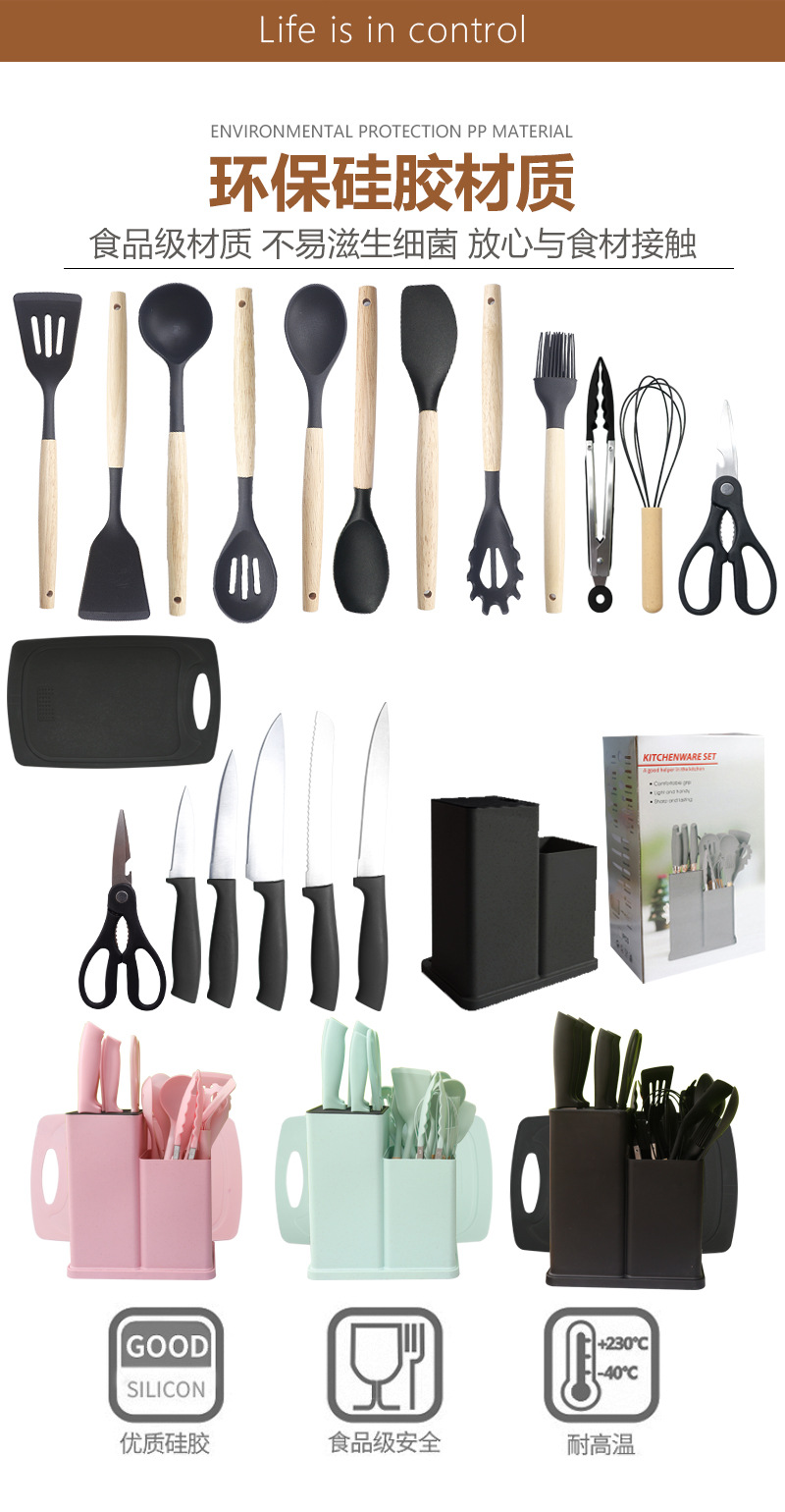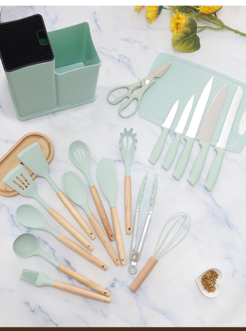 Pala de silicona, cuchara de sopa, juego de 19 piezas, sartén antiadherente, pala de silicona, cocina de silicona doméstica de grado alimenticio, juego de cuchillos al por mayor