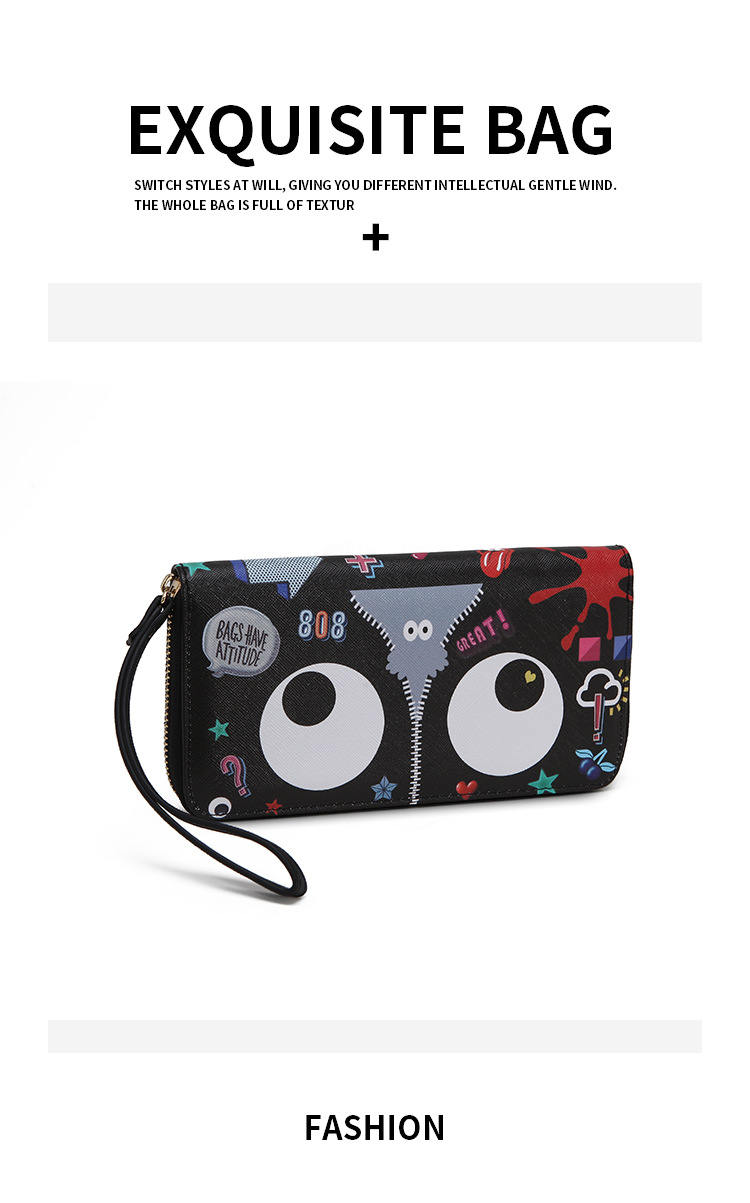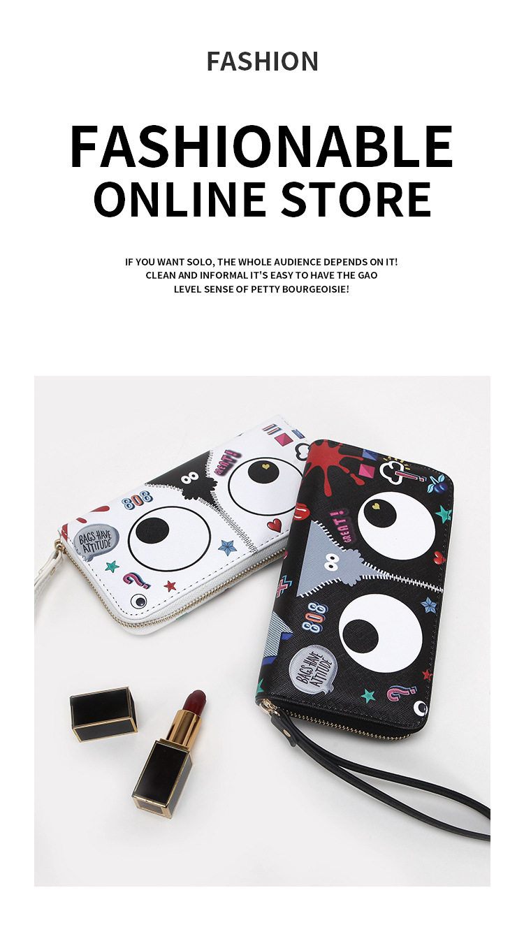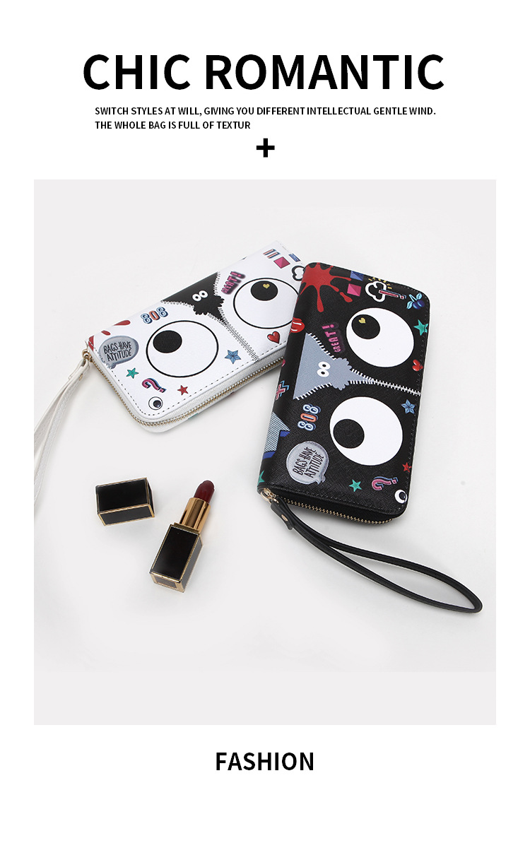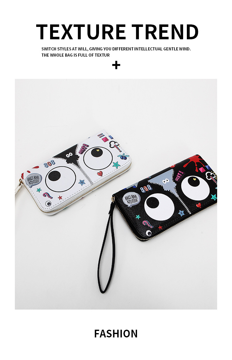 Ojos grandes largo embrague cremallera compartimento de las mujeres monedero titular la tarjeta ID bolsa
