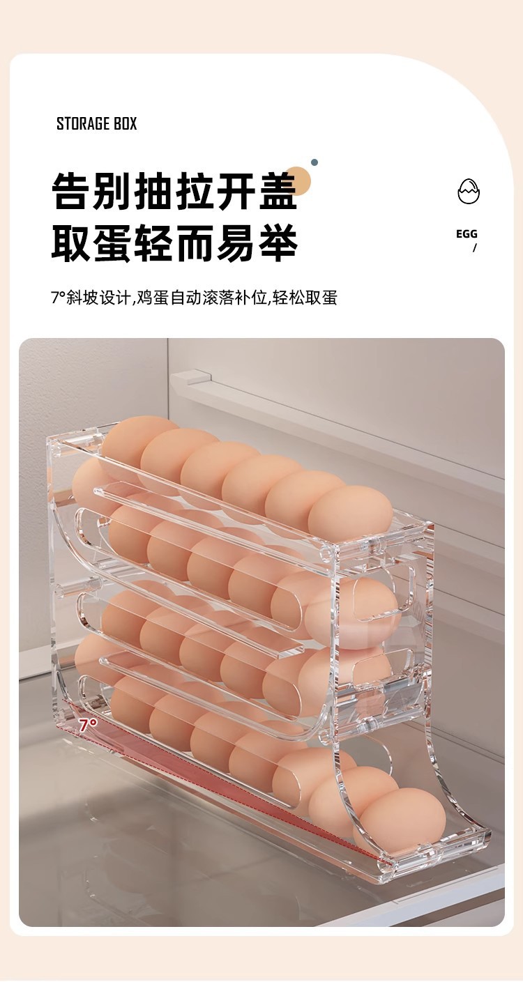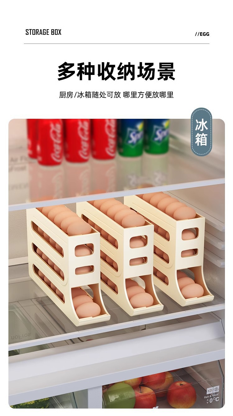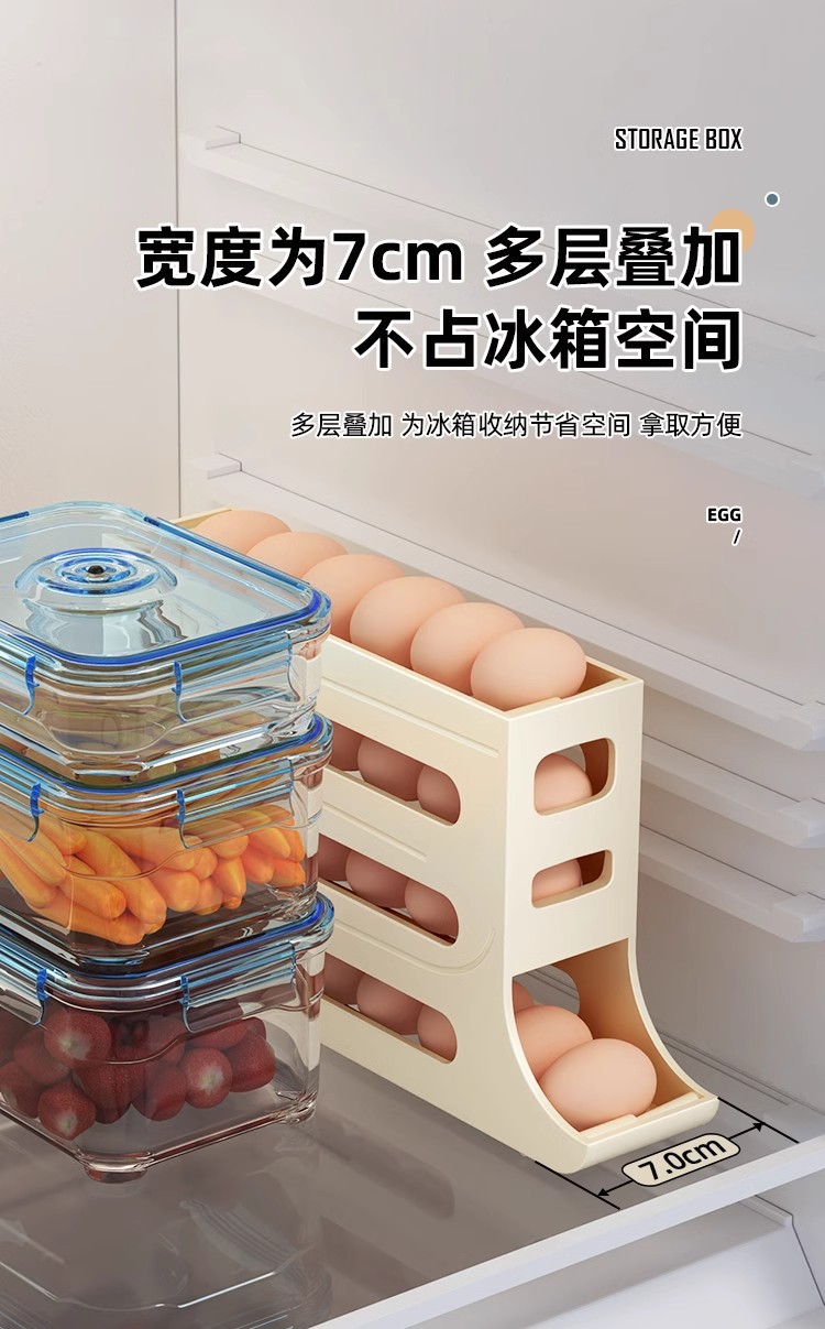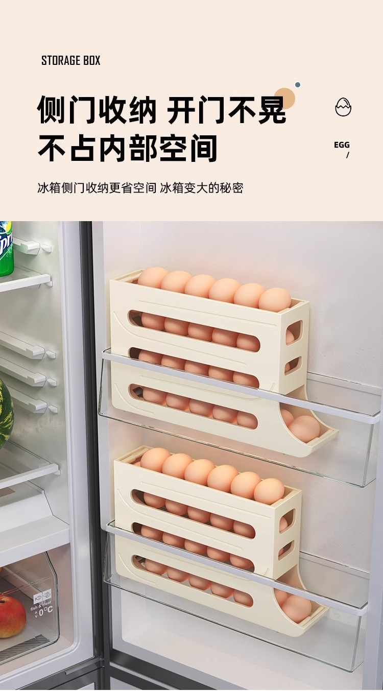 Caja de almacenamiento de huevos deslizante, caja de almacenamiento de puerta lateral del refrigerador, soporte de huevos doméstico de grado alimenticio, caja de huevos rodada automáticamente