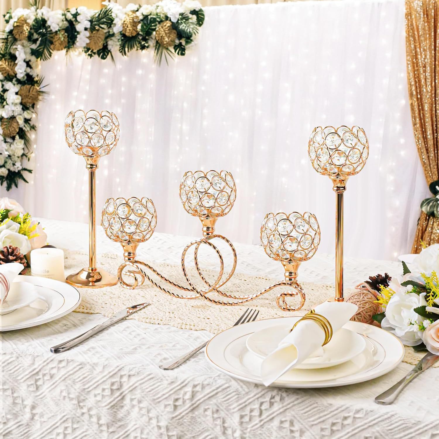 Enchapado de metal moderno nórdico 3 cabezas 5 brazos combinación candelabro de cristal elegante mesa de boda centro decoración candelabro
