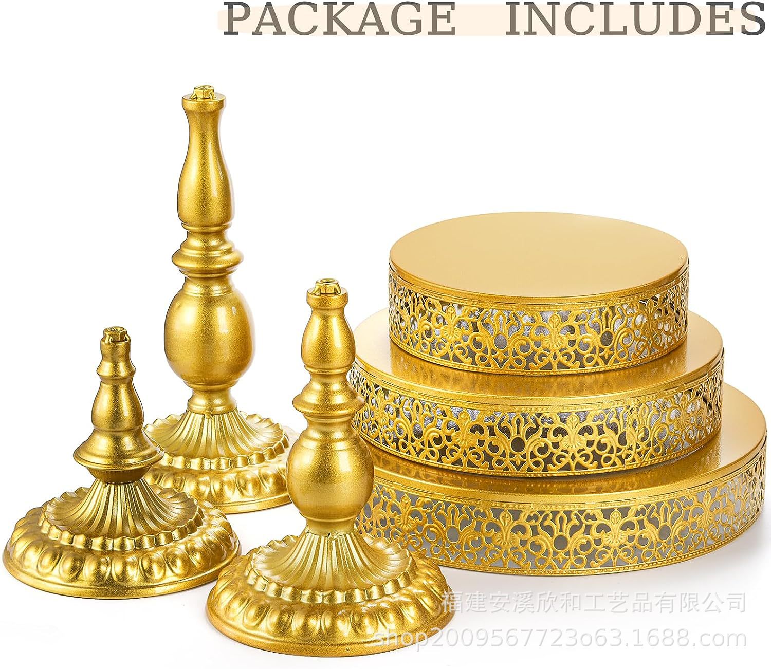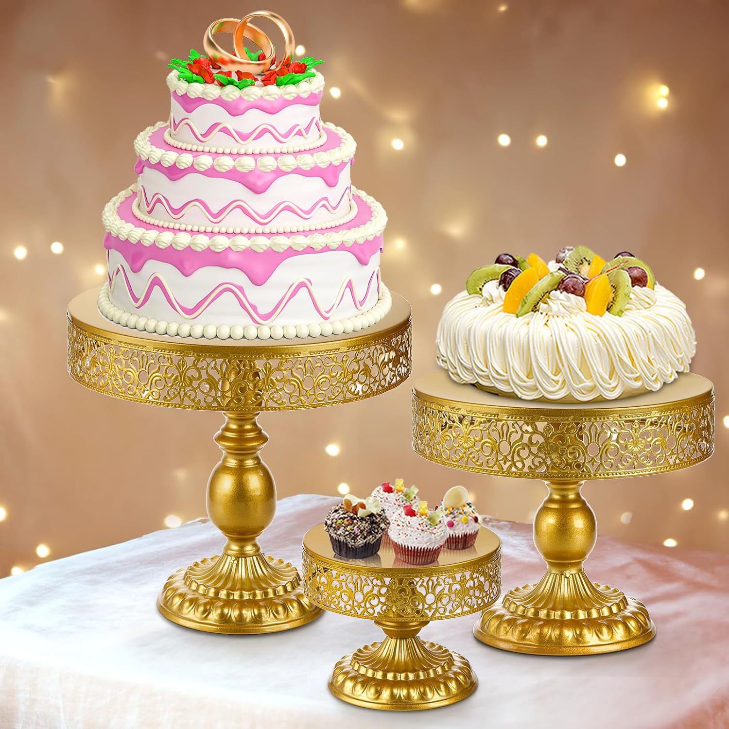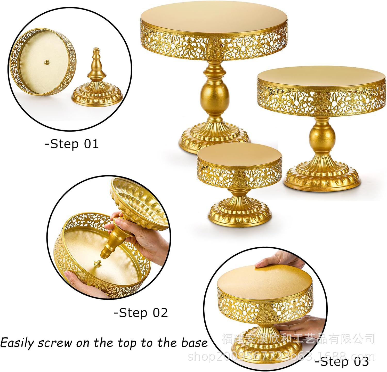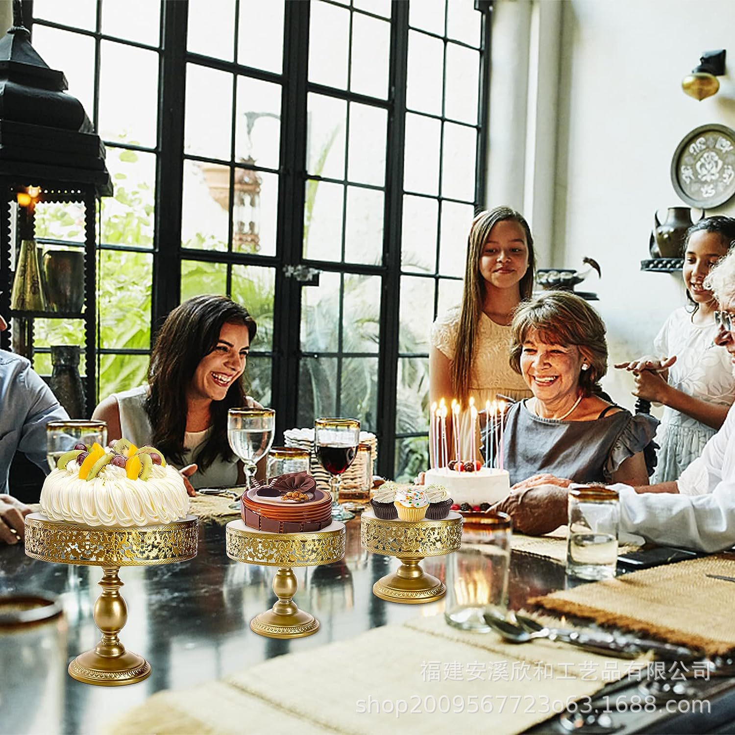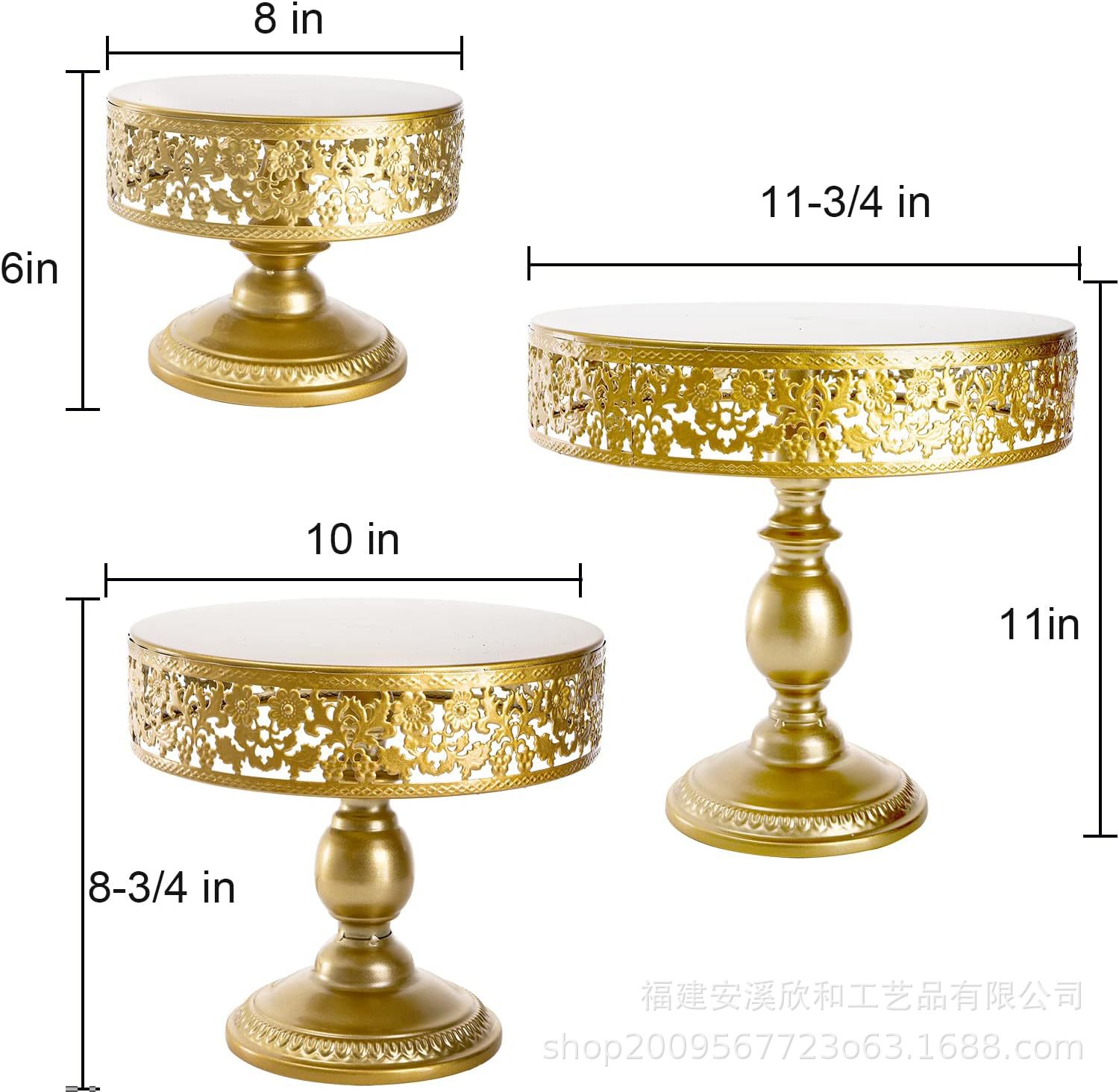 Estante de pastel de metal de lujo ligero de tres piezas set de postres postres altos pies dorados props de boda postres de gala estante de exhibición