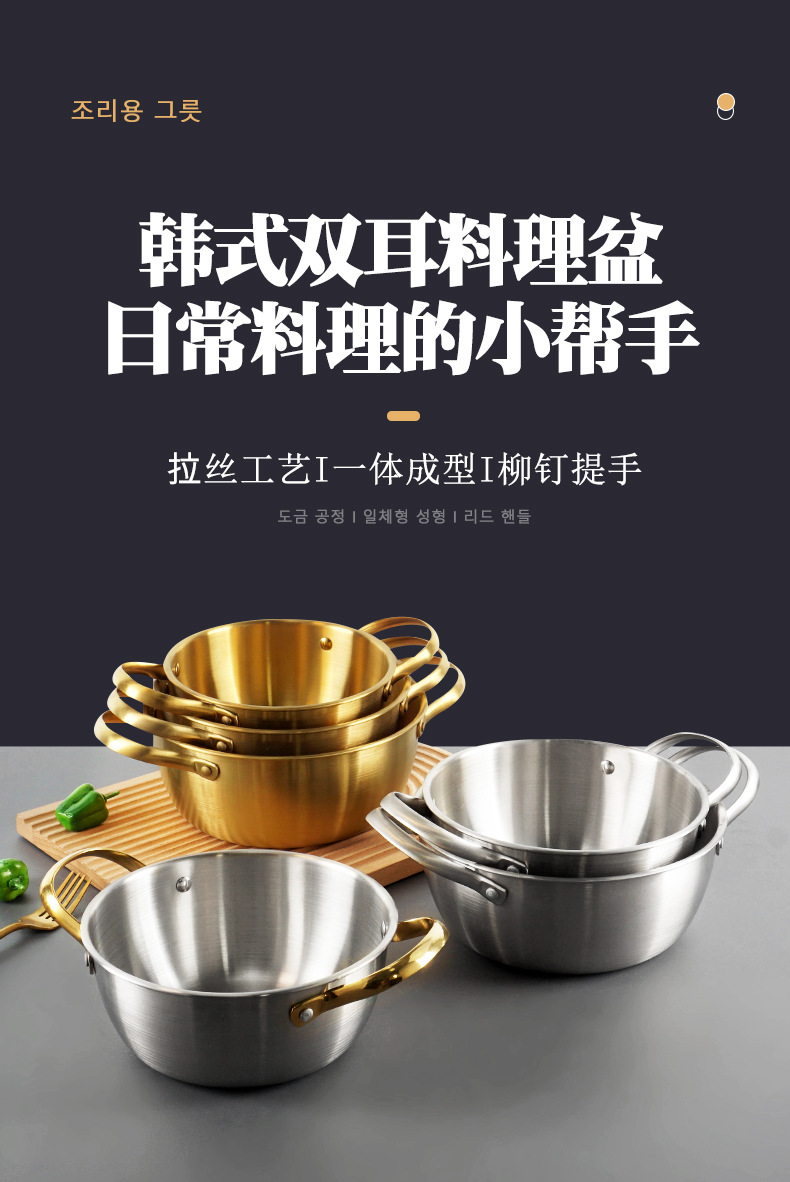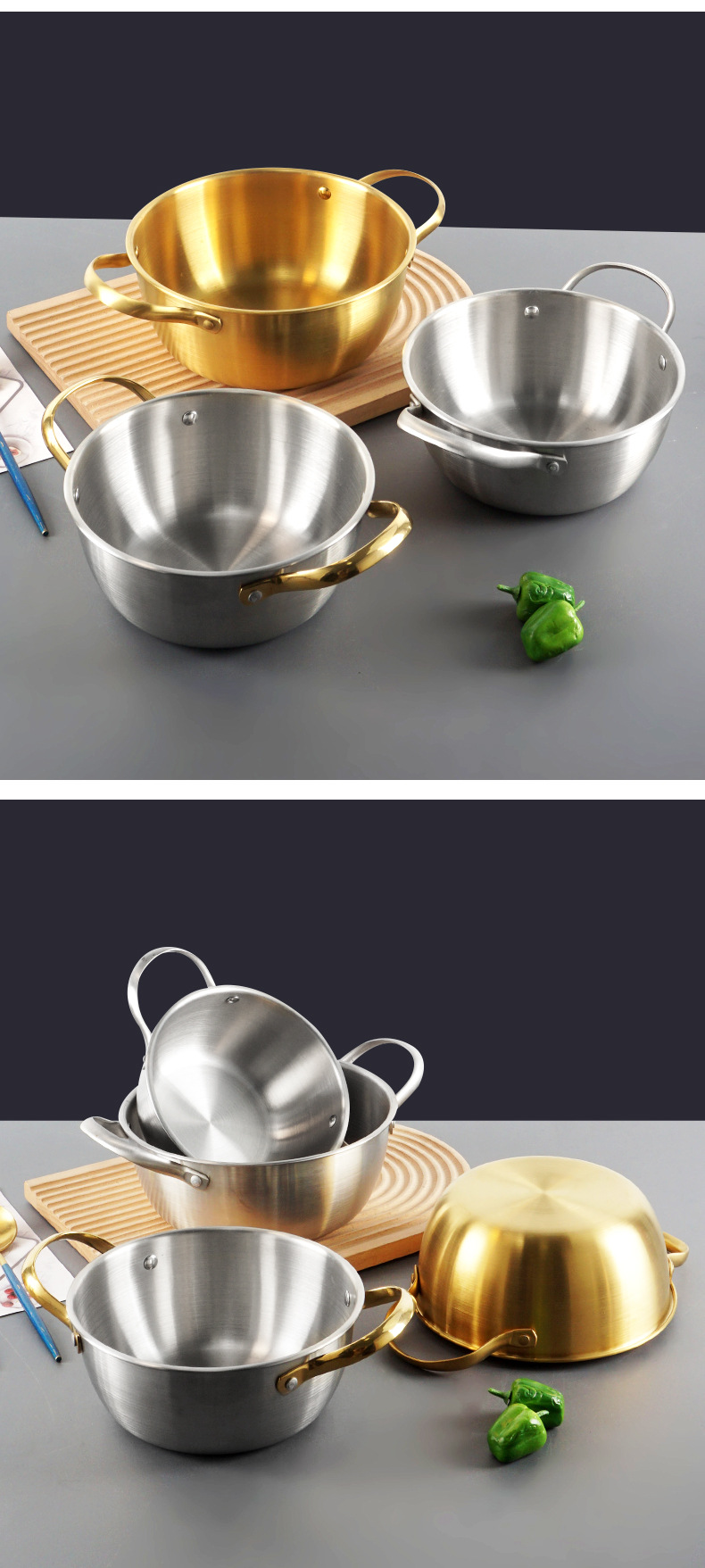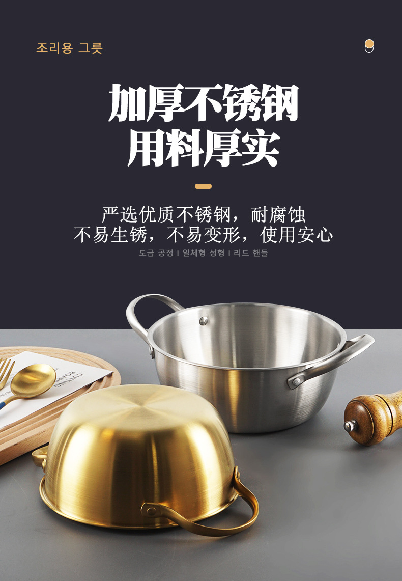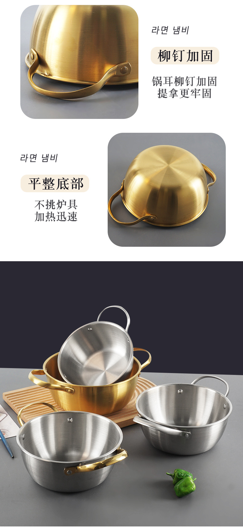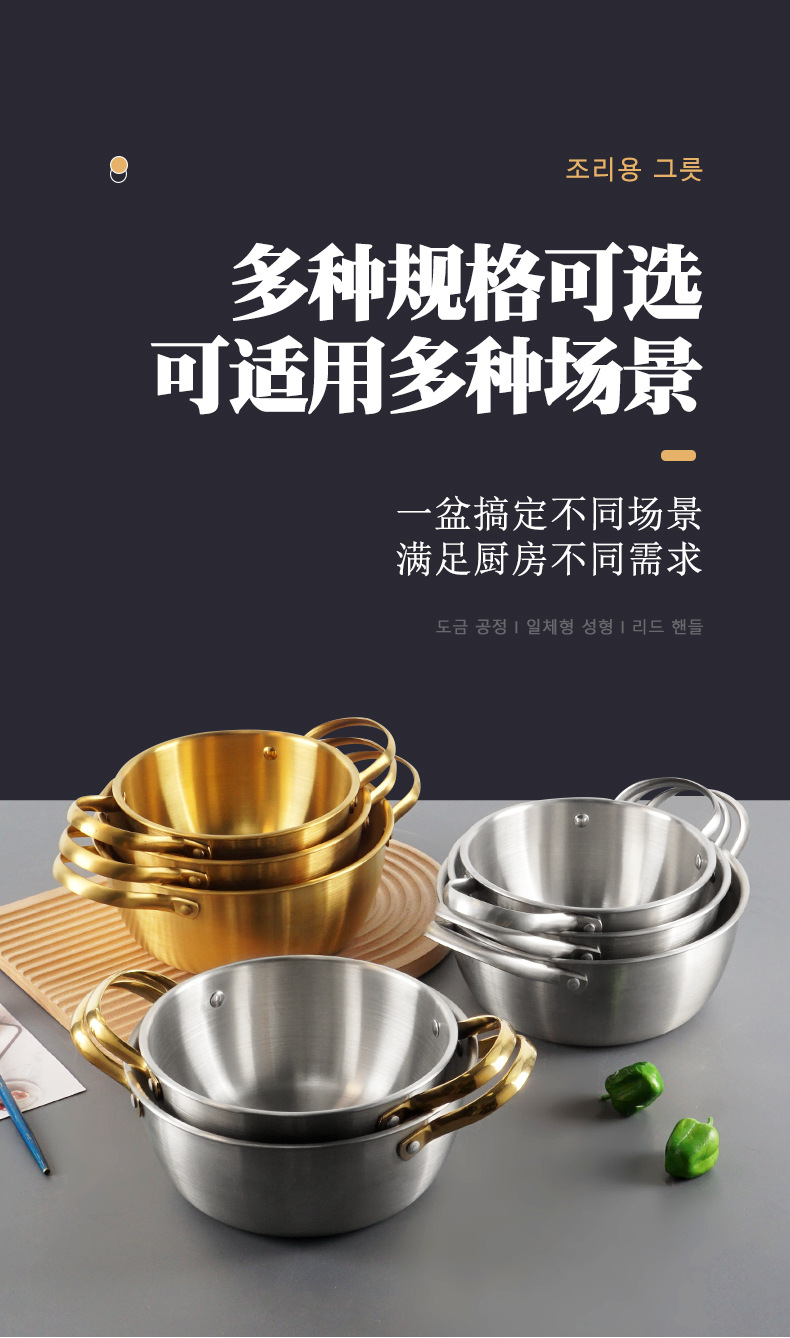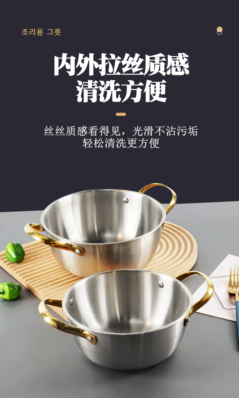 Taza de acero inoxidable coreana, platina de verduras doradas con un mango de fideos de dos orejas, platina seca de mariscos, una pequeña olla de cocción