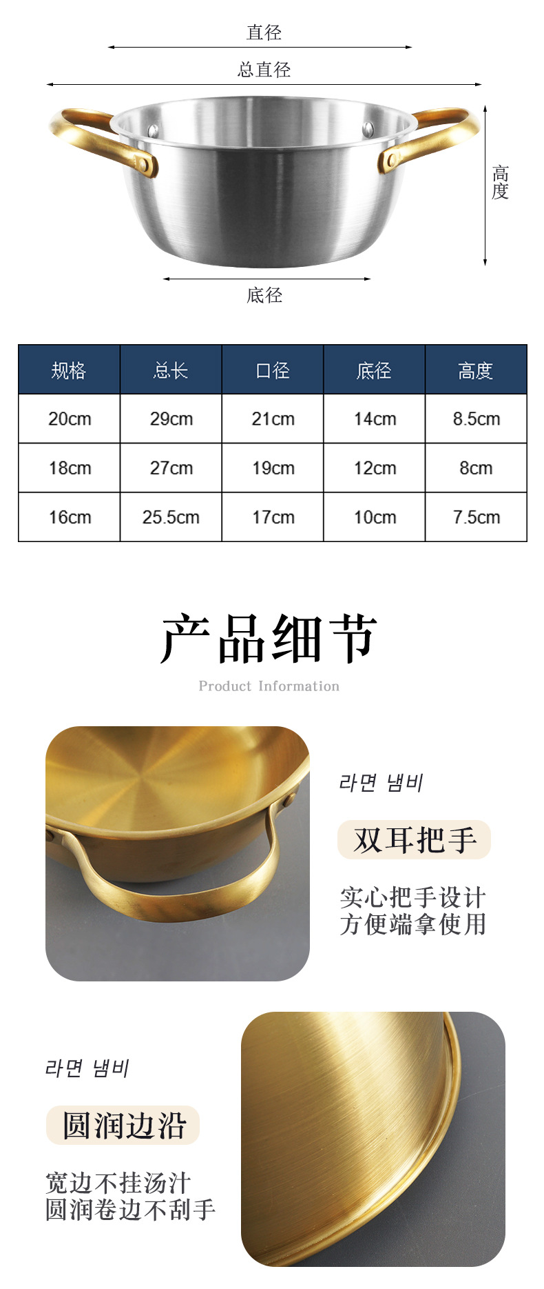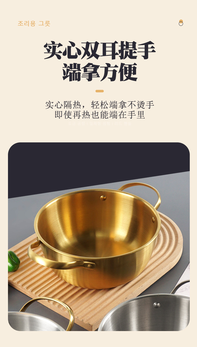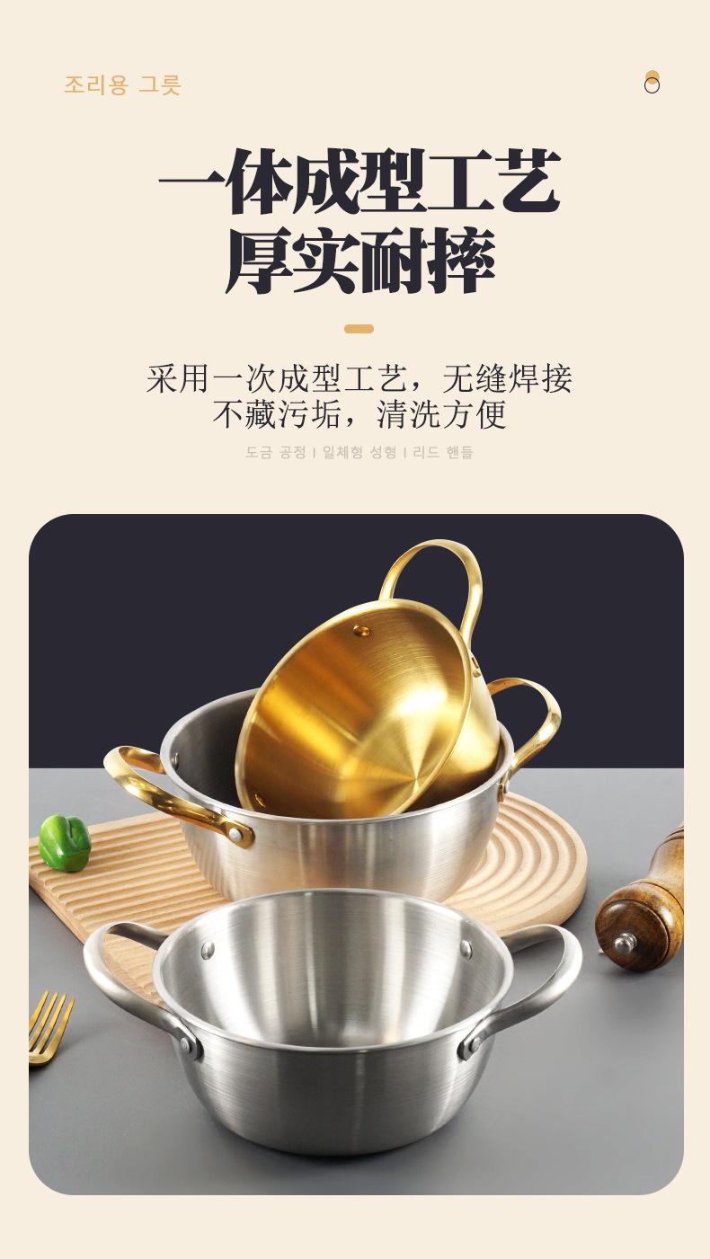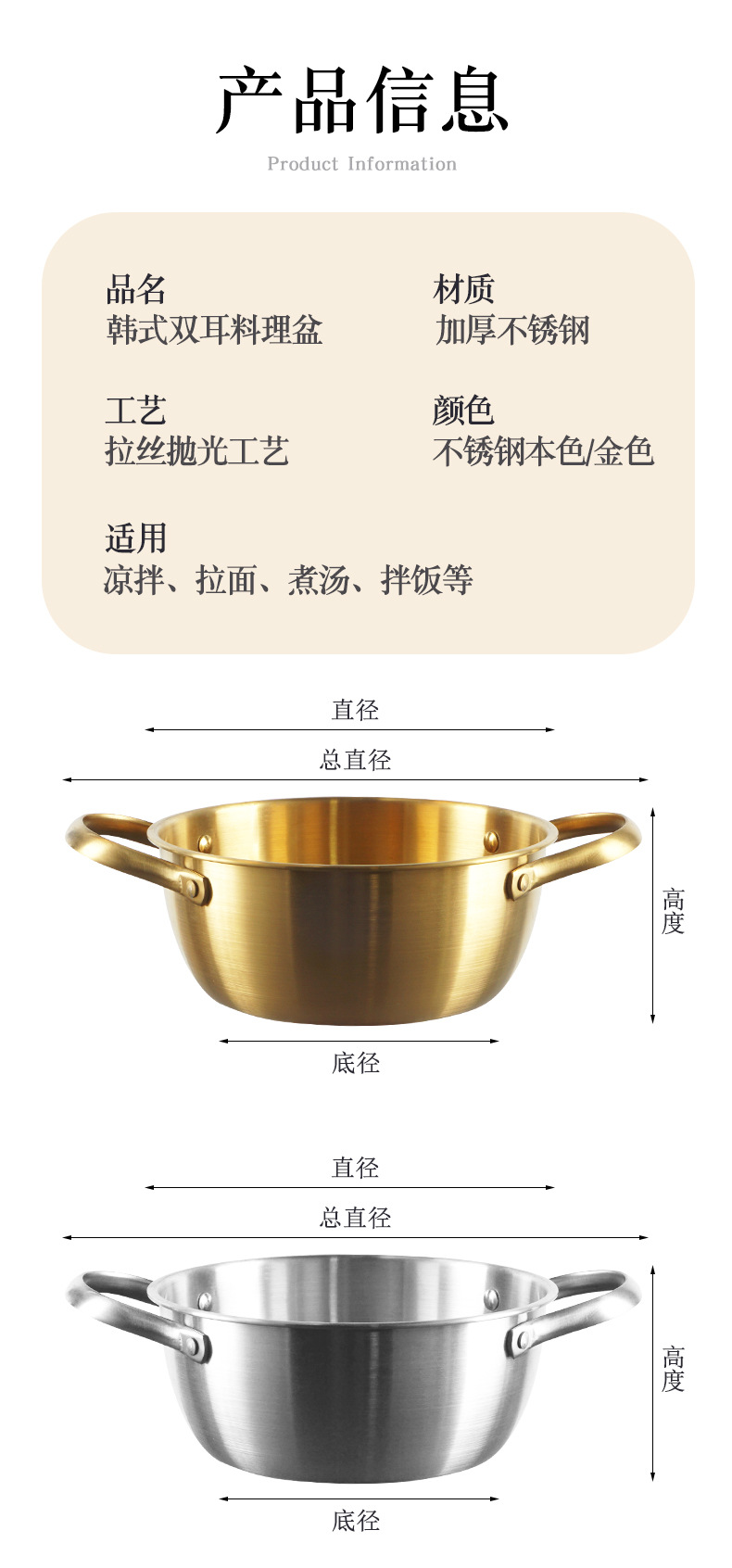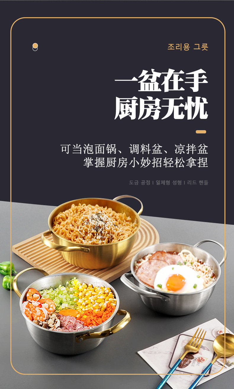 Taza de acero inoxidable coreana, platina de verduras doradas con un mango de fideos de dos orejas, platina seca de mariscos, una pequeña olla de cocción