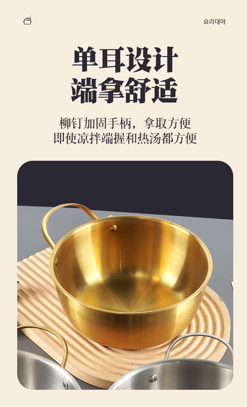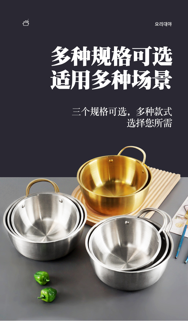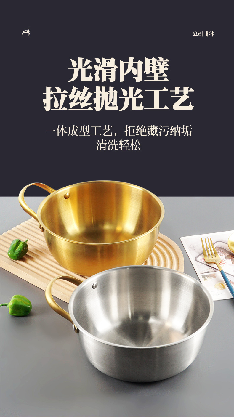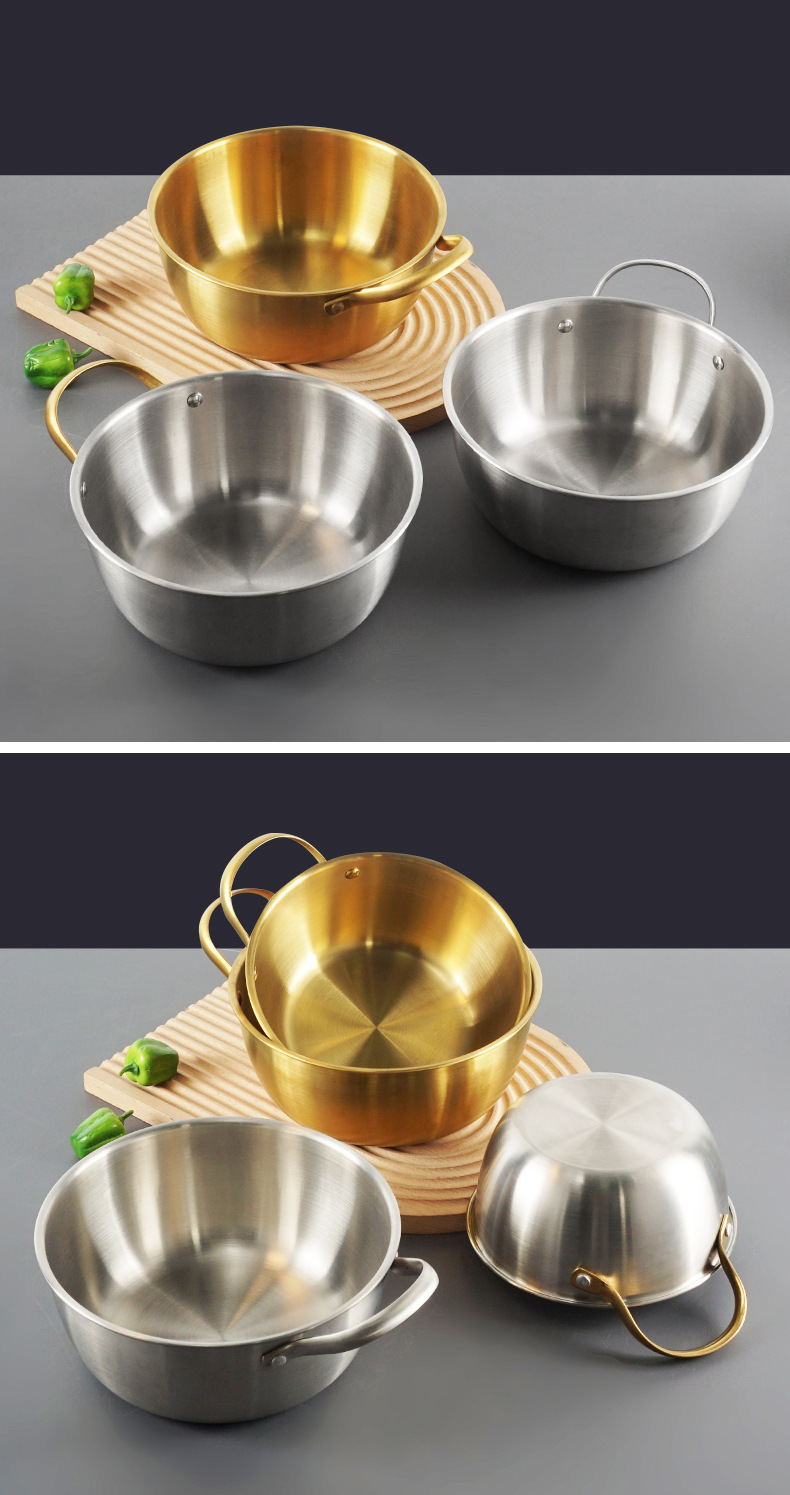 Taza de acero inoxidable coreana con mango, tazón de ensalada grueso, tazón de mezcla fría dorada, tazón de fideos creativo de olla caliente