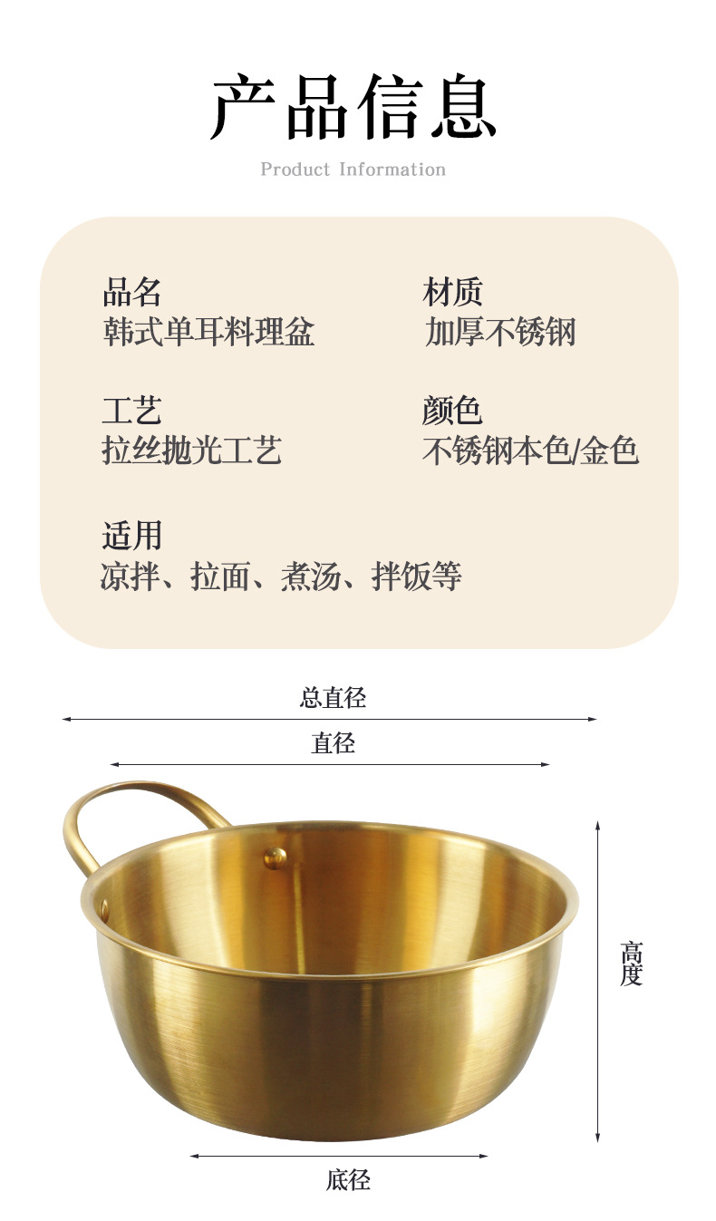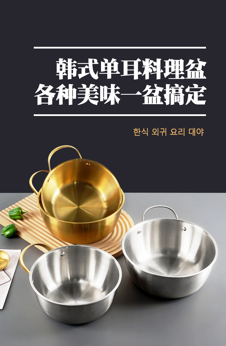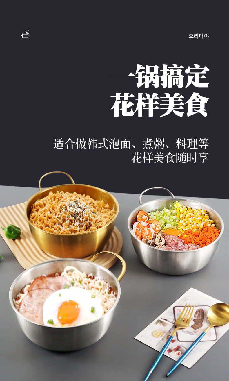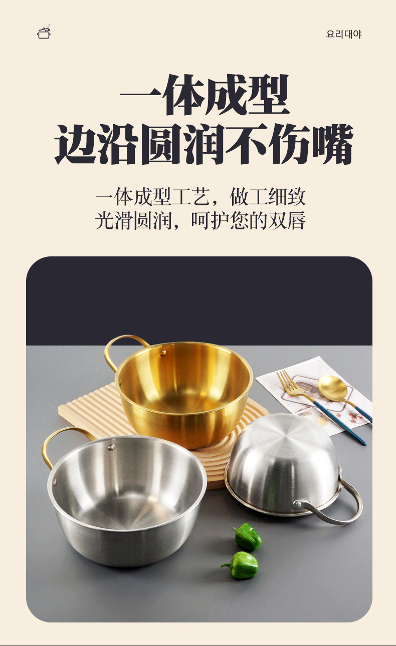 Taza de acero inoxidable coreana con mango, tazón de ensalada grueso, tazón de mezcla fría dorada, tazón de fideos creativo de olla caliente