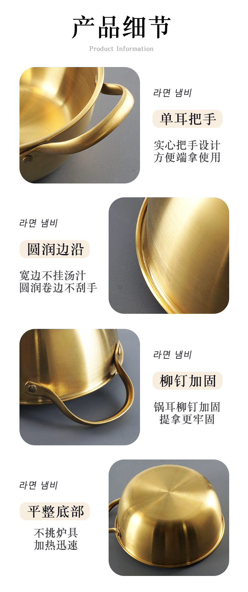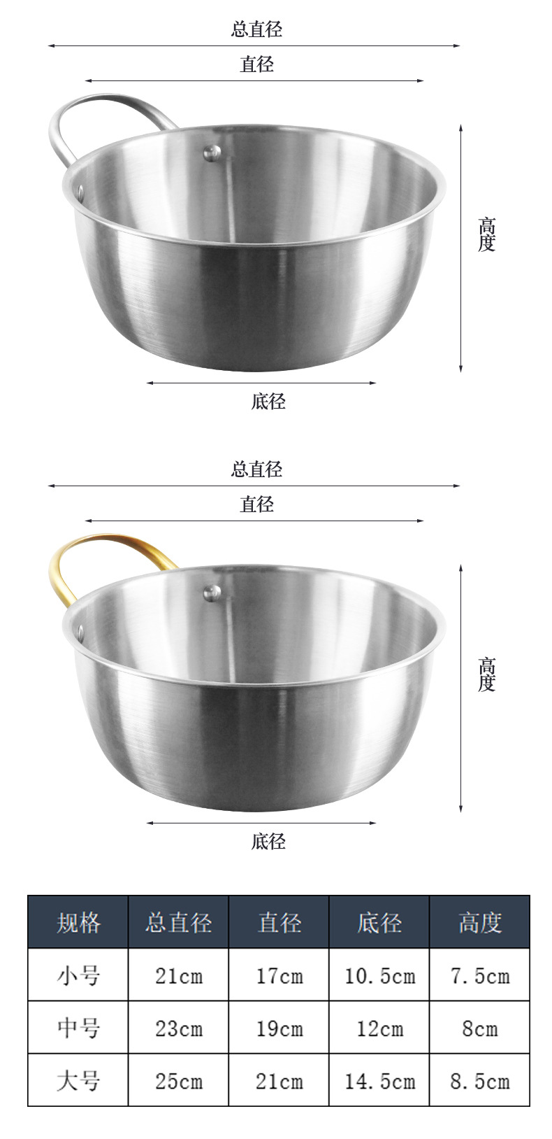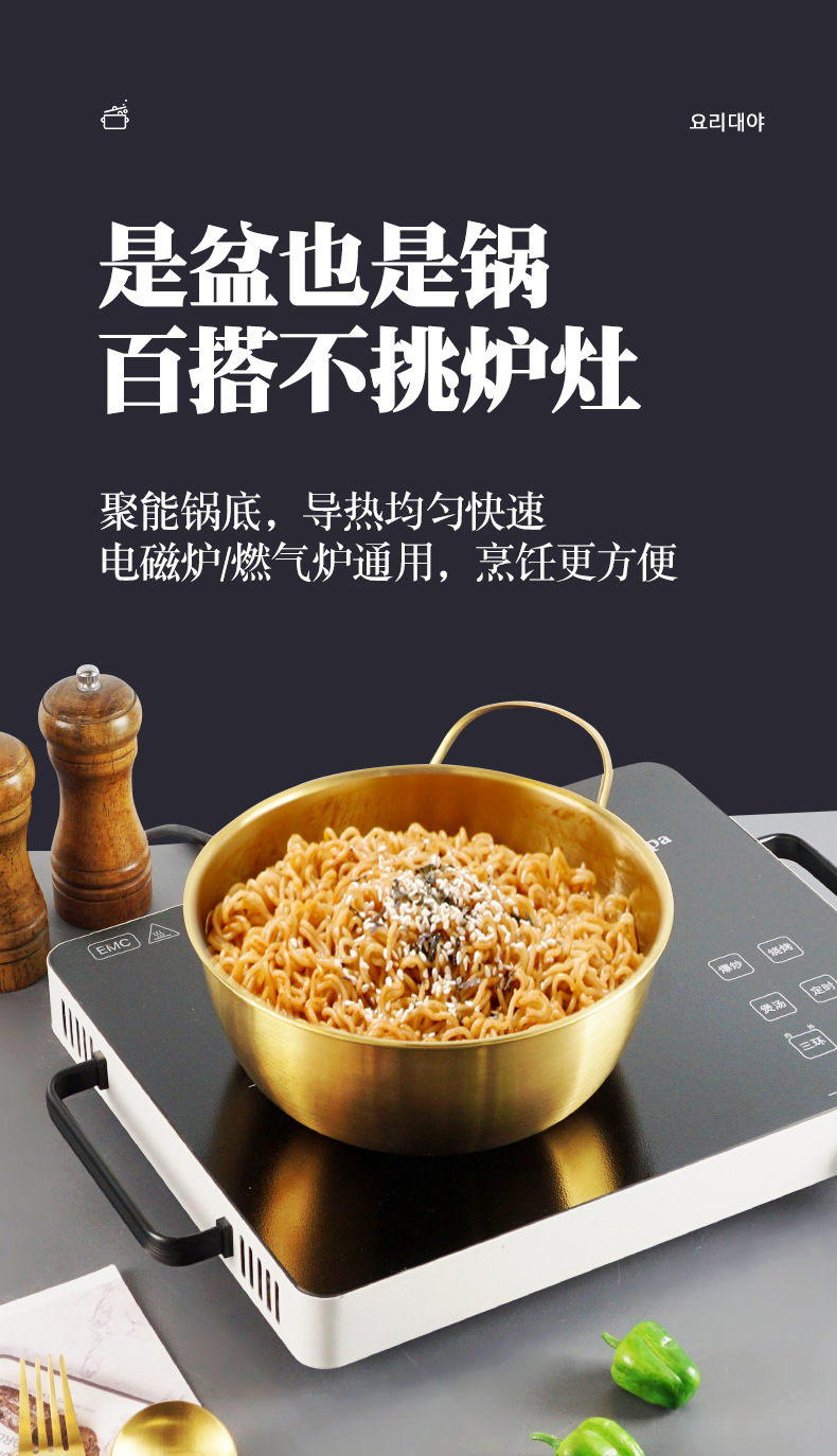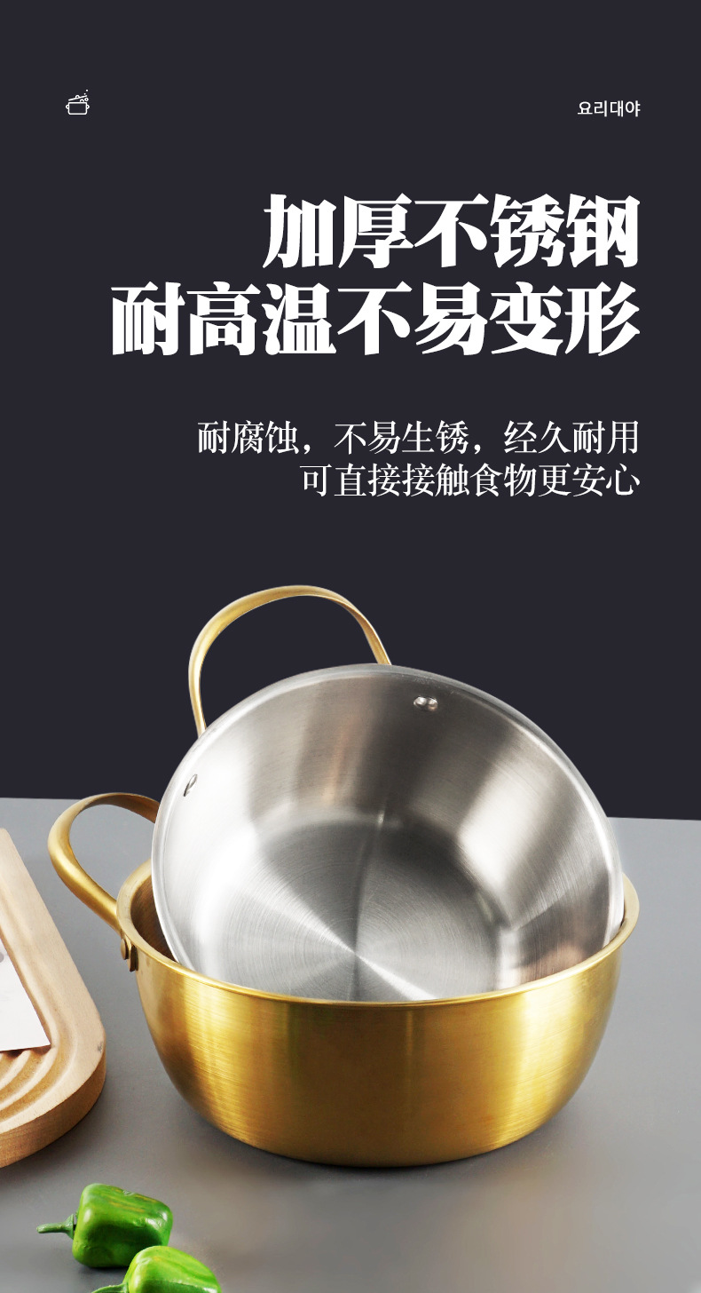 Taza de acero inoxidable coreana con mango, tazón de ensalada grueso, tazón de mezcla fría dorada, tazón de fideos creativo de olla caliente