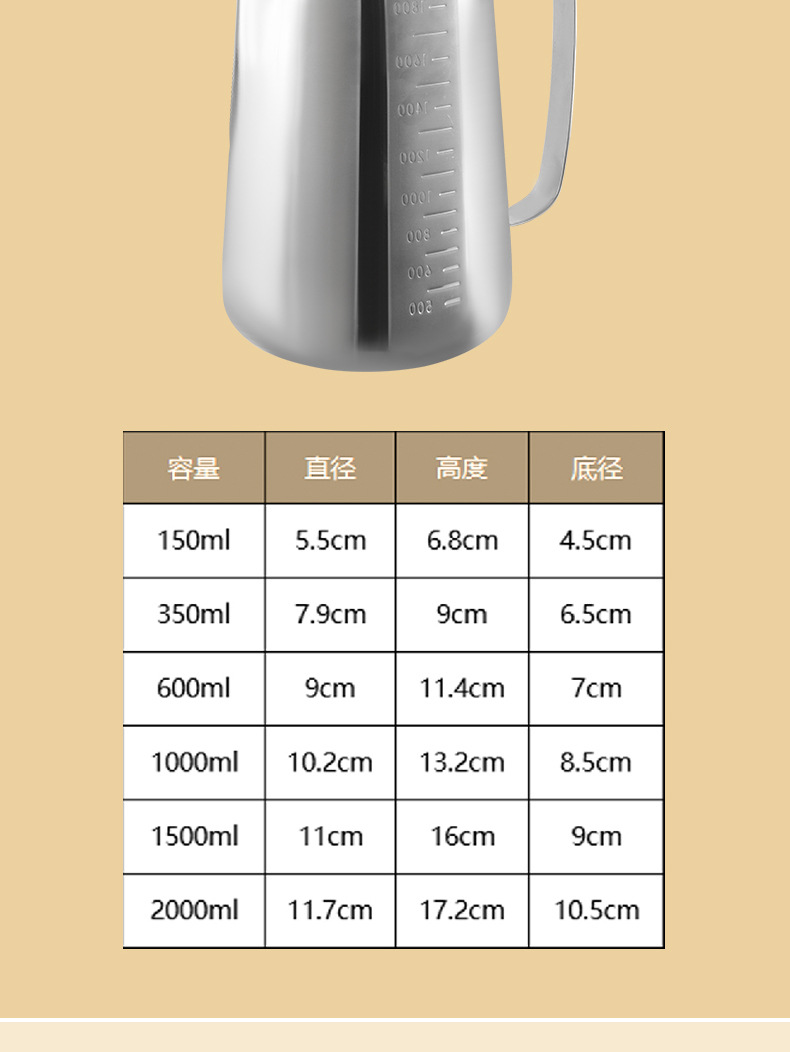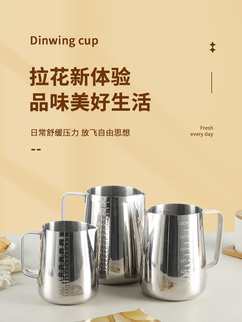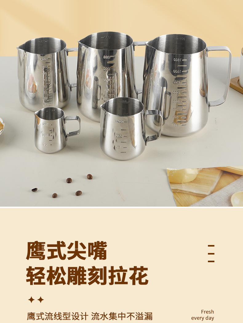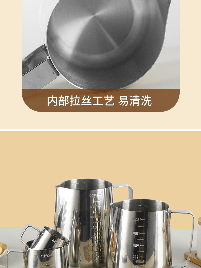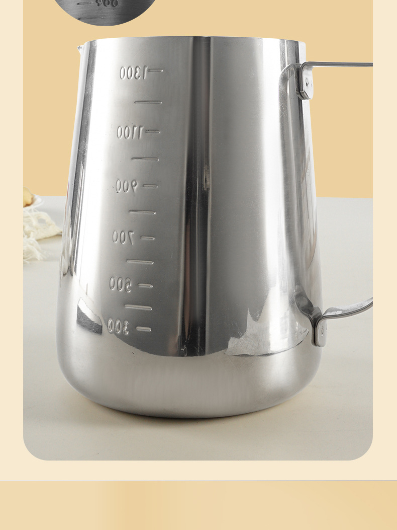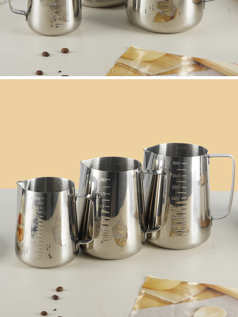 Taza de acero inoxidable con calibración interna y externa Taza de medición de café con punta gruesa Taza de extracción de leche con burbujas de leche Hervidor de leche
