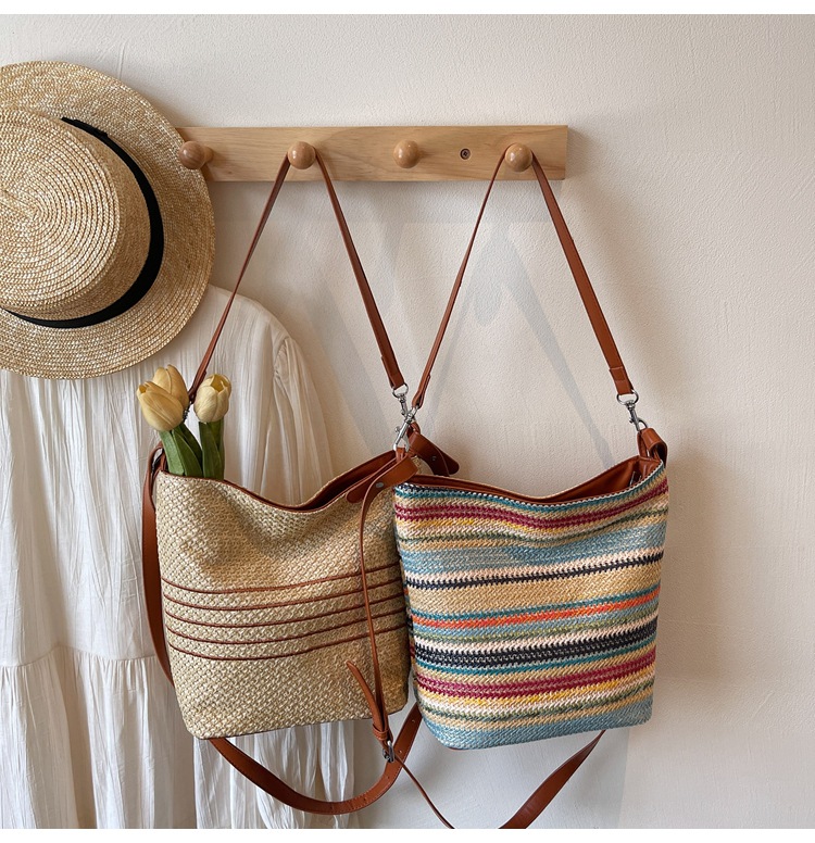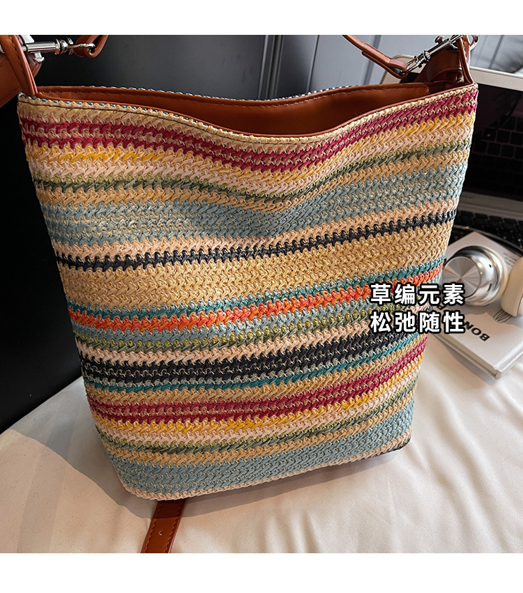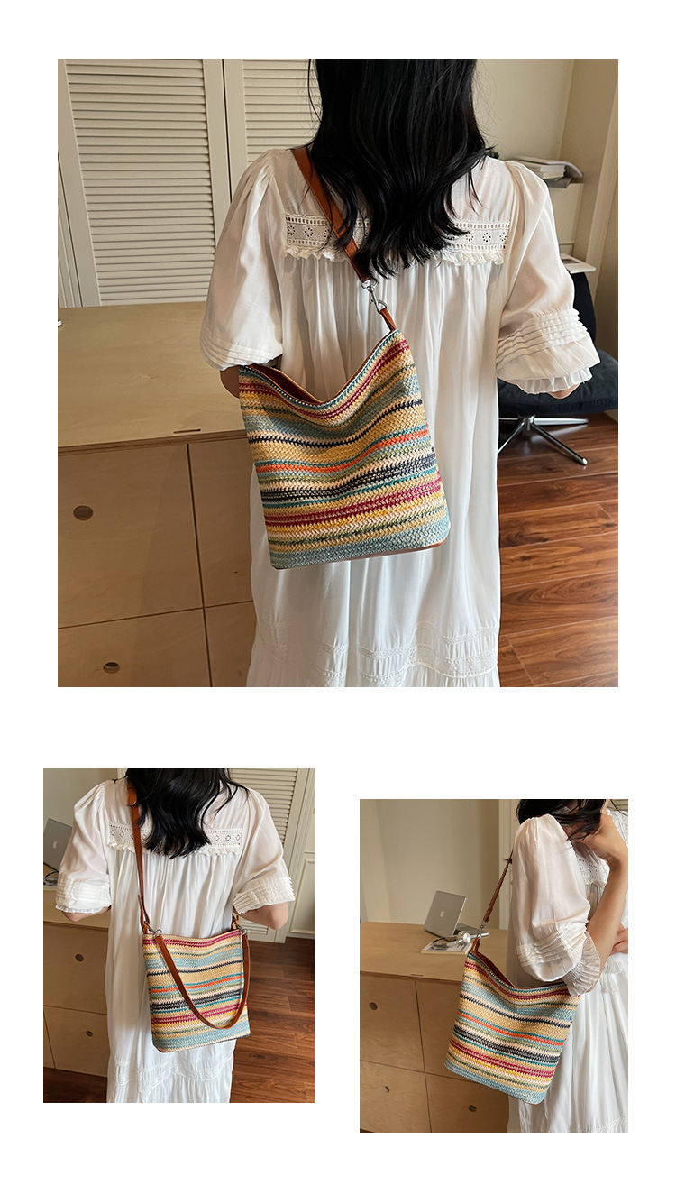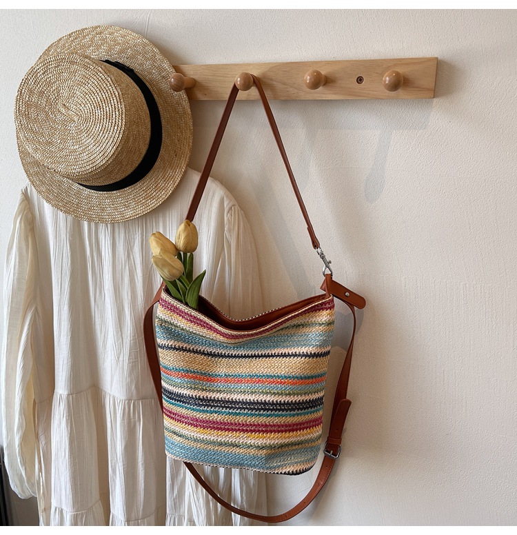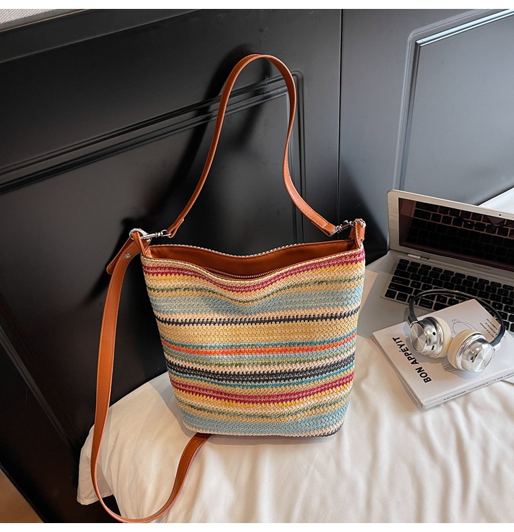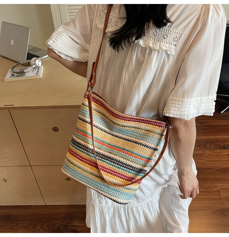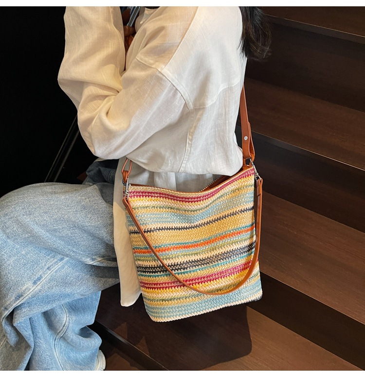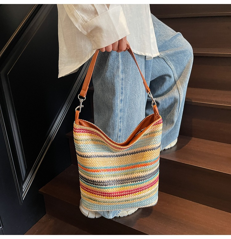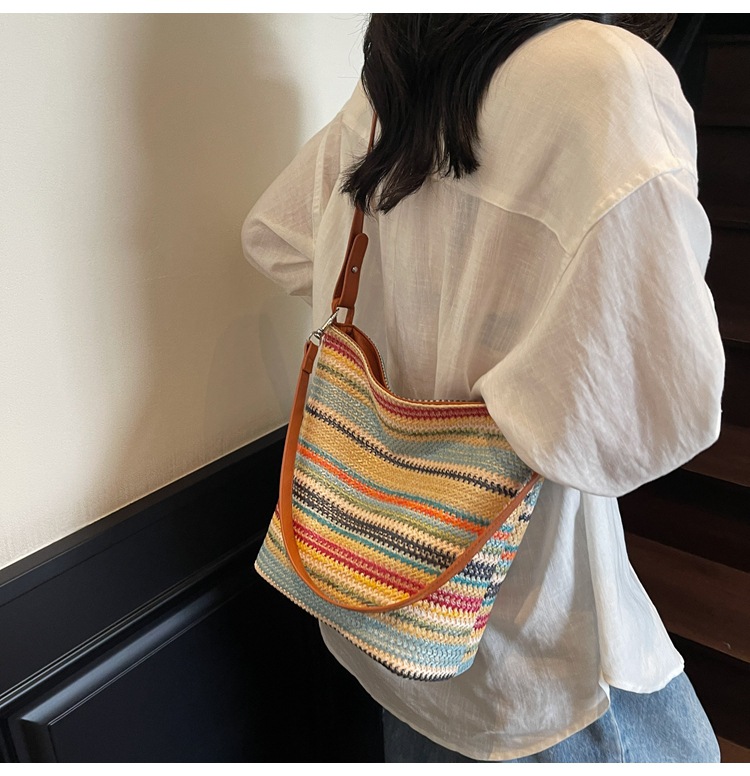 Bolso de axila de arcoíris tejido de moda de verano para mujer 2025 nuevo bolso de hombro de moda de estilo occidental bolso de cubo de mensajero de todo fósforo