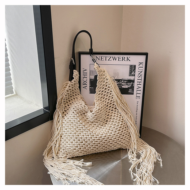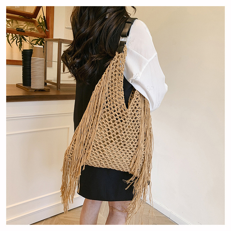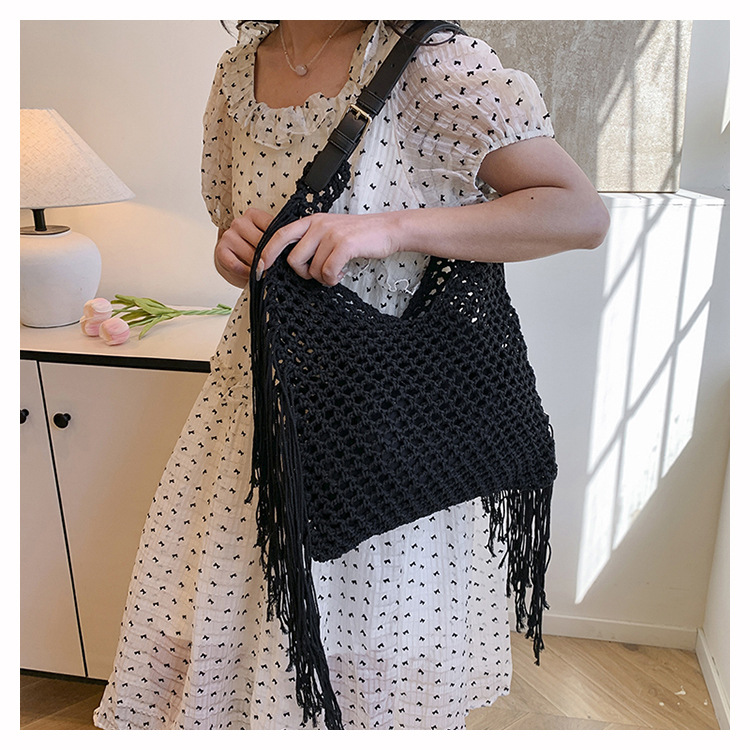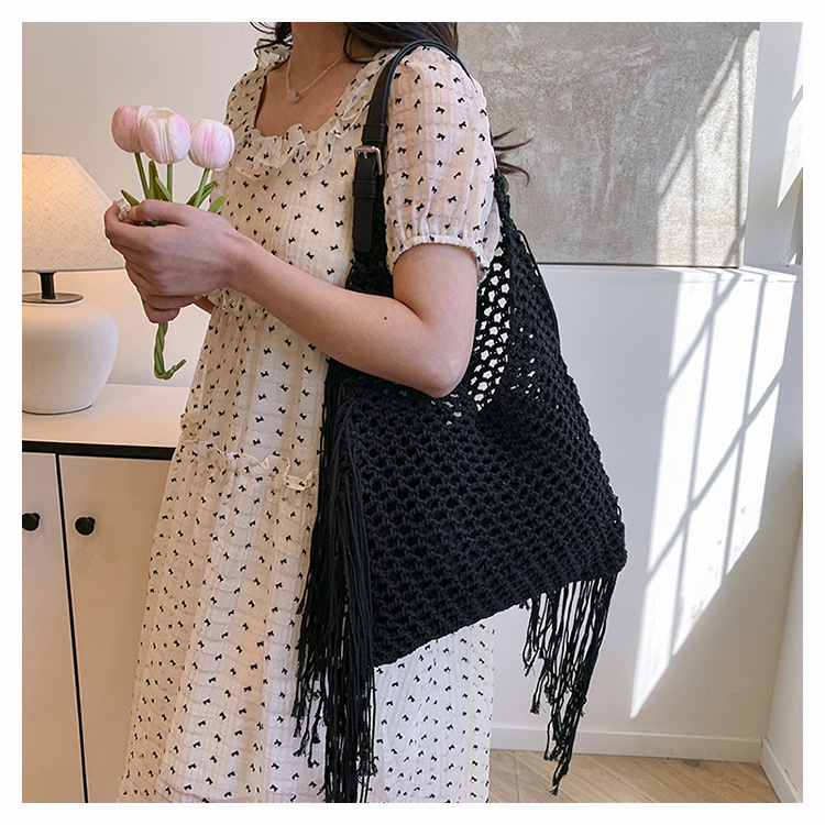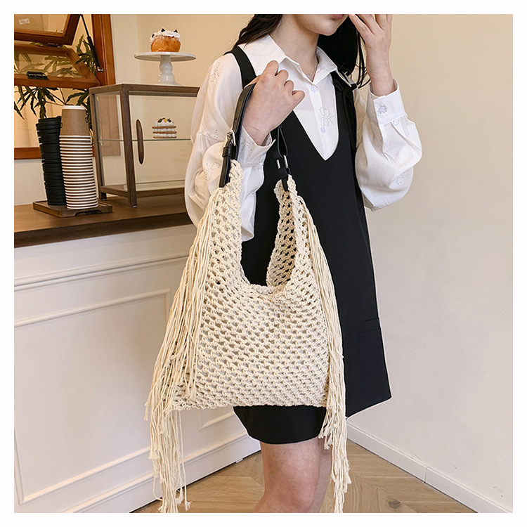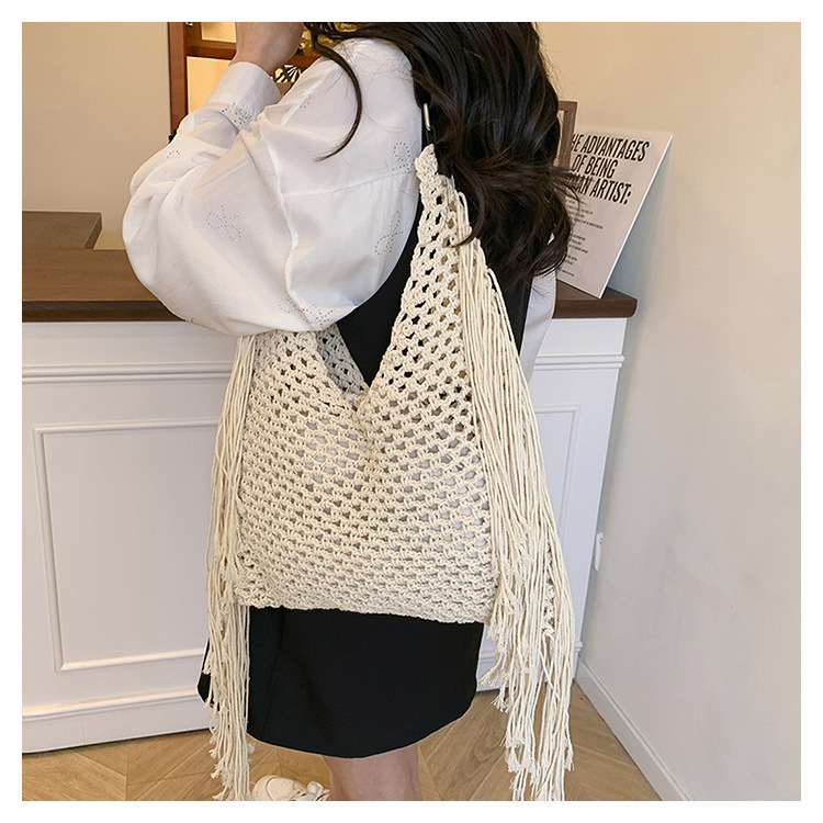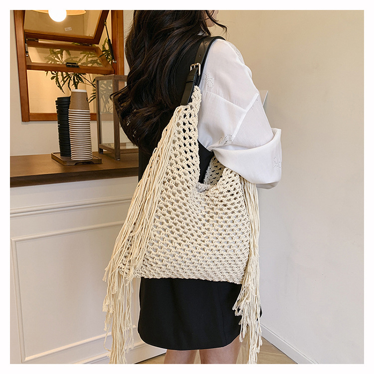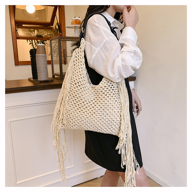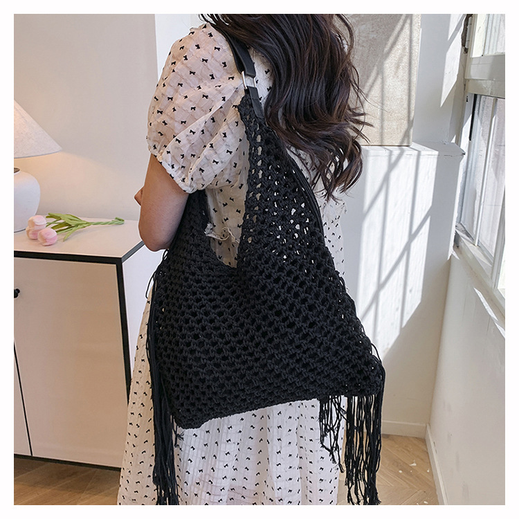 Bolso retro con borlas Bolso tejido a mano hueco femenino Bolso de playa Nuevo viajero Bolso Tote salvaje de un solo hombro para mujer